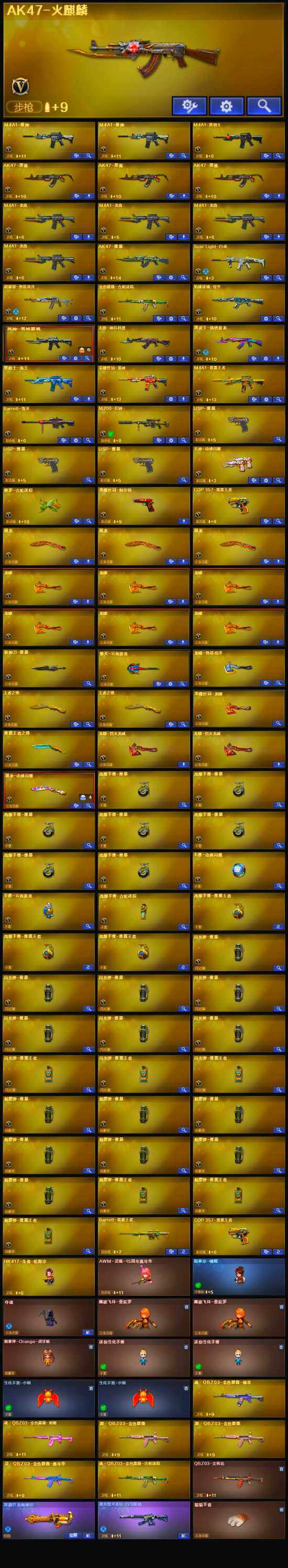 【英雄级武器】:AK47-雷暴,USP-雷暴*3,斩神刀-雷暴,荣耀世冠-雷神,荣耀世冠-柯尔特,荣耀世冠-龙啸,烈火-动感闪耀,天神-动感闪耀,屠龙-动感闪耀,手雷-动感闪耀,Scar Light-白虎,金色蔷薇-古蛇迷踪,无影-神兵利器,M4A1-雷神*2,M4A1-黑骑士,AK47-火麒麟,Barrett-毁灭,M4A1-龙血*4,M200-幻神,AK47-黑鲨*3,黑武士-锦绣游龙,黑骑士-海王,超新星-热带奇洋,死神-雪域霜狐,AWM-昌龙,M4A1-赤狱骑士,修罗-古蛇迷踪,龙啸*6,屠龙*3,擎天-云海游龙,龙啸-热带奇洋