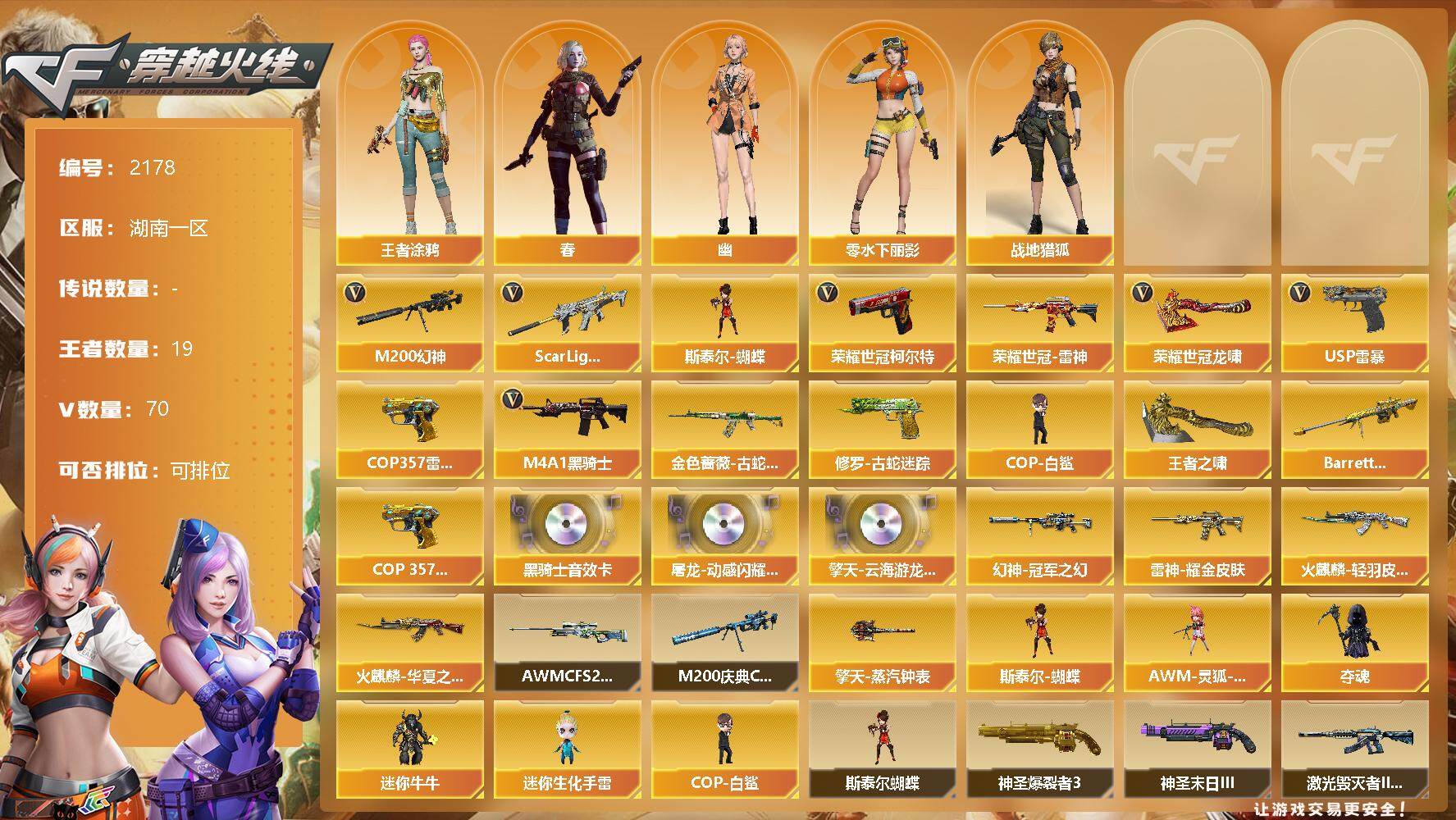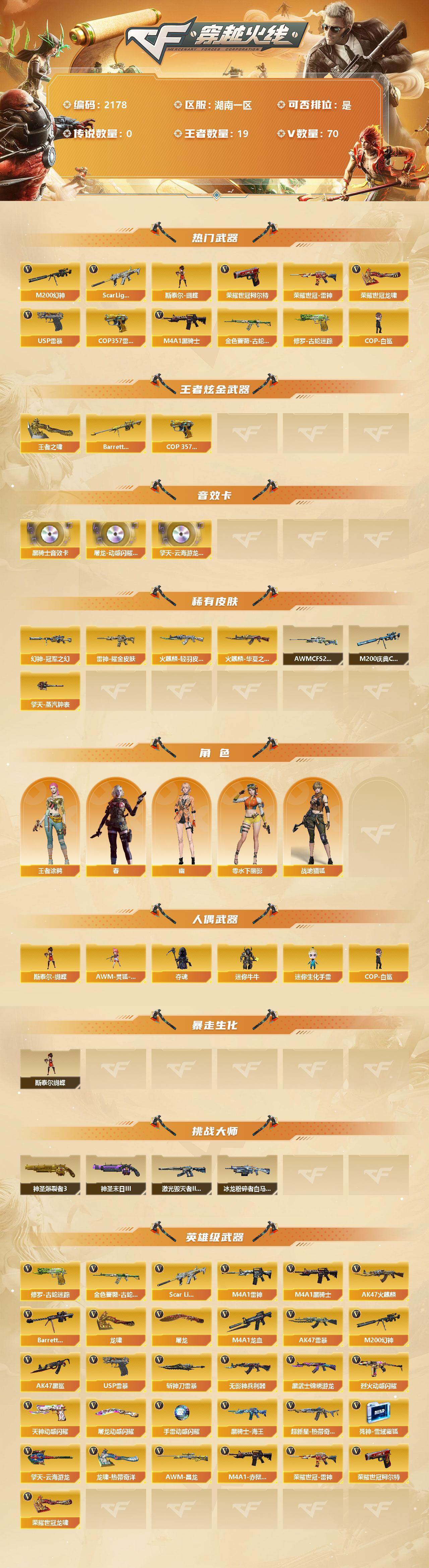[12250886]【商品标题】:湖南一区-70V-19王者-0炫金 【热门武器】:Scar Light-白虎,M200-幻神,金色蔷薇-古蛇迷踪,修罗-古蛇迷踪,荣耀世冠-雷神,荣耀世冠-柯尔特,M4A1-黑骑士,斯泰尔-蝴蝶,COP-白鲨,USP-雷暴*3,COP 357-雷霆王者,荣耀世冠-龙啸 【王者炫金武器】:Barrett-雷霆王者,COP 357-雷霆王者,王者之啸 【音效卡】:屠龙-动感闪耀 音效卡,擎天-云海游龙音效卡,M4A1-黑骑士音效卡 【稀有皮肤】:幻神-冠军之幻,雷神-耀金皮肤,火麒麟-华夏之心,火麒麟-轻羽皮肤*2,M200-庆典-CFS 2021,AWM-CFS 2020,擎天-蒸汽钟表 皮肤 【角色】:王者涂鸦,零-水下丽影,春,幽,战地猎狐 【人偶武器】:COP-白鲨,斯泰尔-蝴蝶,AWM-灵狐-15周年嘉年华,夺魂,迷你牛牛,迷你生化手雷*2 【暴走生化】:斯泰尔-蝴蝶 【挑战大师】:神圣爆裂者III,神圣爆裂者-末日III,激光毁灭者III-白马银枪,冰龙粉碎者-白马银枪*2 【英雄级武器】:AK47-雷暴,USP-雷暴*3,斩神刀-雷暴,荣耀世冠-雷神,荣耀世冠-柯尔特,荣耀世冠-龙啸,烈火-动感闪耀,天神-动感闪耀,屠龙-动感闪耀,手雷-动感闪耀,Scar Light-白虎,金色蔷薇-古蛇迷踪,无影-神兵利器,M4A1-雷神*2,M4A1-黑骑士,AK47-火麒麟,Barrett-毁灭,M4A1-龙血*4,M200-幻神,AK47-黑鲨*3,黑武士-锦绣游龙,黑骑士-海王,超新星-热带奇洋,死神-雪域霜狐,AWM-昌龙,M4A1-赤狱骑士,修罗-古蛇迷踪,龙啸*6,屠龙*3,擎天-云海游龙,龙啸-热带奇洋 【特殊枪械】:蝴蝶斯泰尔+0烈龙,1白虎,1黑骑士,1蝴蝶斯泰尔