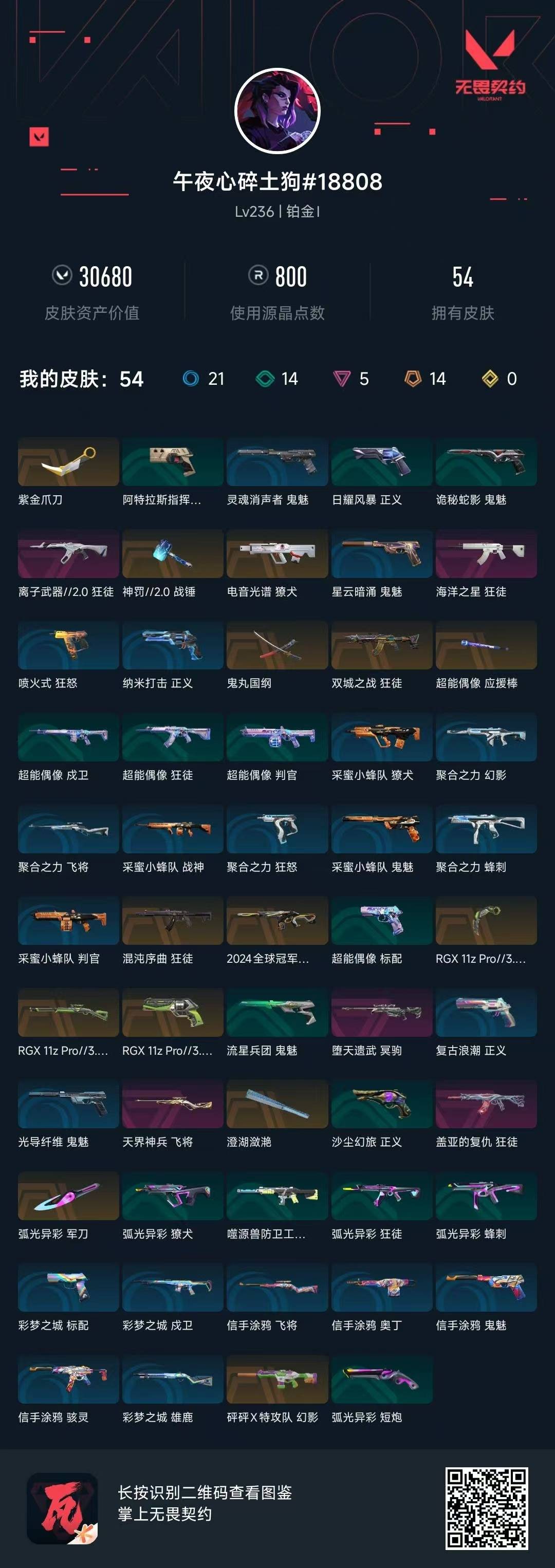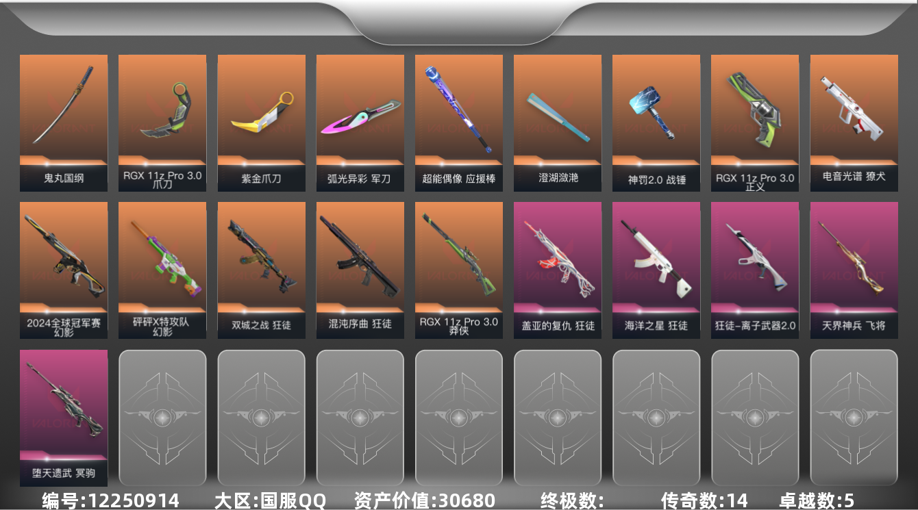 [12250914]14橙皮 5紫皮 54皮肤 27英雄 119卡面 800已用源晶 铂金 优质装备:RGX 11z Pro//3.0套装,幻影-2024全球冠军赛,狂徒-混沌序曲,幻影-砰砰X特攻队,狂徒-盖亚的复仇,冥驹-堕天遗武,正义-RGX 11z Pro 3.0,澄湖潋滟,飞将-天界神兵,紫金爪刀,爪刀-RGX 11z Pro 3.0,鬼丸国纲,神罚2.0 战锤 步枪皮肤:狂徒-双城之战,獠犬-电音光谱,狂徒-离子武器2.0,狂徒-海洋之星 狙击枪皮肤:莽侠-RGX 11z Pro 3.0 近战武器皮肤:超能偶像 应援棒,军刀-弧光异彩