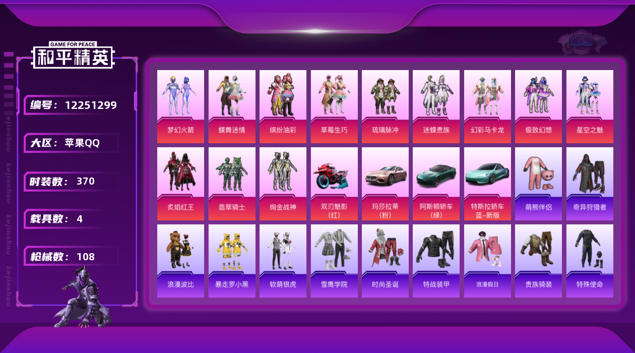 [12251299]12粉装 4载具 6印记 可二次 可修改实名 战神框 身法装备:暗影哥特(红眼罩) 优质装备:玛莎拉蒂Ghibli(粉),阿斯顿·马丁DBS(绿),特斯拉Roadster(水滴蓝),奇异狩猎者,梦幻火箭(新101)(新火箭少女101粉色套装),蝶舞迷情,缤纷油彩(猪妹猪脸妹),幻彩马卡龙,绚金战神,翡翠骑士,极致幻想,草莓生巧,炙焰红王,迷蝶贵族,琉璃脉冲,星空之魅 热门装扮:软萌银虎,暴走罗小黑,浪漫波比,萌熊伴侣 载具:双人摩托-双刃魅影(红) 紫色装扮:极速光影,SS31特训套装,云朵鹅,浪漫假日,雪绒豹,SS33特训套装,夏日音浪,千禧之恋,幻影武者,冰川特警,迅捷之星,科技之星,SS14特训,时尚圣诞,飞行日记,魅力单车,风暴特警,青涩年华,雪鹰学院,霓虹街区,牛气冲天,牛气满满,特战装甲,特殊使命,浪漫樱花,特训学院,甜蜜熊情侣,甜蜜菠萝,破蛋小黄鸡,神秘领域,治愈之星,冰爽海盐,暗影哥特(红眼罩),异域银装,迷域探索者,精神漫游,SS7特训,深蓝冒险家,SS8特训,顽皮玉兔,PEL摇滚竞梦者,众神之王,智慧之神,SS9特训,银河圣歌,白月香洋装,玲珑飞花,风华少年志,SS10特训,萌主吾皇,白虎圣者,原初圣火,逆风勇士,SS12特训,梦之呓语,韶华初心,抹茶蜜豆,薄荷蓝莓,静谧青瓷,镭射皇者,闪金天王,银白舞王,SS13特训,朱雀圣者,青龙圣者,纯白誓言,暗夜契约,神奈川冲浪里,驯鹿叮当,机械英豪,机械征服者,SS11特训,耀粉歌者,海洋之心,本愿之火,辉星之火,蓝甜马卡龙,丝绸行者,神秘舞者,大橘大利,小鸟芋圆,SS32特训服(SS32特训套装),海上生明月,丛林猎人,童话森林,深山诡影,金耀舞者,蓝调潮人,贵族骑装 优质战备:时光之吻降落伞,幻星舰长飞行器,春暖花开降落伞,梦幻火箭降落伞,梦幻火箭飞行器,神秘黑猫降落伞,繁花小夜曲降落伞,甜蜜誓约降落伞,飞行器-心之恋语(心之恋语飞行翼),马卡龙降落伞,潮汐统领降落伞,锦绣火鲤降落伞,夏日绵绵冰降落伞,飞行器-夏日绵绵冰,阿狸红降落伞,四圣焕新降落伞,飞行器-四圣焕新,香水柠檬降落伞,童趣迷兔降落伞