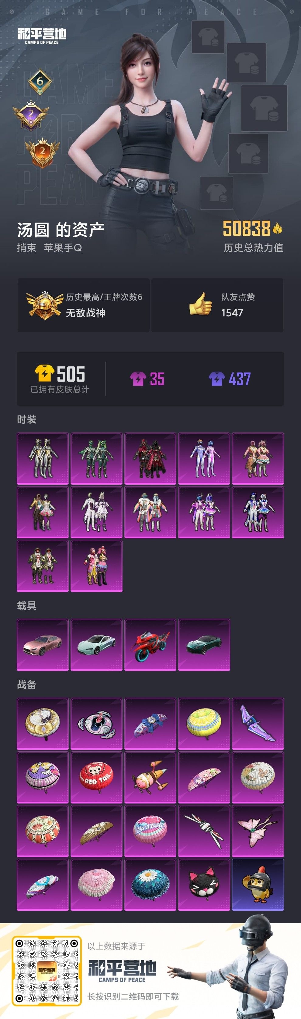 - PX_2071564-苹果QQ 历史总热力值:126435 红装数量:1 粉装数量:11 特效枪数量:15 载具数量:3 王牌印记:17 历史最高段位:无敌战神 套装数量:263 时装数量:1051 枪械数量:340 战备数量:241 装备数量:434 载具:仰望U7(阿盖尔紫),兰博基尼Aventador SVJ(翡翠绿),晶梦灵驹 时装:沙丘之主-图卡盟(5级),套装-星之彼岸,套装-碧影闪光