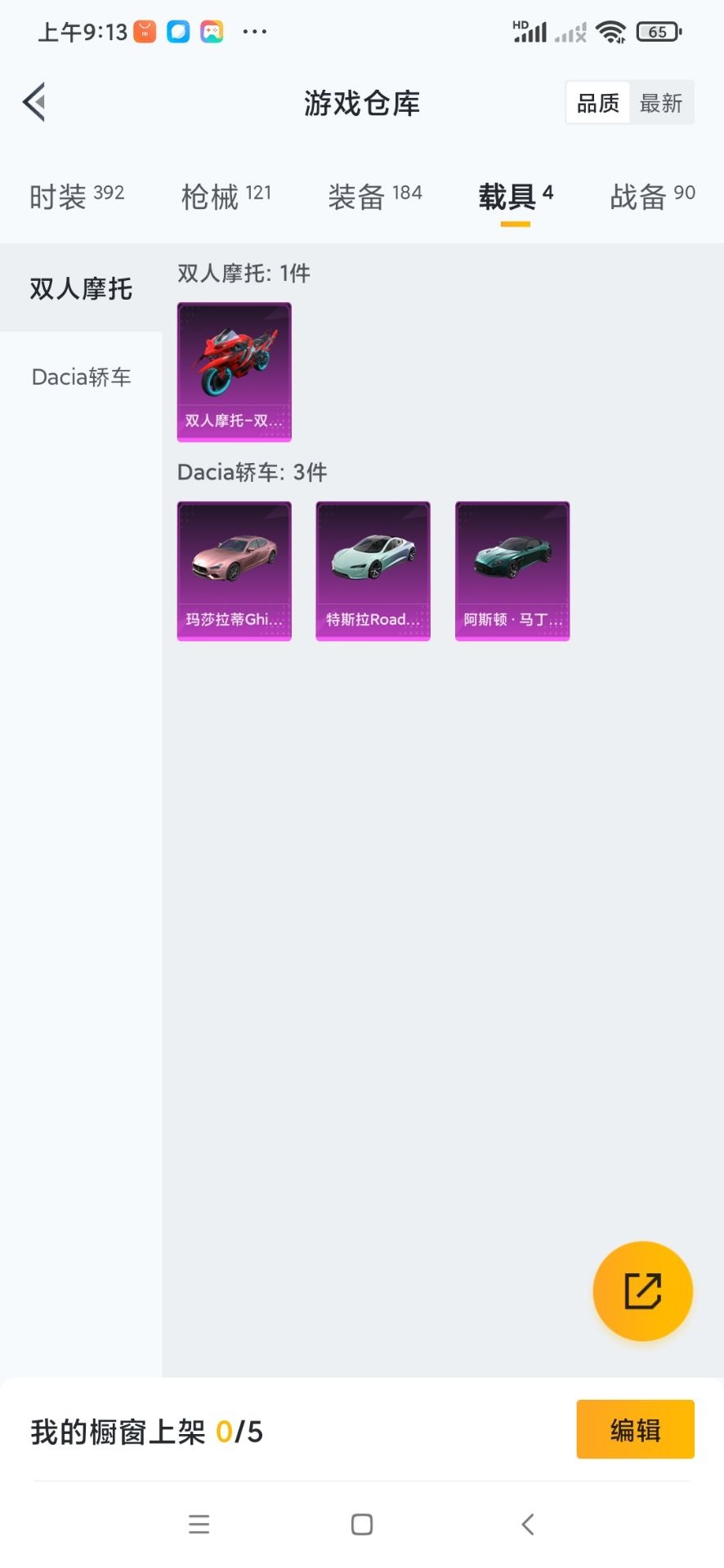 双人摩托-双刃魅影(红),玛莎拉蒂Ghibli(粉),阿斯顿·马丁DBS(绿),特斯拉Roadster(水滴蓝)