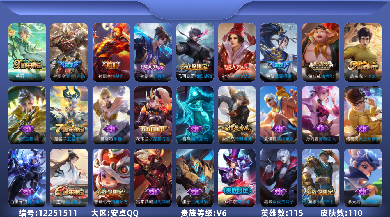 - PX_2097203-实名: 可修改 性别: 男号 贵族等级: V10 英雄数: 121 皮肤数: 235 荣耀水晶: 武则天,天鹅之梦,星空梦想,倪克斯神谕,无限飓风号,活力突击,杀手不太冷,鸣剑·曳影,全息碎影,银白咏叹调 星传说: 幽冥之眼,金色仲夏夜 传说皮: 黄金射手座,一念神魔,云霓雀翎,仲夏夜之梦,海洋之心,地狱之眼,飞鸢探春,胖达荣荣,游龙清影,淬星耀世,超时空战士-狄仁杰,山海·