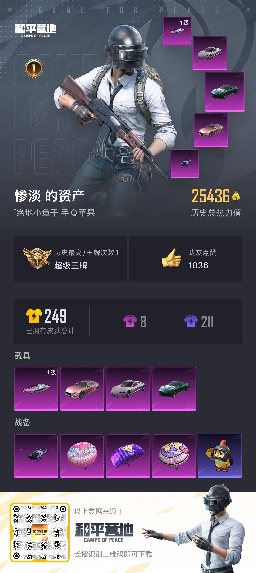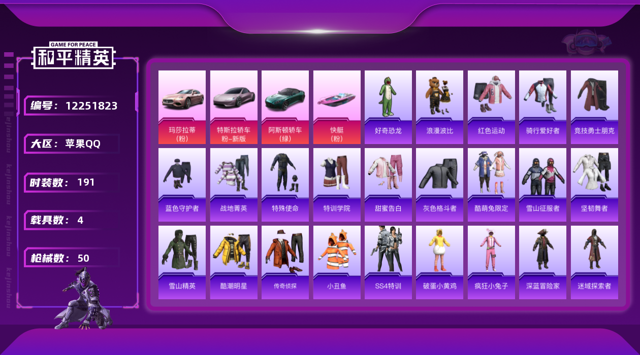 [12251823]4载具 1印记 可二次 可修改实名 优质装备:玛莎拉蒂Ghibli(粉),阿斯顿·马丁DBS(绿),特斯拉Roadster(沁心粉) 热门装扮:浪漫波比,好奇恐龙 载具:空客H135-蔚蓝之翼,快艇-塞莎KL27(霓虹粉) 紫色装扮:北国孤狼,圣诞大吉,坚韧舞者,凛冬战士,SS4特训,SS5特训,科技之星,SS14特训,SS15特训,战地菁英,骑行爱好者,金鼠迎春,酷潮明星,酷萌兔限定,阳光火鸡,雪山征服者,雪山精英,霓虹街区,灰色格斗者,熔岩使者,牛气冲天,牛气满满,特殊使命,特训学院,跃动心情,红色运动,蓝色守护者,甜蜜告白,疯狂小兔子,破蛋小黄鸡,竞技勇士朋克,治愈之星,小丑鱼,迷域探索者,SS7特训,深蓝冒险家,SS8特训,SS9特训,星光纪元,淡雅花蕊,SS6特训,赛博空间,SS10特训,萌主吾皇,原初圣火,初火先锋,逆风勇士,SS12特训,耀粉歌者,蓝甜马卡龙,传奇侦探,玫瑰恋情 优质战备:梦幻火箭降落伞,天启纪元降落伞,马卡龙降落伞