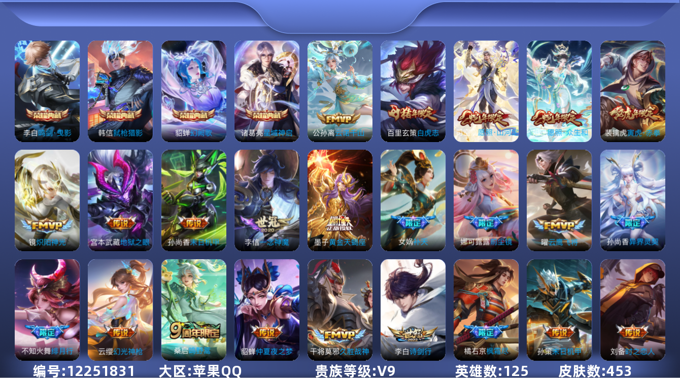 [12251831]V9 4典藏 36传说 125英雄 453皮肤 可修改实名 优质装备:鸣剑·曳影,星域神启(倪克斯贼亮),幻阙歌(貂蝉典藏),弑枪猎影(韩信典藏),云鹰飞将(小将军),绛天战甲(鸡嘴战神),黄金白羊座,久胜战神,炽阳神光,一念神魔,末日机甲-孙尚香(绿蚂蚱),地狱火,仲夏夜之梦(大飞蛾),地狱之眼,飞鸢探春,胖达荣荣,时之恋人-刘备(电焊工),淬星耀世,超时空战士-狄仁杰,末日机甲-孙策,碎云,炽翼辉光(娃娃菜牛角包),电玩·雷克斯,妄想实况,黄金天蝎座,涂山容容 传说皮:云诺千山,幻光神枪 珍宝阁皮:妄想食味,万物之道,优雅恋人,玩趣恶龙 限定皮:愿照·山河定(司空震年限),愿照·众生和(妲己年限),逐霄战戟,鸣野蒿,至尊宝,白虎志(电光耗子),异界灵契(白毛香),傲雪梅枪,补天,前尘镜,绯月行,神威(电光马子),飞衡(韩信年限),遇见飞天,高山流水,诗剑行,五谷丰年,幽恒(沐浴露),游园惊梦,梁祝,御风骁将(吕布年限),龙胆,岱宗(典韦年限),李小龙,辉光之辰,霸王别姬-虞姬,默契交锋-花木兰,孙行者,一生所爱,神奇女侠,匿光追影者,寅虎·御盾(廉颇年限),寅虎·心曲(虎婆),寅虎·赤拳(老虎年限),百木心枪,玉兔公主,启示之音,唐三藏,枫霜尽,时之奇旅-妲己,神器·万象笔 史诗皮:鸭鸭历险记-刘禅,器灵·浮梦炉,狼魂孤将,化蝶舞,灵蛊蚀心,星界战将,谪仙醉月,龙之律动,雪豹·霜爪,石田雨龙,百相守梦-周瑜,茶境仙,破空之剑,东方月初,蔬乡物语(鲁班七号),百相守梦-百里守约,百相守梦-黄忠,紫霞仙子,苍穹之光,电玩小子(小书包),黄金分割率,特工魅影,千年之狐,永昼,江河有灵,末日机甲-莱西奥,鹤归松栖(赵怀真),雪夜绮愿(周瑜),百解令(蒙犽),高渐离燃音魔法,蒙恬荣光圣徽,无限星赏官,冰冠公主,青蛇,偶像歌手,白蛇,晚萤,电玩·爆裂旋风,暗夜猫娘,百相守梦(关羽),龙骑士(小龙虾),末日机甲-吕布,猫狗日记-孙策,猫狗日记-大乔,时之恋人-孙尚香,乱世虎臣,节奏热浪,修罗,女仆咖啡,摇滚巨星,水果甜心,绅士熊喵,天才门将,星夜王子,心灵骇客,功夫厨神,德古拉伯爵,暗隐猎兽者,幽灵船长,鬼剑武藏,暗渊魔法,心灵战警,乐园奇幻夜,舞动绿茵,地狱岩魂,诗语江南,纤云弄巧,繁星吟游(呼啦呼啦),拒霜思,缤纷独角兽,乘风破浪,逐浪之夏,月团寄思,水晶猎龙者,曙光守