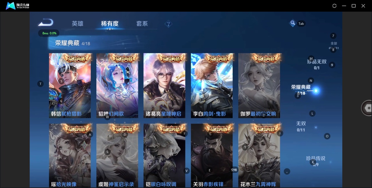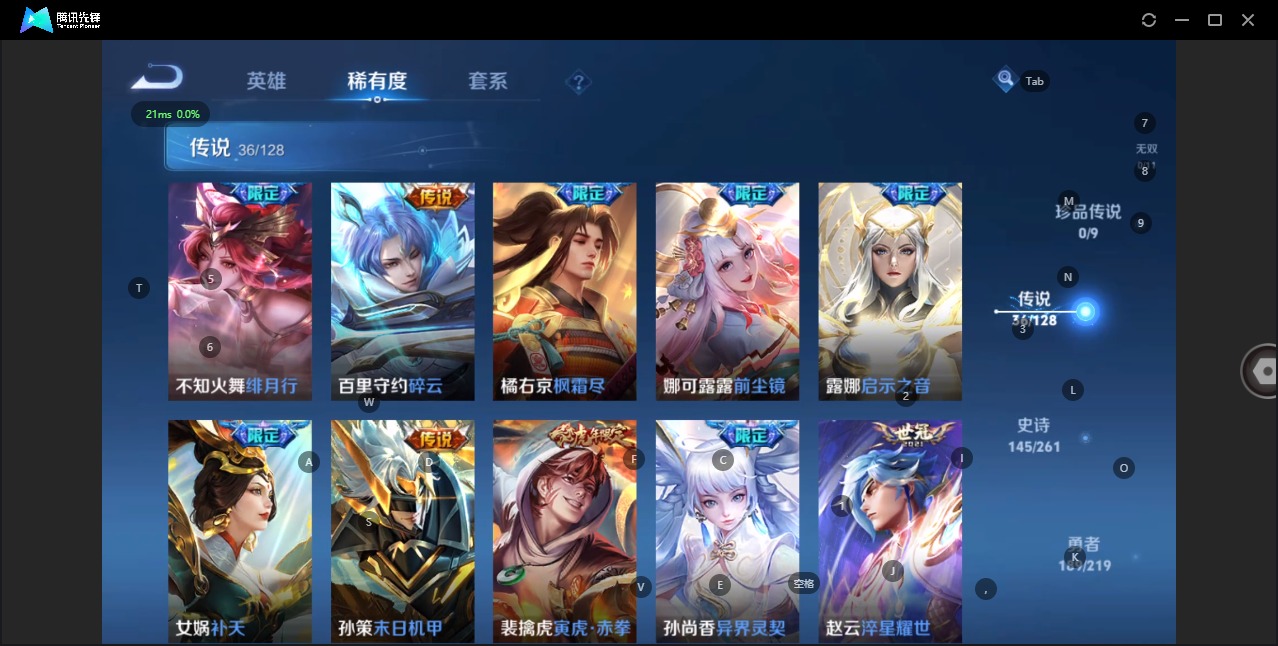 - [11259533]V7 1典藏 3传说 108英雄 115皮肤 可修改实名 女号 安全保护中 荣耀水晶:无限飓风号(高达) 传说皮:地狱之眼,一念神魔,淬星耀世 珍宝阁皮:胡桃夹子,玩趣恶龙 限定皮:时之彼端,高山流水,五谷丰年,游园惊梦,如梦令-后羿 史诗皮:苍穹之光,江河有灵,末日机甲-吕布,猫狗日记-孙策,女仆咖啡,水果甜心,天才门将,星夜王子,心灵骇客,功夫厨神,德古拉伯爵,鬼剑武藏,心灵战警,水晶猎龙者,金属风暴,圣诞狂欢,圣诞恋歌,鹰眼统帅,王者之锤,魅力维加斯,天秀·音浪,无心,未来纪元-赵云