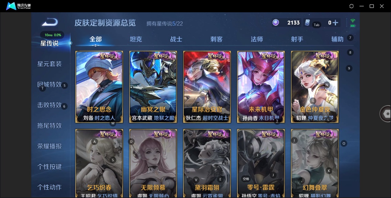 金蝉唐三藏,甄姬幽恒,廉颇寅虎·御盾,赵云百木心枪,赵云龙胆,典韦岱宗,孙尚香异界灵契,不知火舞绯月行,吕布御风骁将,露娜启示之音,后羿辉光之辰,露娜一生所爱,镜匿光追影者,杨玉环寅虎·心曲,公孙离玉兔公主,司空震愿照·山河定,裴擒虎李小龙,裴擒虎寅虎·赤拳,上官婉儿梁祝,上官婉儿神器·万象笔,李白诗剑行,花木兰默契交锋,桑启鸣野蒿,女娲补天,孙悟空孙行者,孙悟空至尊宝,百里玄策白虎志,马超神威,雅典娜神奇女侠,妲己时之奇旅,妲己愿照·众生和,韩信傲雪梅枪,韩信飞衡,虞姬霸王别姬,娜可露露前尘镜,橘右京枫霜尽