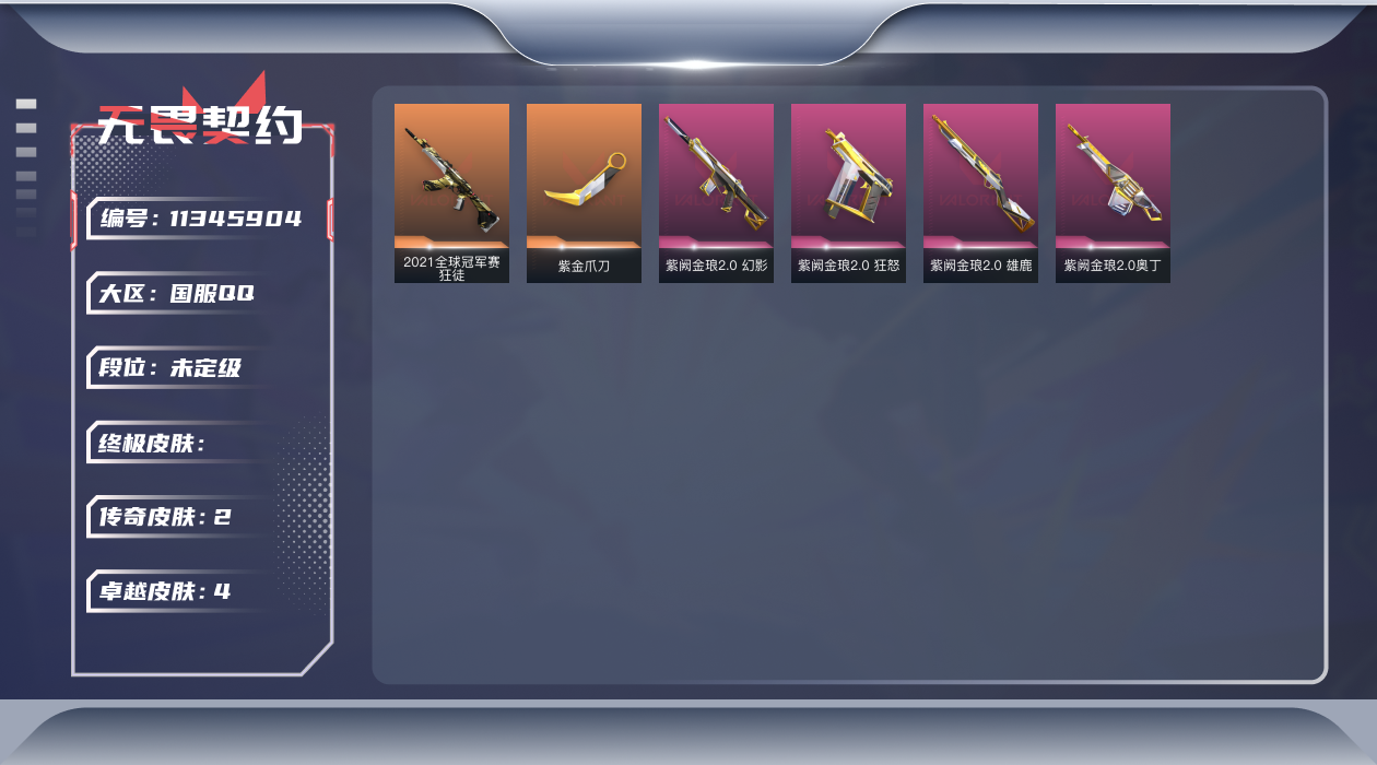 [11345904]2橙皮 4紫皮 11皮肤 27英雄 56卡面 190已用源晶 未定级 优质装备:紫阙金琅//2.0套装,狂徒-2021全球冠军赛,幻影-紫阙金琅2.0,奥丁-紫阙金琅2.0,紫金爪刀,雄鹿-紫阙金琅2.0 佩枪皮肤:狂怒-紫阙金琅2.0
