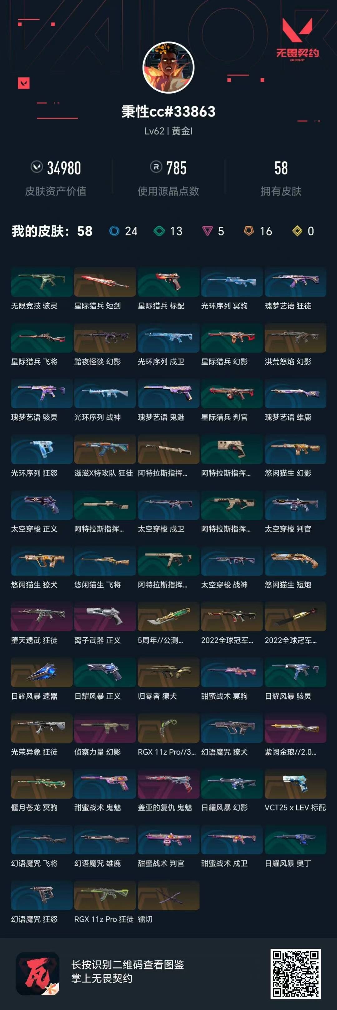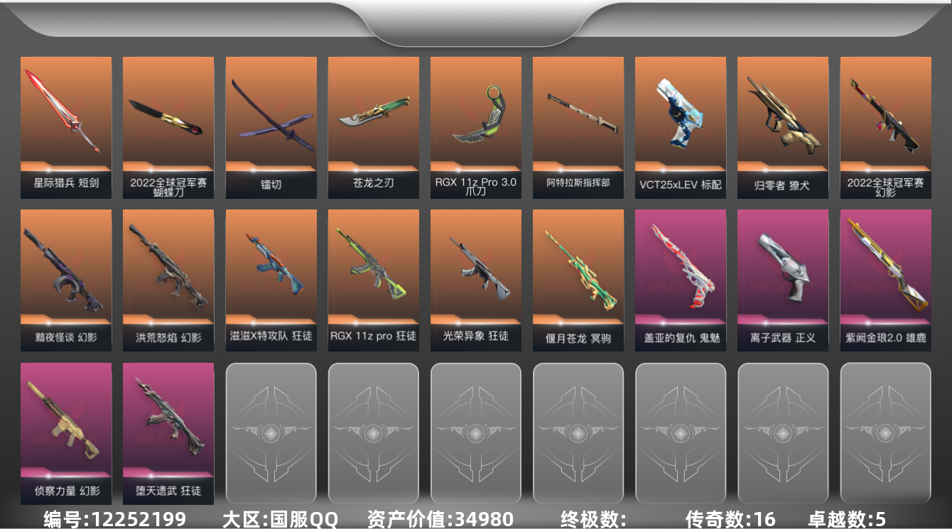 [12252199]16橙皮 5紫皮 58皮肤 19英雄 67卡面 785已用源晶 黄金 优质装备:冥驹-偃月苍龙,幻影-侦察力量,獠犬-归零者,幻影-洪荒怒焰,正义-离子武器,幻影-黯夜怪谈,鬼魅-盖亚的复仇,爪刀-RGX 11z Pro 3.0,镭切,苍龙之刃,阿特拉斯指挥部,星际猎兵 短剑,雄鹿-紫阙金琅2.0 亮点皮肤:幻影-2022全球冠军赛,2022全球冠军赛 蝴蝶刀 套装:2022全球冠军赛 佩枪皮肤:标配-VCT25xLEV 步枪皮肤:狂徒-滋滋X特攻队,狂徒-光荣异象,RGX 11z pro 狂徒,狂徒-堕天遗武