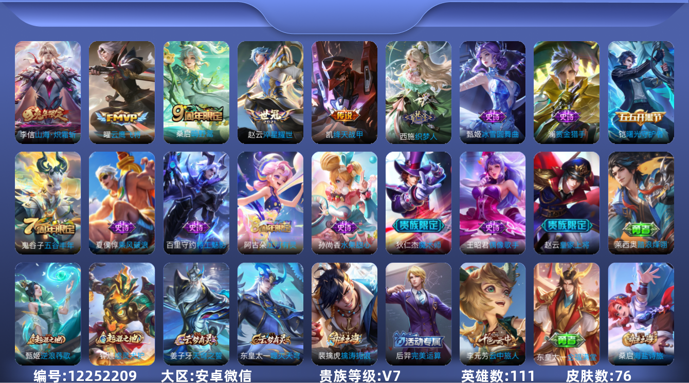 [12252209]V7 5传说 111英雄 76皮肤 可修改实名 优质装备:云鹰飞将(小将军),绛天战甲(鸡嘴战神),淬星耀世,山海·炽霜斩(李信年限) 限定皮:鸣野蒿,五谷丰年 史诗皮:织梦人,特工魅影,江河有灵,偶像歌手,水果甜心,乘风破浪,曙光守护者,赏金猎手