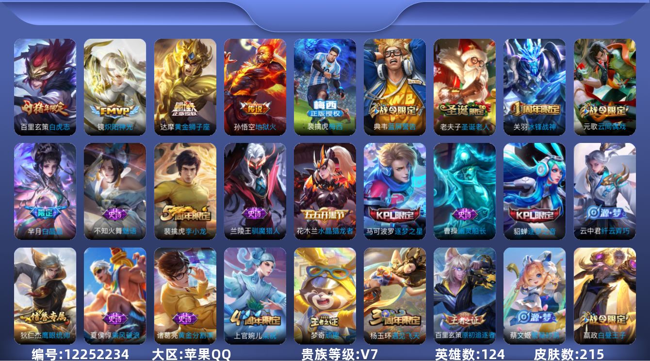 [12252234]V7 4传说 124英雄 215皮肤 可修改实名 优质装备:黄金狮子座,炽阳神光,地狱火 珍宝阁皮:女武神 限定皮:白虎志(电光耗子),梅西,白晶晶,遇见飞天,冰锋战神,梁祝,逐梦之星,逐梦之音,李小龙,逐梦之光,圣诞老人 史诗皮:星界战将,黄金分割率,蒙恬荣光圣徽,魅语,偶像歌手,水果甜心,德古拉伯爵,幽灵船长,地狱岩魂,纤云弄巧,繁星吟游(呼啦呼啦),缤纷独角兽,乘风破浪,水晶猎龙者,箭羽风息,金属风暴,原初追逐者,圣诞狂欢,鹰眼统帅,王者之锤,暗夜贵公子,魅力维加斯,黎明之约