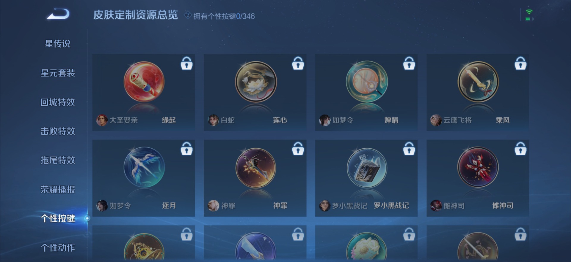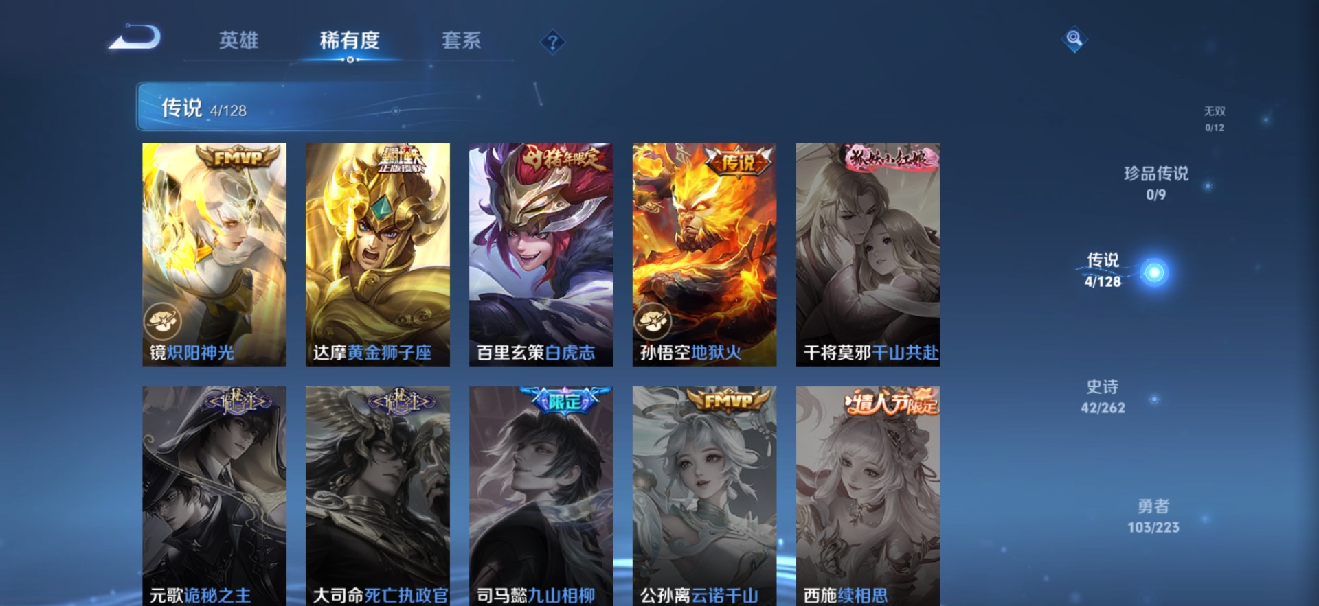 夏侯惇朔风刀,老夫子醍醐杖,沈梦溪大漠名商,盾山御銮,曹操烛龙,孙膑妖精王,苏烈千军破阵,典韦穷奇,典韦蓝屏警告,达摩沙漠行僧,牛魔御旌,鲁班七号狮舞东方,吕布猎兽之王,庄周蜃楼王,元歌云间偶戏,兰陵王金庭之子,裴擒虎擒涛扼浪,鲁班大师探海日志,明世隐疑决卦,蒙犽狂想玩偶喵,白起狰,亚瑟狮心王,鬼谷子原初探秘者,张良古海寻踪,女娲朔望之晖,桑启海盐诗旅,狄仁杰万华元夜,嬴政白昼王子,芈月重明,程咬金演武夺筹,扁鹊炼金王,李元芳云中旅人,弈星混沌棋,虞姬凯尔特女王,米莱狄御霄,钟馗神迹守卫,钟馗驱傩正仪,狂铁御狮,太乙真人饕餮