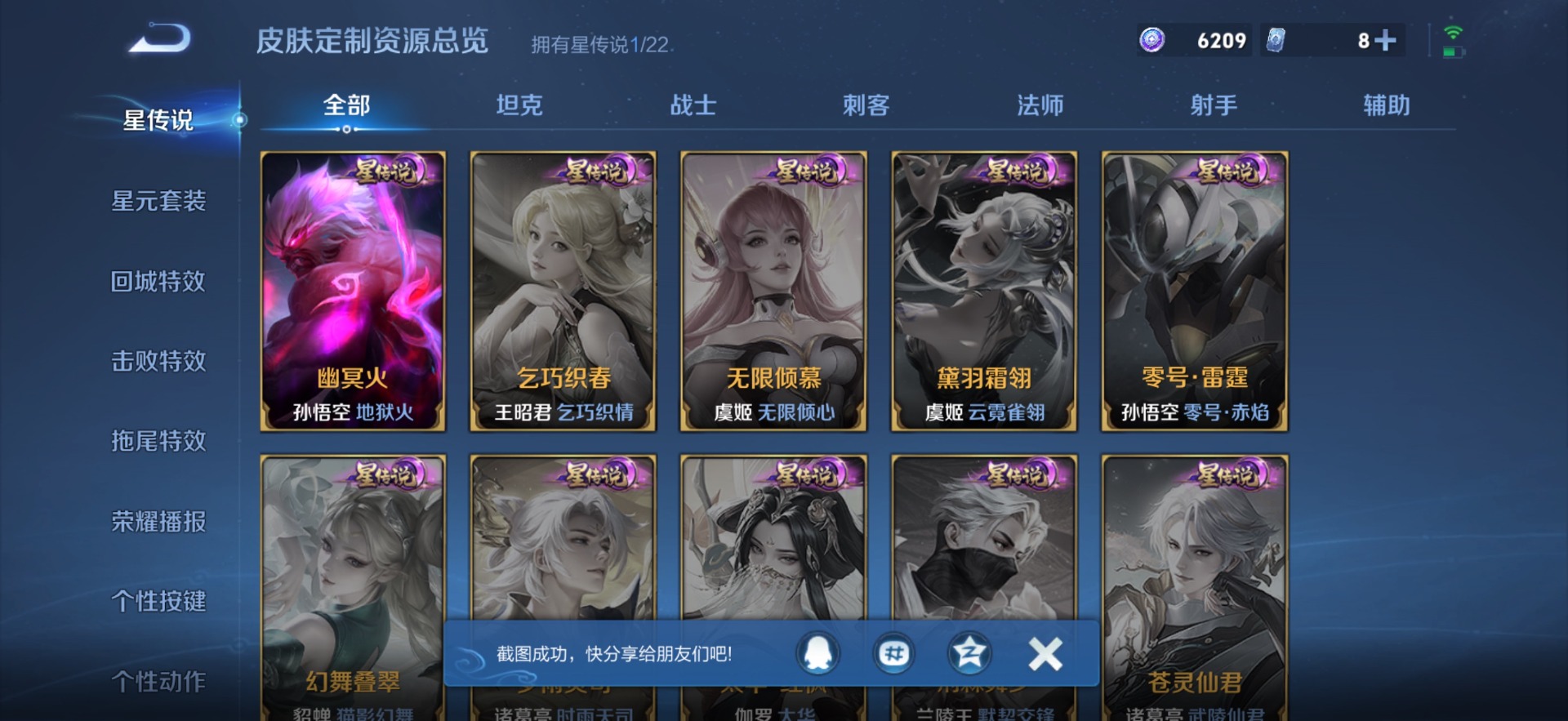 - [11497713]V8 2典藏 14传说 121英雄 281皮肤 可修改实名 荣耀水晶:九霄神辉(木兰典藏),杀手不太冷 传说皮:乘龙·问璇玑(孙尚香年限),乘龙·淬吴钩(孙策年限),李逍遥,仲夏夜之梦(大飞蛾),末日机甲-孙尚香(绿蚂蚱),一念神魔,久胜战神,云鹰飞将(小将军),炽阳神光,超时空战士-狄仁杰 珍宝阁皮:女武神,玩趣恶龙 限定皮:白虎志(电光耗子),凤求凰(白切鸡),凤凰于飞,寅虎·展翼(孙膑年限),神威(电光马子),遇见飞天,高山流水,五谷丰年,游园惊梦,梁祝,天狼狩猎者,逐梦之音,李小龙,霸王别姬-虞姬,默契交锋-花木兰,猪悟能,引擎之心,天魔缭乱,青春决赛季,蜜橘之夏,寅虎·心曲(虎婆) 史诗皮:星界战将,紫霞仙子,白龙吟,黄金分割率,特工魅影,千年之狐,永昼,江河有灵,百解令(蒙犽),蒙恬荣光圣徽,冰冠公主,偶像歌手,晚萤,无限星赏官,暗夜猫娘,末日机甲-吕布,猫狗日记-孙策,乱世虎臣,节奏热浪,女仆咖啡,摇滚巨星,水果甜心,绅士熊喵,天才门将,星夜王子,时之奇旅-安琪拉,功夫厨神,德古拉伯爵,暗隐猎兽者,幽灵船长,心灵战警,地狱岩魂,纤云弄巧,繁星吟游(呼啦呼啦),拒霜思,缤纷独角兽,乘风破浪,逐浪之夏,水晶猎龙者,热力回旋,金属风暴,原初追逐者,圣诞狂欢,圣诞恋歌,鹰眼统帅,王者之锤,黎明之约,赏金猎手,无心,未来纪元-赵云