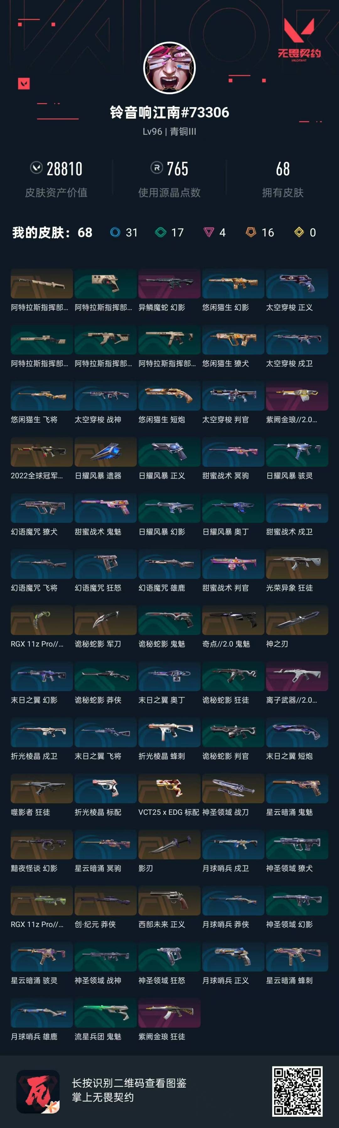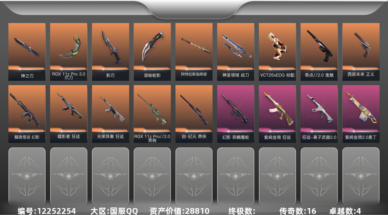 [12252254]16橙皮 4紫皮 68皮肤 24英雄 90卡面 765已用源晶 青铜 优质装备:狂徒-紫阙金琅,幻影-黯夜怪谈,奥丁-紫阙金琅2.0,爪刀-RGX 11z Pro 3.0,鬼魅-奇点//2.0,影刃,神圣领域 战刀,诡秘蛇影,神之刃,阿特拉斯指挥部 佩枪皮肤:标配-VCT25xEDG,正义-西部未来 步枪皮肤:幻影-异鳞魔蛇,狂徒-噬影者,狂徒-光荣异象,狂徒-离子武器2.0 狙击枪皮肤:莽侠-创·纪元,冥驹-RGX 11z Pro//2.0