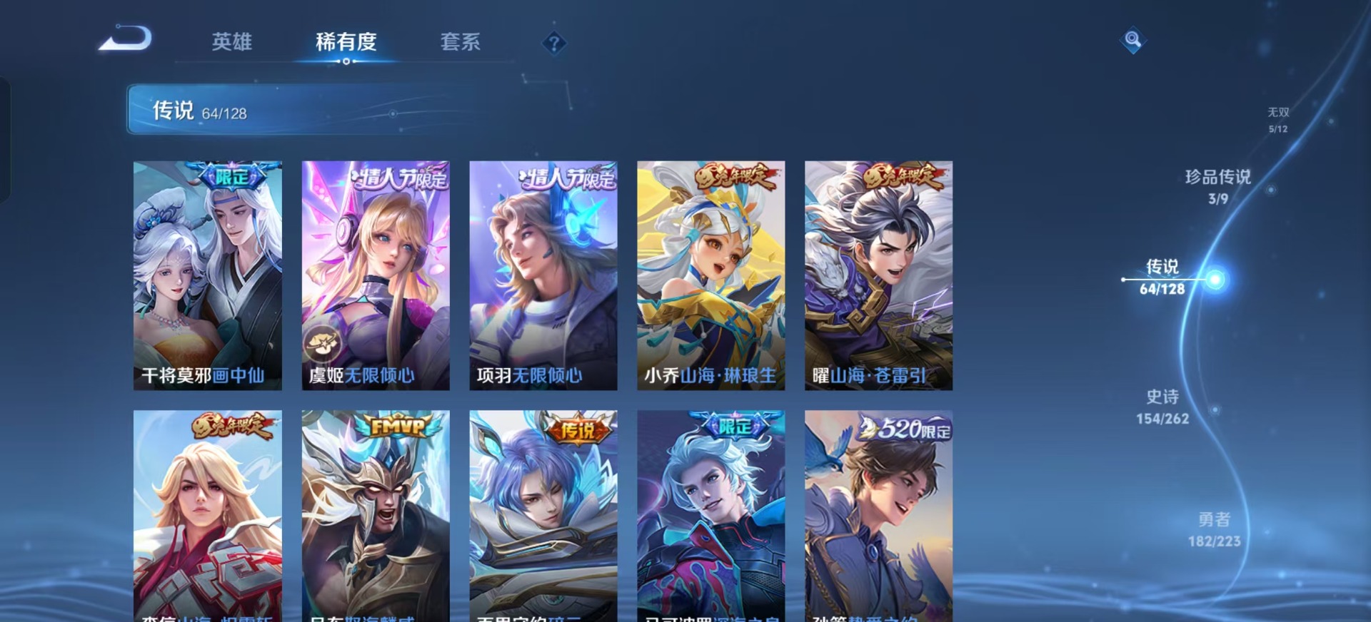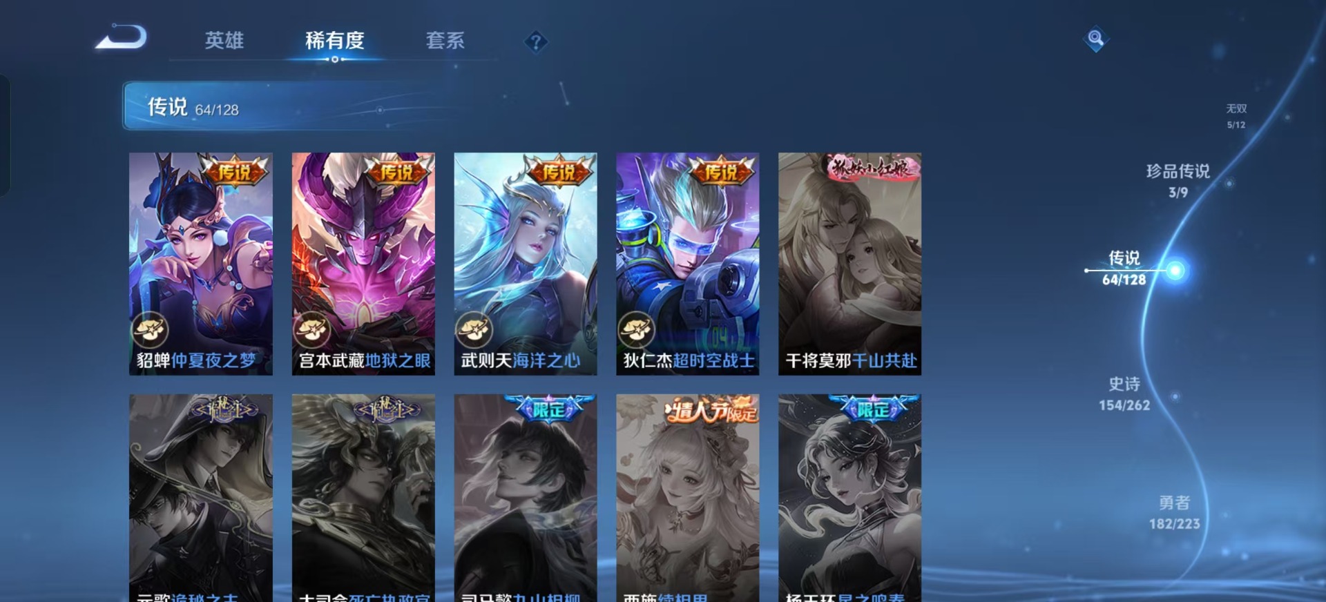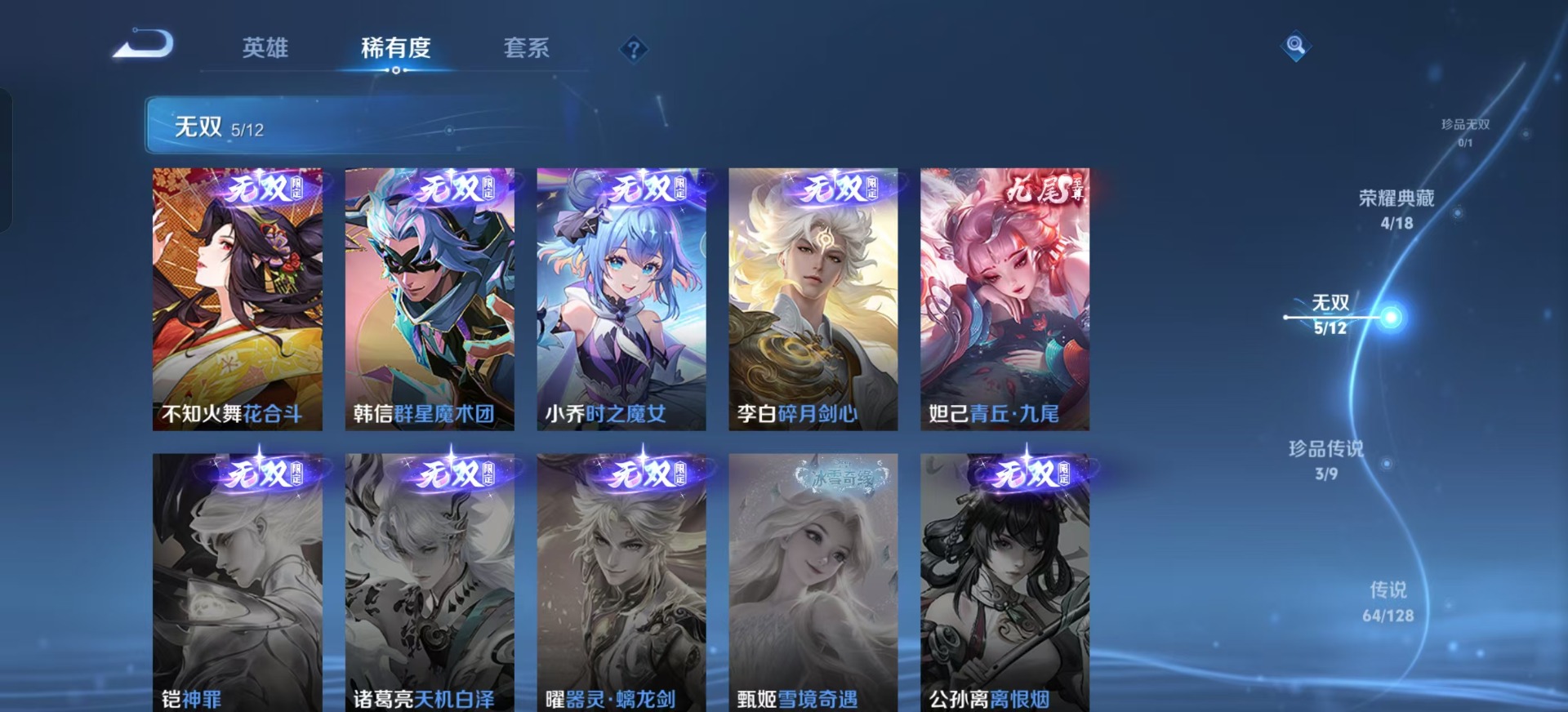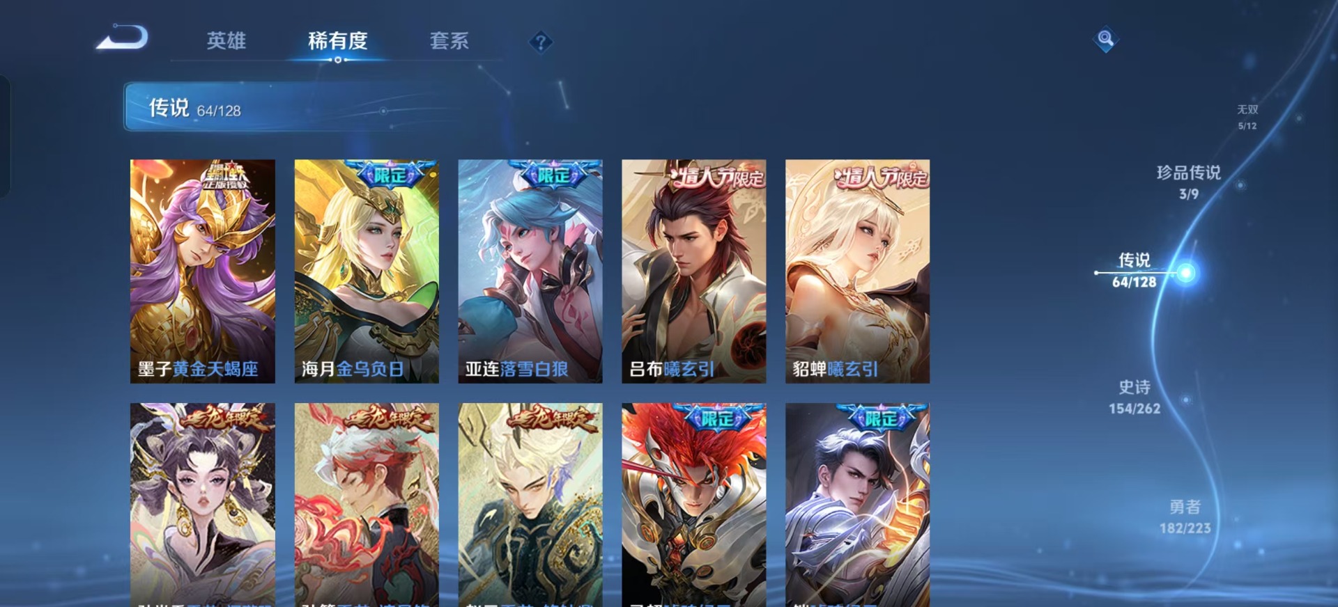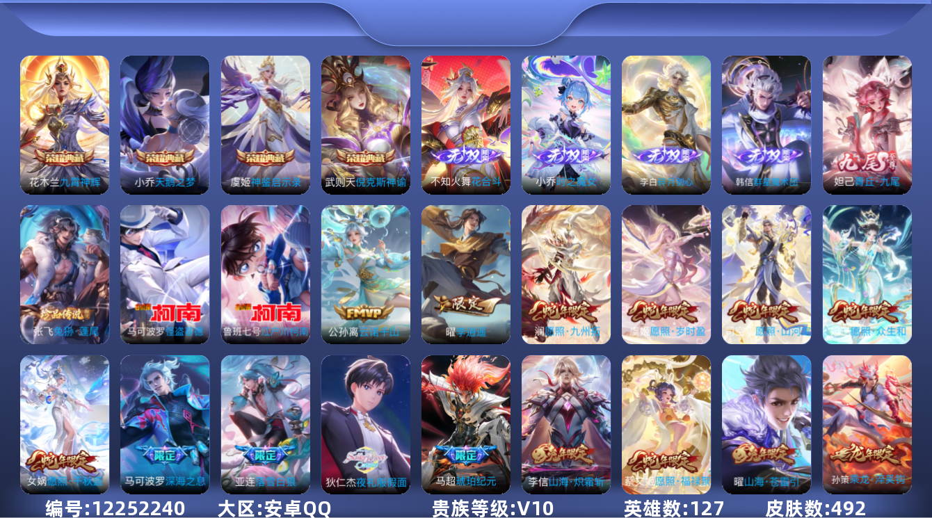 [12252240]V10 4典藏 5无双 3珍品传说 64传说 127英雄 492皮肤 典藏英雄武则天 可修改实名 优质装备:天鹅之梦(小乔典藏),倪克斯神谕(宇宙婆娘),九霄神辉(木兰典藏),青丘·九尾(妲己无双),碎月剑心(李白无双),神鉴启示录,小乔时之魔女(小乔无双),韩信群星魔术团(韩信无双),花合斗,江户川柯南,怪盗基德,黄金狮子座,黄金射手座,云鹰飞将(小将军),绛天战甲(鸡嘴战神),黄金白羊座,猫影幻舞,久胜战神,炽阳神光,云霓雀翎,仲夏夜之梦(大飞蛾),零号·赤焰,海洋之心,地狱之眼,胖达荣荣,李逍遥,乞巧织情,时之恋人-刘备(电焊工),游龙清影(小青龙),淬星耀世,超时空战士-狄仁杰,末日机甲-孙策,挚爱之约,碎云,山海·炽霜斩(李信年限),山海·琳琅生(小乔年限),山海·苍雷引(电光曜子),画中仙,浮生妄,青丘·九尾,电玩·雷克斯,妄想奇谈,鹤归松栖(云缨),惊梅引,永恒水手月亮,夜礼服假面,霜月吟,澜逐花归海,艾琳觅芳踪,琥珀纪元铠,琥珀纪元马超,金乌负日,黄金天蝎座,云中君群星魔术团,涂山容容 珍品传说:兔狲·蓬尾 传说皮:乘龙·问璇玑(孙尚香年限),乘龙·铭钟鼎(赵云年限),乘龙·淬吴钩(孙策年限),貂蝉曦玄引,吕布曦玄引,落雪白狼,云诺千山 珍宝阁皮:妄想食味,优雅恋人,女武神 限定皮:愿照·九州拓(澜年限),愿照·福禄聚(蔡文姬年限),愿照·岁时盈(虞姬年限),愿照·山河定(司空震年限),愿照·众生和(妲己年限),愿照·千秋盛(女娲年限),映山客,陌上桑,鸣野蒿,异界灵契(白毛香),寅虎·展翼(孙膑年限),白鹤梁神女,魔法小厨娘,白晶晶,山海·碧波行(瑶年限),无限倾心-项羽,高山流水,无限倾心-虞姬,匿光决锋者,怒海麟威,五谷丰年,青龙志(铠年限),武圣,游园惊梦,梁祝,龙胆,逐梦之翼,逐梦之星,烈魂,天狼溯光者,虎魄,逐梦之音,天狼征服者,天狼绘梦者,李小龙,逐梦之影,逐梦之光,辉光之辰,如梦令-嫦娥,如梦令-后羿,霸王别姬-项羽,霸王别姬-虞姬,奇迹圣诞,引擎之心,云端筑梦师,蜜橘之夏,寅虎·御盾(廉颇年限),深海之息(深海大菠萝),山海·玄木吟(马可年限),冰霜神祇 史诗皮:瑰影绮梦,化蝶舞,龙之律动,灵蛊蚀心,琥珀纪元伽罗,雪豹·霜爪,星界战将,茶境仙,乘龙·忆丹青(大乔年限),百相守梦-黄忠,谪仙醉月,破空之剑,涂山红红,乘龙·聚宝船(