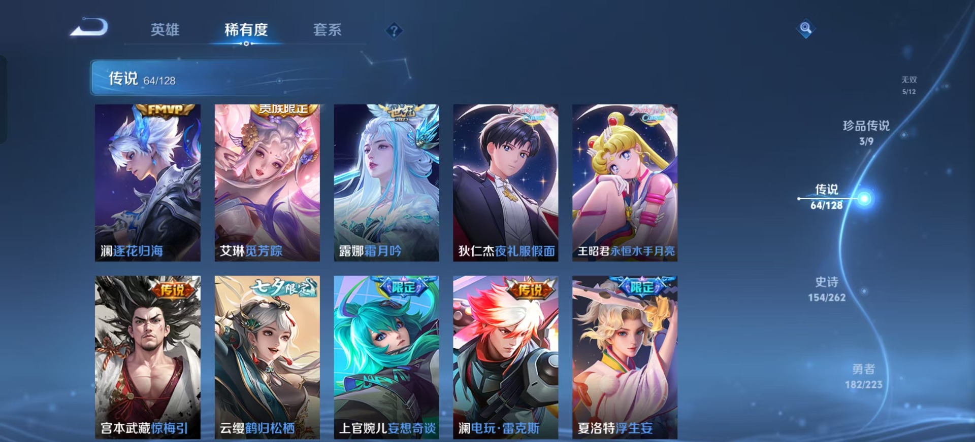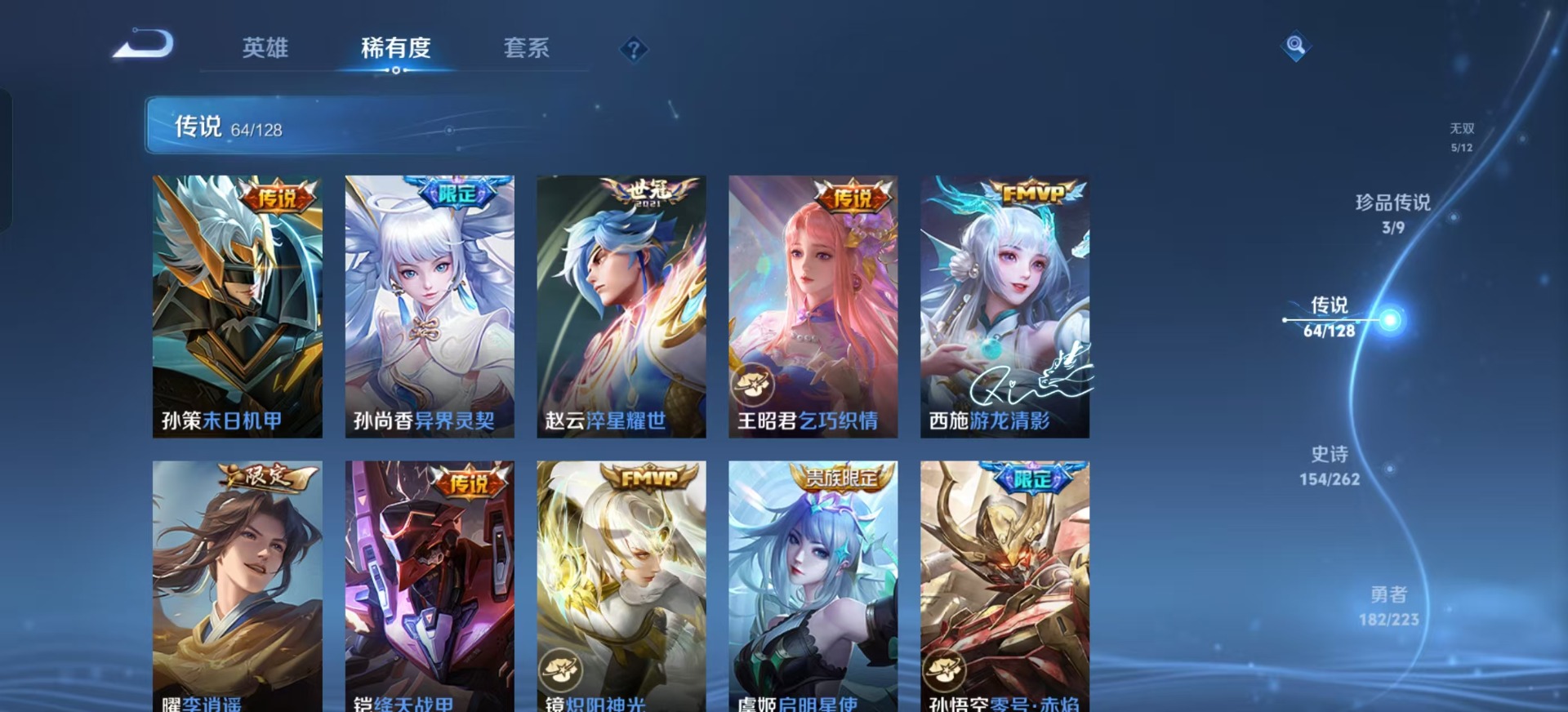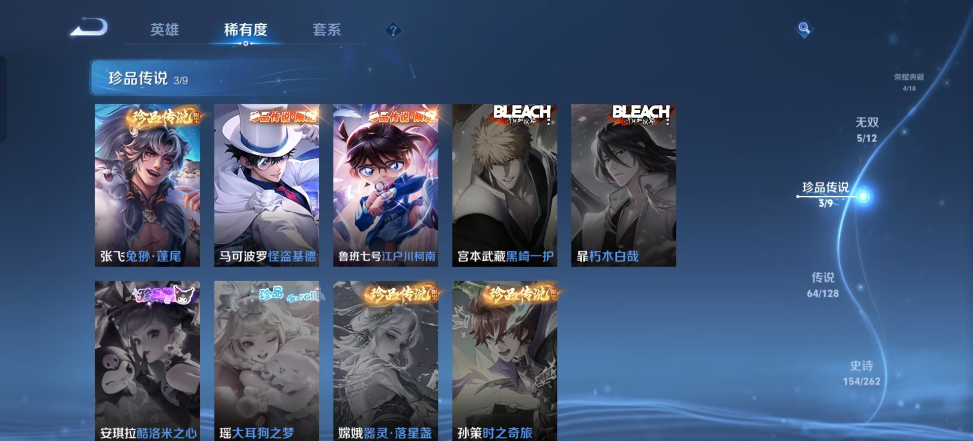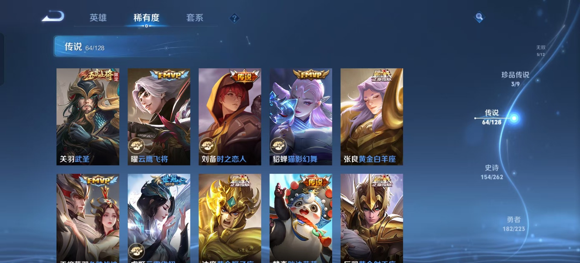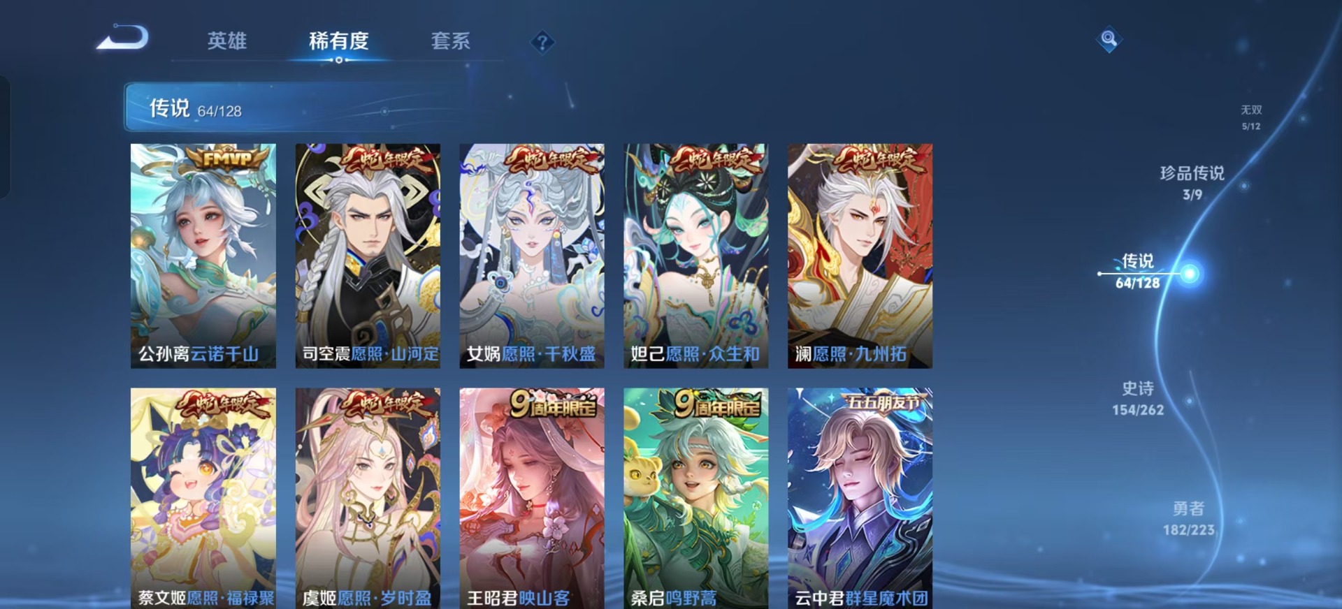 大乔白鹤梁神女,夏侯惇匿光决锋者,黄忠烈魂,哪吒逐梦之翼,铠青龙志,廉颇寅虎·御盾,曹操天狼征服者,伽罗天狼溯光者,张飞虎魄,赵云龙胆,孙膑寅虎·展翼,孙尚香异界灵契,项羽霸王别姬,后羿如梦令,后羿辉光之辰,庄周云端筑梦师,司空震愿照·山河定,公孙离蜜橘之夏,貂蝉逐梦之音,裴擒虎李小龙,东皇太一逐梦之光,上官婉儿梁祝,上官婉儿天狼绘梦者,安琪拉魔法小厨娘,马可波罗逐梦之星,马可波罗山海·玄木吟,艾琳陌上桑,马可波罗深海之息,桑启鸣野蒿,女娲愿照·千秋盛,芈月白晶晶,赵云引擎之心,盘古冰霜神祇,妲己愿照·众生和,韩信逐梦之影,蔡文姬奇迹圣诞,蔡文姬愿照·福禄聚,瑶山海·碧波行,澜愿照·九州拓,虞姬霸王别姬,虞姬愿照·岁时盈,嫦娥如梦令,王昭君映山客,关羽武圣