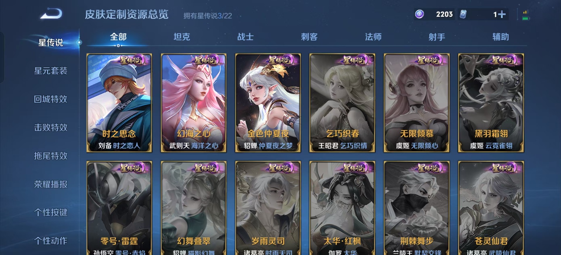 刘备时之恋人,铠绛天战甲,铠琥珀纪元,赵云乘龙·铭钟鼎,赵云淬星耀世,干将莫邪久胜战神,干将莫邪画中仙,孙策末日机甲,孙策挚爱之约,孙策乘龙·淬吴钩,达摩黄金狮子座,孙尚香乘龙·问璇玑,海月金乌负日,王昭君乞巧织情,露娜霜月吟,吕布曦玄引,镜炽阳神光,亚连落雪白狼,宫本武藏惊梅引,貂蝉猫影幻舞,夏洛特浮生妄,艾琳觅芳踪,西施游龙清影,狄仁杰夜礼服假面,张良黄金白羊座,孙悟空零号·赤焰,曜云鹰飞将,曜李逍遥,马超琥珀纪元,云中君群星魔术团,百里守约碎云,墨子黄金天蝎座,澜逐花归海,虞姬云霓雀翎,貂蝉曦玄引,王昭君永恒水手月亮