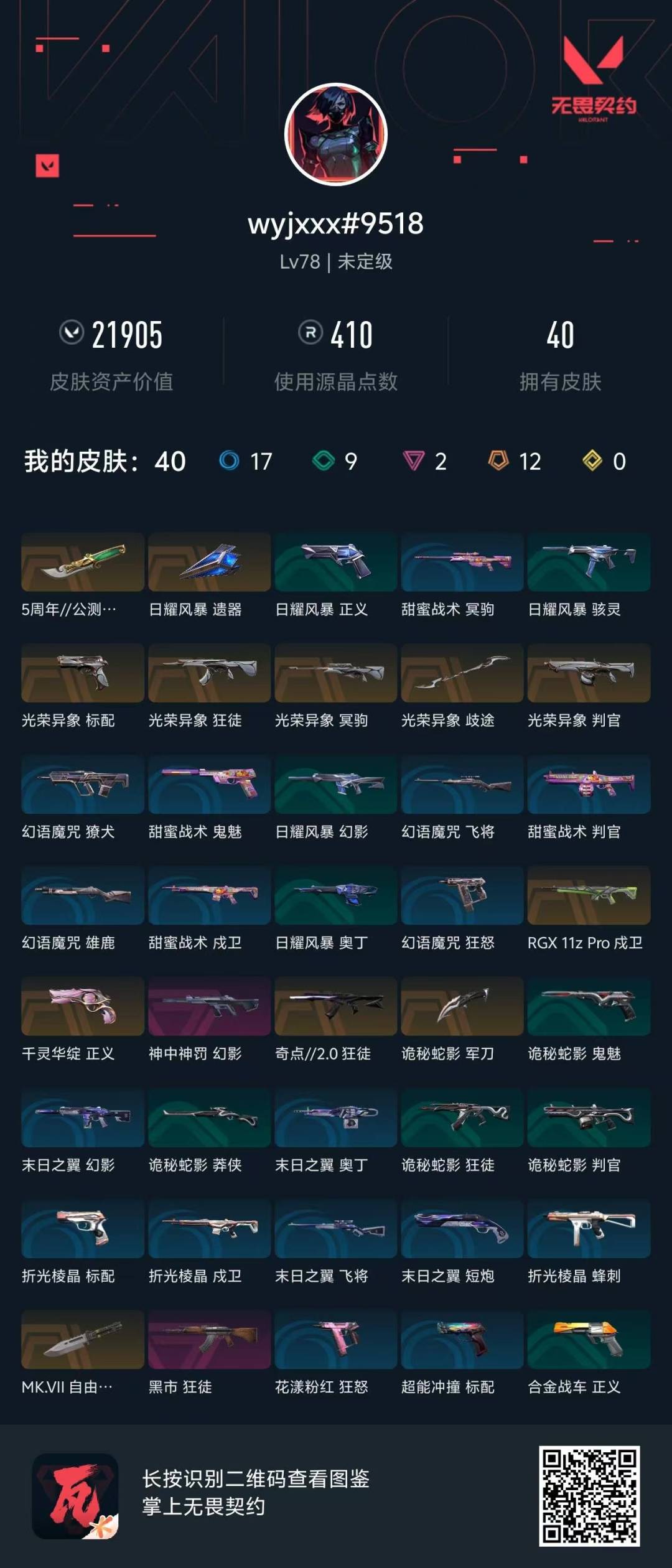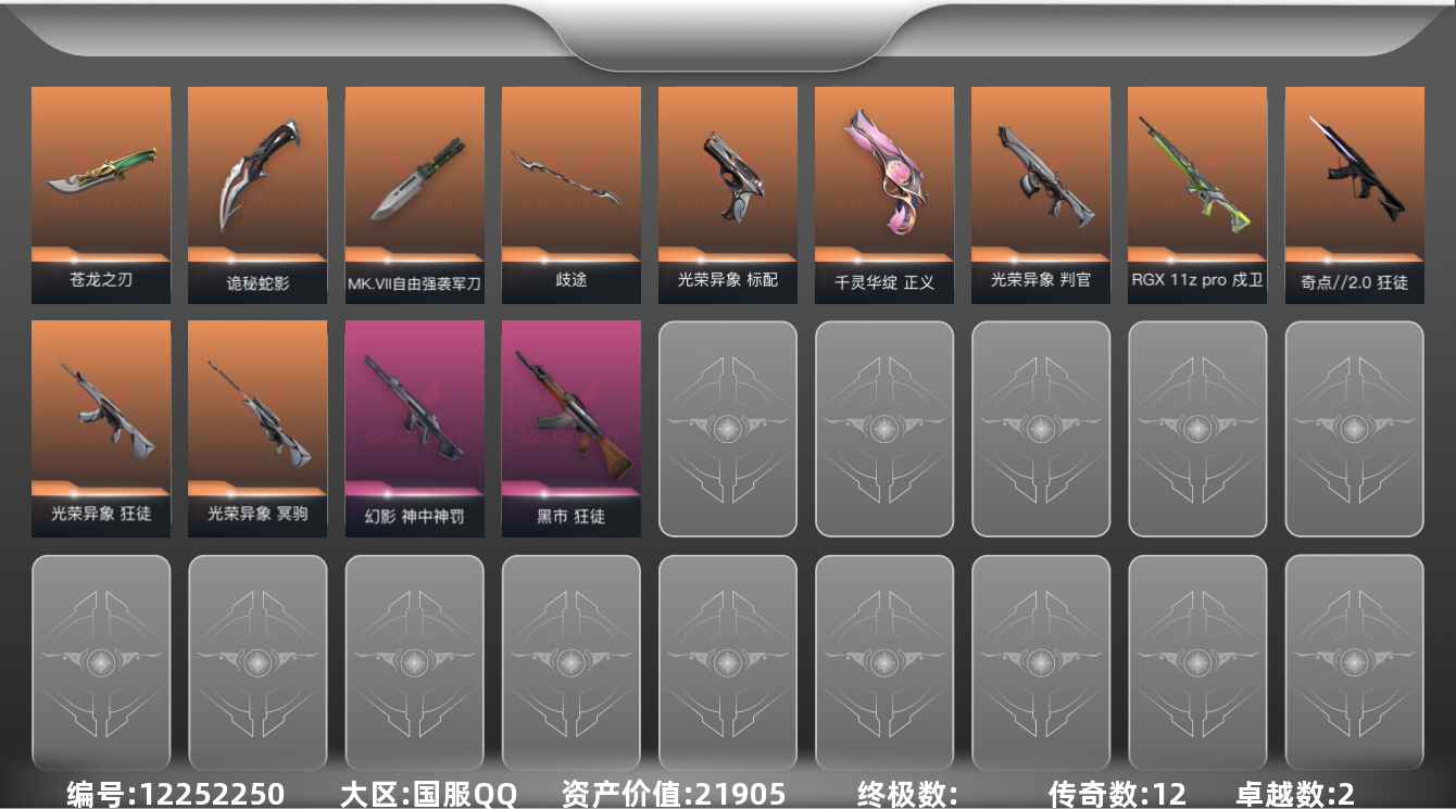 [12252250]12橙皮 2紫皮 40皮肤 20英雄 42卡面 410已用源晶 未定级 优质装备:正义-千灵华绽,狂徒-奇点//2.0,MK.VII自由强袭军刀,诡秘蛇影,光荣异象,苍龙之刃 套装:光荣异象 佩枪皮肤:标配-光荣异象 霰弹枪皮肤:判官-光荣异象 步枪皮肤:狂徒-黑市,幻影-神中神罚,狂徒-光荣异象,RGX 11z pro 戍卫 狙击枪皮肤:冥驹-光荣异象