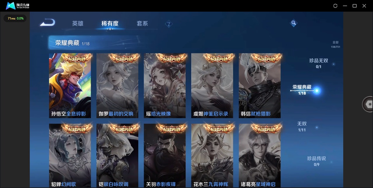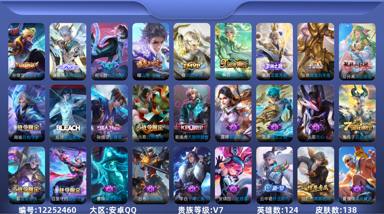 - [11713064]V7 1无双 1珍品传说 11传说 123英雄 221皮肤 可修改实名 优质装备:天机白泽,器灵·落星盏,一念神魔,地狱之眼,胖达荣荣,山海·炽霜斩(李信年限),山海·苍雷引(电光曜子),浮生妄,鹤羽星尊,涂山容容 传说皮:幻光神枪 珍宝阁皮:胡桃夹子,玩趣恶龙 限定皮:愿照·九州拓(澜年限),愿照·山河定(司空震年限),逐霄战戟,神威(电光马子),诗剑行,青龙志(铠年限),梁祝,龙胆,烈魂,李小龙,如梦令-嫦娥,猪悟能,山海·玄木吟(马可年限) 史诗皮:星界战将,龙之律动,怒海争锋,战舞者,海诺心动手记,琥珀纪元伽罗,蔬乡物语(鲁班七号),百相守梦-黄忠,电玩小子(小书包),特工魅影,永昼,江河有灵,高渐离燃音魔法,蒙恬荣光圣徽,晚萤,电玩·爆裂旋风,末日机甲-吕布,猫狗日记-孙策,节奏热浪,修罗,水果甜心,星夜王子,幽灵船长,鬼剑武藏,纤云弄巧,缤纷独角兽,乘风破浪,水晶猎龙者,金属风暴,原初追逐者,圣诞狂欢,圣诞恋歌,鹰眼统帅,魅力维加斯,赏金猎手,无心,未来纪元-赵云