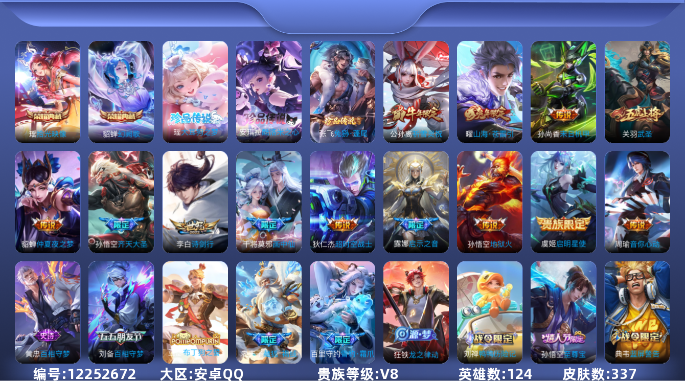 [12252672]V8 2典藏 3珍品传说 13传说 124英雄 337皮肤 可修改实名 优质装备:幻阙歌(貂蝉典藏),拾光映像(瑶典藏),酷洛米之心,大耳狗之梦,末日机甲-孙尚香(绿蚂蚱),地狱火,仲夏夜之梦(大飞蛾),音你心动-周瑜,超时空战士-狄仁杰,山海·苍雷引(电光曜子),画中仙 珍品传说:兔狲·蓬尾 珍宝阁皮:妄想食味,玩趣恶龙 限定皮:至尊宝,傲雪梅枪,飞衡(韩信年限),诗剑行,齐天大圣,五谷丰年,武圣,梁祝,御风骁将(吕布年限),龙胆,烈魂,岱宗(典韦年限),天狼溯光者,奔雷神使(牛魔年限),祈雪灵祝(雪兔子),天狼绘梦者,李小龙,逐梦之影,默契交锋-花木兰,猪悟能,大圣娶亲,冰霜恋舞曲,女儿国国王,百木心枪,玉兔公主,启示之音,匿光启智者,山海·玄木吟(马可年限) 史诗皮:鸭鸭历险记-刘禅,化蝶舞,龙之律动,雪豹·霜爪,藏狐·褐绒,布丁狗之誓,茶境仙,百相守梦-黄忠,电玩小子(小书包),白龙吟,黄金分割率,特工魅影,千年之狐,永昼,冰冠公主,蒙恬荣光圣徽,魅语,电玩·爆裂旋风,无限星赏官,晚萤,偶像歌手,百相守梦(刘备),百相守梦(关羽),末日机甲-吕布,猫狗日记-孙策,猫狗日记-大乔,时之恋人-孙尚香,乱世虎臣,节奏热浪,修罗,女仆咖啡,摇滚巨星,水果甜心,绅士熊喵,星夜王子,心灵骇客,功夫厨神,德古拉伯爵,暗隐猎兽者,幽灵船长,鬼剑武藏,乐园奇幻夜,天秀·启明,舞动绿茵,地狱岩魂,纤云弄巧,繁星吟游(呼啦呼啦),缤纷独角兽,乘风破浪,逐浪之夏,水晶猎龙者,曙光守护者,金属风暴,原初追逐者,圣诞恋歌,鹰眼统帅,魅力维加斯,黎明之约,赏金猎手,无心,未来纪元-赵云