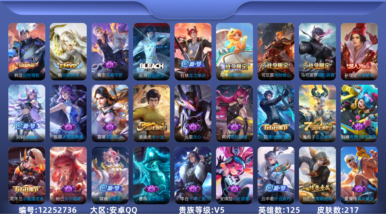 [12252736]【商品标题】:安卓Q-V5-最强王者段位-124英雄-212皮肤-1典藏-0珍品无双-0无双-0珍品传说-1传说-60史诗