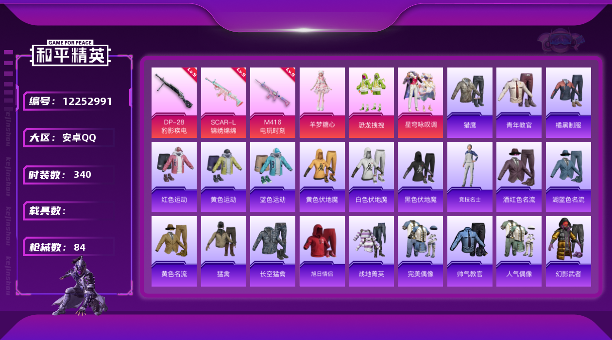 [12252991]3粉装 3特效枪 5印记 可二次 可修改实名 优质装备:SCAR-L-锦绣绵绵,M416电玩时刻,星穹咏叹调,羊梦糖心 热门装扮:恐龙拽拽 稀有枪皮:DP-28-豹影疾电 五级特效枪:五级DP-28-豹影疾电,五级M416-电玩时刻,五级SCAR-L-锦绣绵绵 紫色装扮:SS31特训套装,人气偶像,冰川特警,北国孤狼,霓虹热舞,旭日情侣,云朵鹅,彩虹兔,雪绒豹,SS33特训套装,顶瓜瓜,乐音,电音精灵,都市魅力,酒红色名流,长空猛禽,霓虹街区,青年教官,缤纷果语,蓝彩潮人,蓝色运动,街头潮人,超能勇士,蓝海鲸歌,无面战甲,魅力单车,黄色伏地魔,黄色名流,黄色运动,黑色伏地魔,龙的传人,龟仙人,柠萌假日,橘黑制服,深蓝色名流,幻影武者,夜莺强袭者,完美偶像,帅气教官,战地菁英,湖蓝色名流,绮丽涂鸦,甜蜜菠萝,疯狂小兔子,白色伏地魔,破蛋小黄鸡,空岛之星,竞技达人朋克,红色运动,猛禽,猎鹰,异域银装,都市丽猫,竞技名士,惊鸿侠骨,SS25特训,锦衣飞扬,焰鹰斗篷,幻羽潜行,SS27特训,萌趣绒叽,忠义严颜,云霞荷露,SS26特训,春光漫游,快闪甜心,贝斯之夜,大橘大利,星影赞美诗,耀粉歌者,SS32特训服(SS32特训套装),绯格组合,白糯汤圆 优质战备:霓虹漫游降落伞,龙行天下降落伞,莲影清波降落伞,萌物绒绒飞行器,猪猪侠降落伞,时光之誓降落伞,幻彩电音降落伞,喜羊羊与灰太狼降落伞