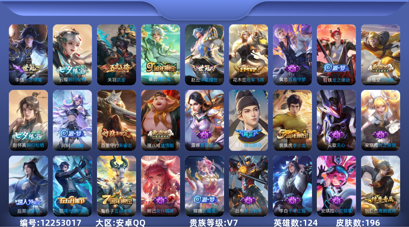 - [11595863]V8 1典藏 1无双 3珍品传说 19传说 125英雄 253皮肤 可修改实名 优质装备:无限飓风号(高达),天机白泽,怪盗基德,朽木白哉,黑崎一护,黄金狮子座,云鹰飞将(小将军),炽阳神光,胖达荣荣,超时空战士-狄仁杰,妄想实况,澜逐花归海,诡秘之主,涂山容容 传说皮:乘龙·铭钟鼎(赵云年限),典韦战鼓燎原,九山相柳 珍宝阁皮:玩趣恶龙 限定皮:愿照·九州拓(澜年限),愿照·山河定(司空震年限),鸣野蒿,凤求凰(白切鸡),飞衡(韩信年限),影龙天霄,诗剑行,五谷丰年,梁祝,御风骁将(吕布年限),李小龙,永曜之星,辉光之辰,如梦令-后羿,孙行者,美猴王,山海·玄木吟(马可年限) 史诗皮:鸭鸭历险记-刘禅,器灵·浮梦炉,灵蛊蚀心,星界战将,龙之律动,石田雨龙,百相守梦-周瑜,茶境仙,埋骨钱,百相守梦-百里守约,紫霞仙子,苍穹之光,电玩小子(小书包),黄金分割率,特工魅影,千年之狐,江河有灵,高渐离燃音魔法,蒙恬荣光圣徽,偶像歌手,暗夜猫娘,猫狗日记-孙策,乱世虎臣,摇滚巨星,水果甜心,绅士熊喵,星夜王子,德古拉伯爵,鬼剑武藏,暗渊魔法,天秀·启明,纤云弄巧,缤纷独角兽,乘风破浪,逐浪之夏,水晶猎龙者,曙光守护者,金属风暴,原初追逐者,圣诞狂欢,圣诞恋歌,鹰眼统帅,暗夜贵公子,魅力维加斯,黎明之约,未来纪元-赵云