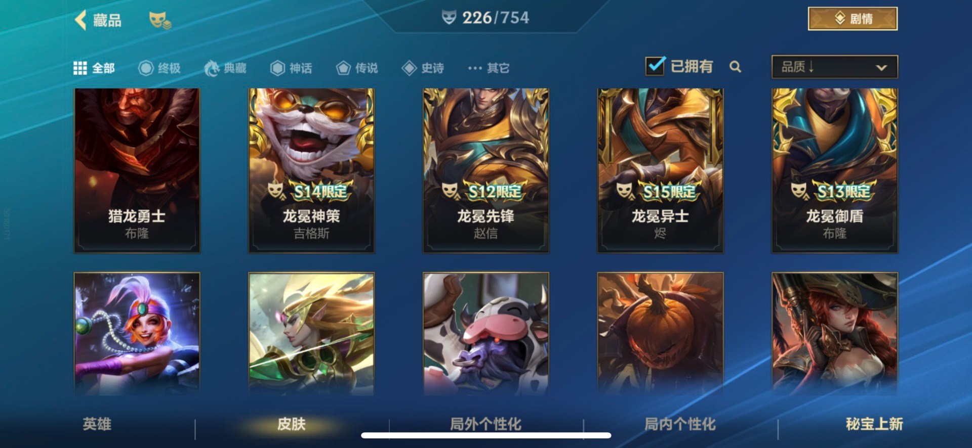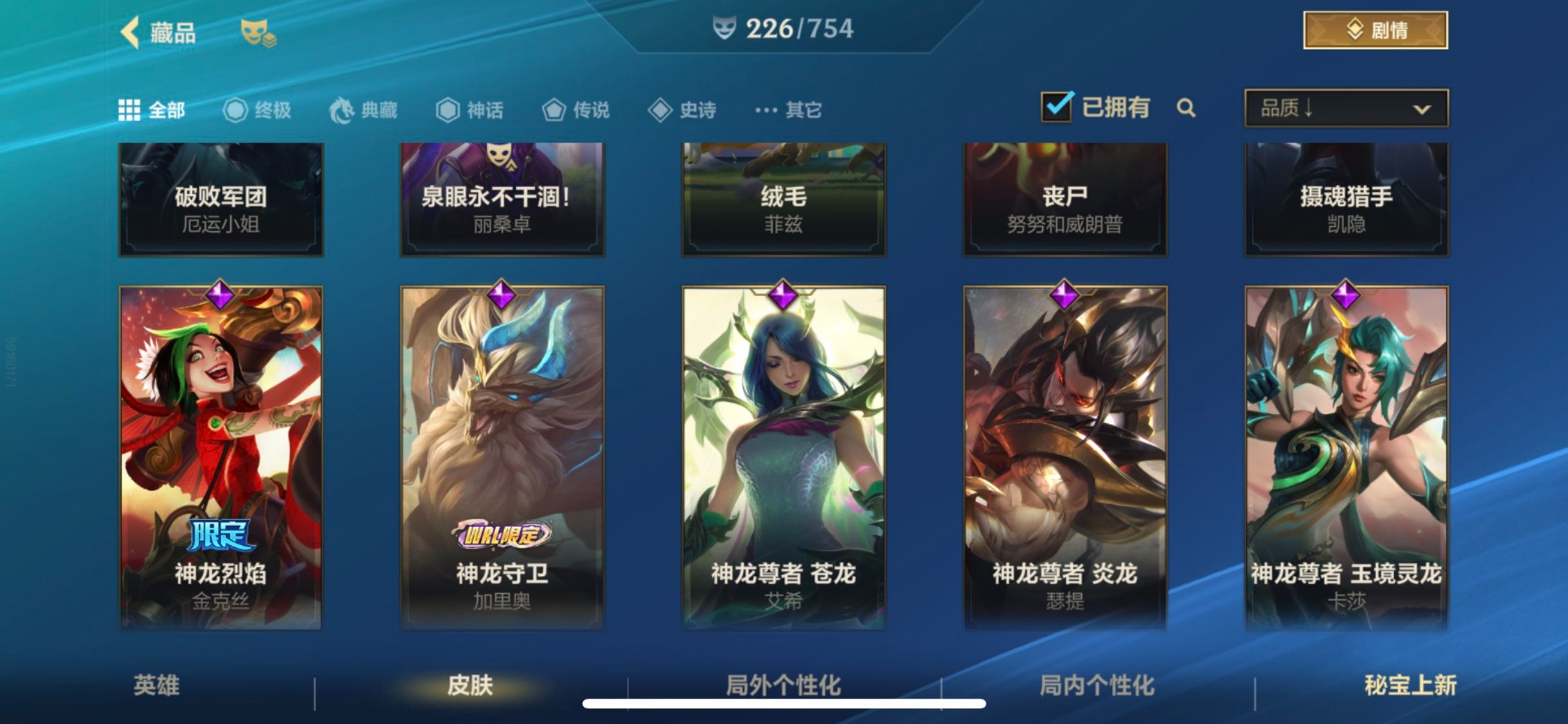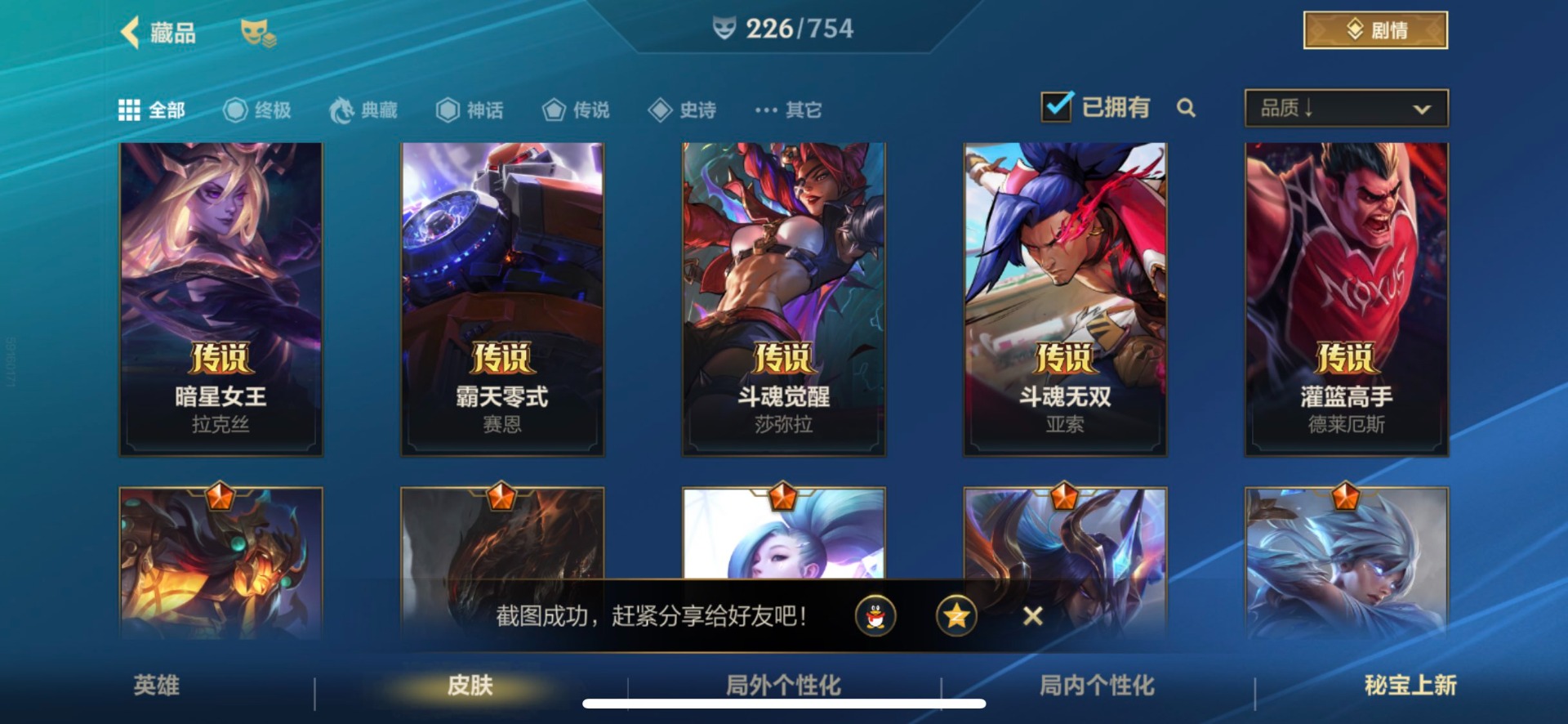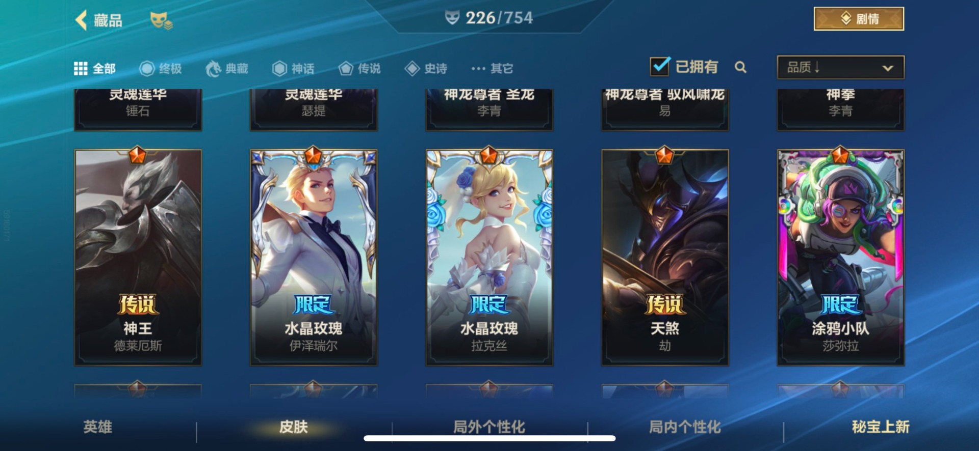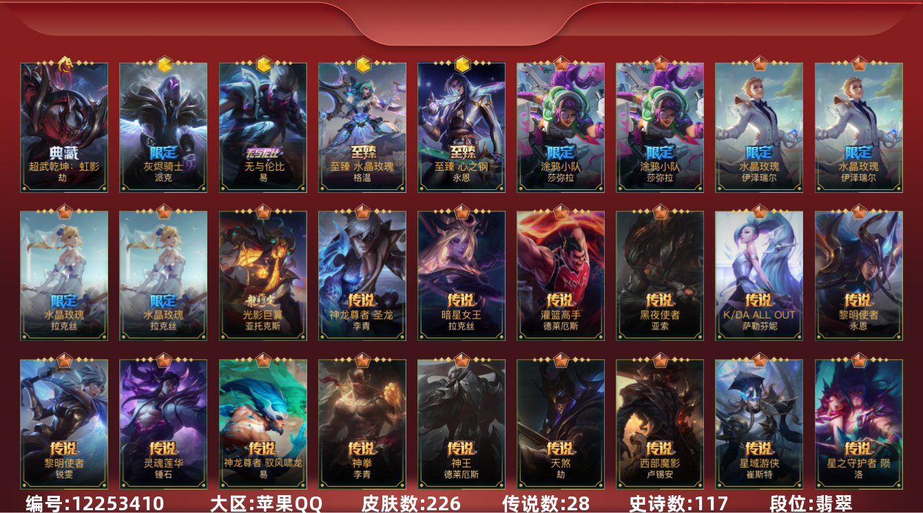 [12253410]1典藏 3神话 21限定 28传说 117史诗 226皮肤 可二次 可修改实名 优质装备:灌篮高手,黑夜使者亚索,K/DA ALLOUT萨勒芬妮,黎明使者锐雯,神龙尊者 驭风啸龙,神拳盲僧,神王诺手,水晶玫瑰拉克丝,水晶玫瑰EZ,天煞劫,西部魔影卢锡安,星域游侠卡牌,星之守护者 陨,超武乾坤:虹影,灵魂莲华锤石,涂鸦小队莎弥拉,源计划:林,源计划:泯灭,暗星女王拉克丝,霸天零式塞恩,水晶玫瑰拉克丝,星域武神贾克斯,星之守护者卡莎,灰烬骑士派克,灵魂莲华腕豪,心之钢凯隐,至臻心之钢永恩,斗魂觉醒 莎弥拉 段位:翡翠 神话皮:至臻水晶格温 限定皮肤:创星之灵,掠星魔刃,斩星魔剑,赵云子龙,烈焰美人薇恩,神龙烈焰金克丝,虎痴之拳,闭月之颜貂蝉,张辽文远,美猴王,水晶玫瑰伊泽瑞尔,水晶玫瑰永恩,水晶玫瑰蔚,水晶玫瑰琴女,关羽云长,水晶玫瑰锐雯,涂鸦小队莎弥拉,涂鸦小队艾克,吕布奉先,无与伦比剑圣 传说皮:神龙尊者 圣龙 李青,光影巨翼亚托克斯,斗魂无双亚索,黎明使者永恩 亮点:星之守护者 落