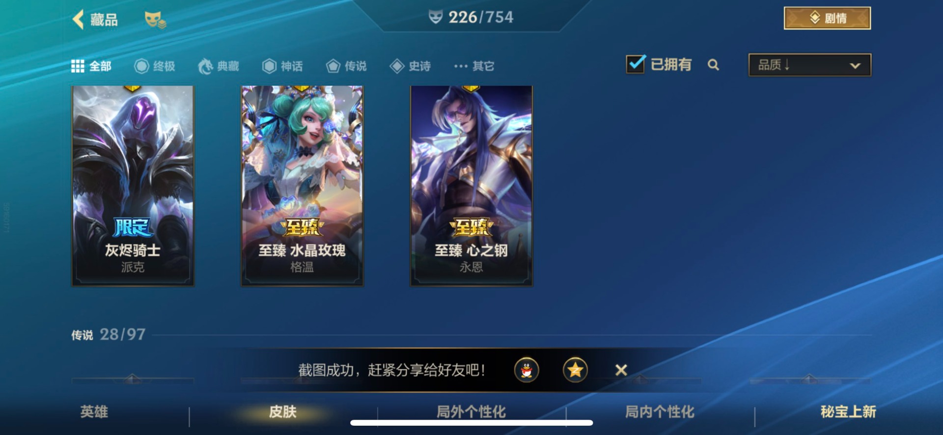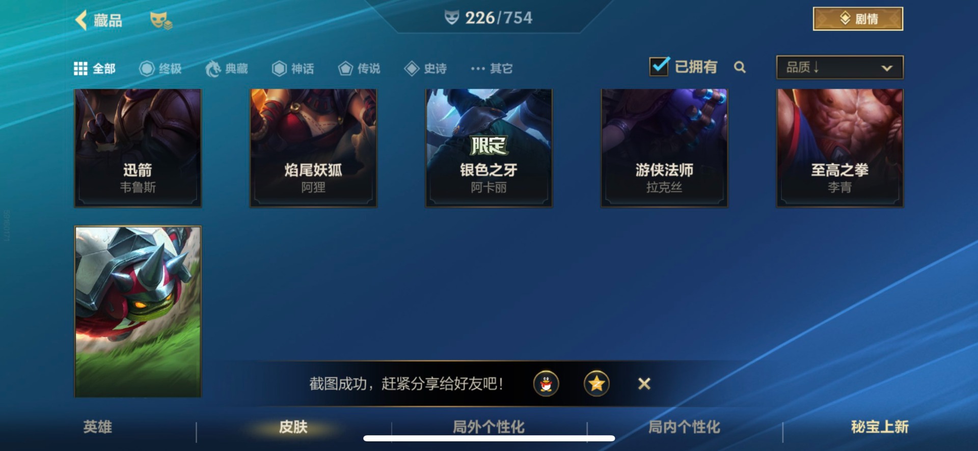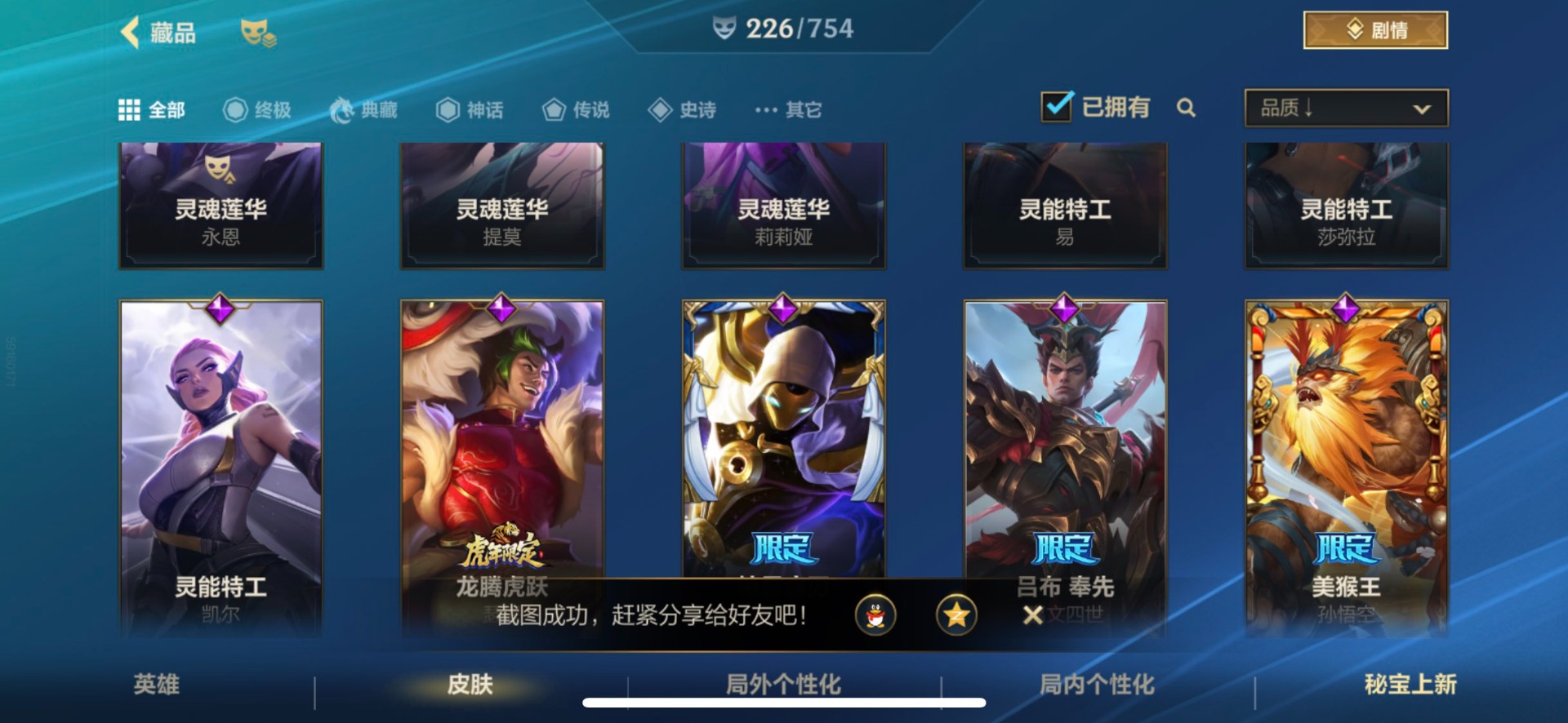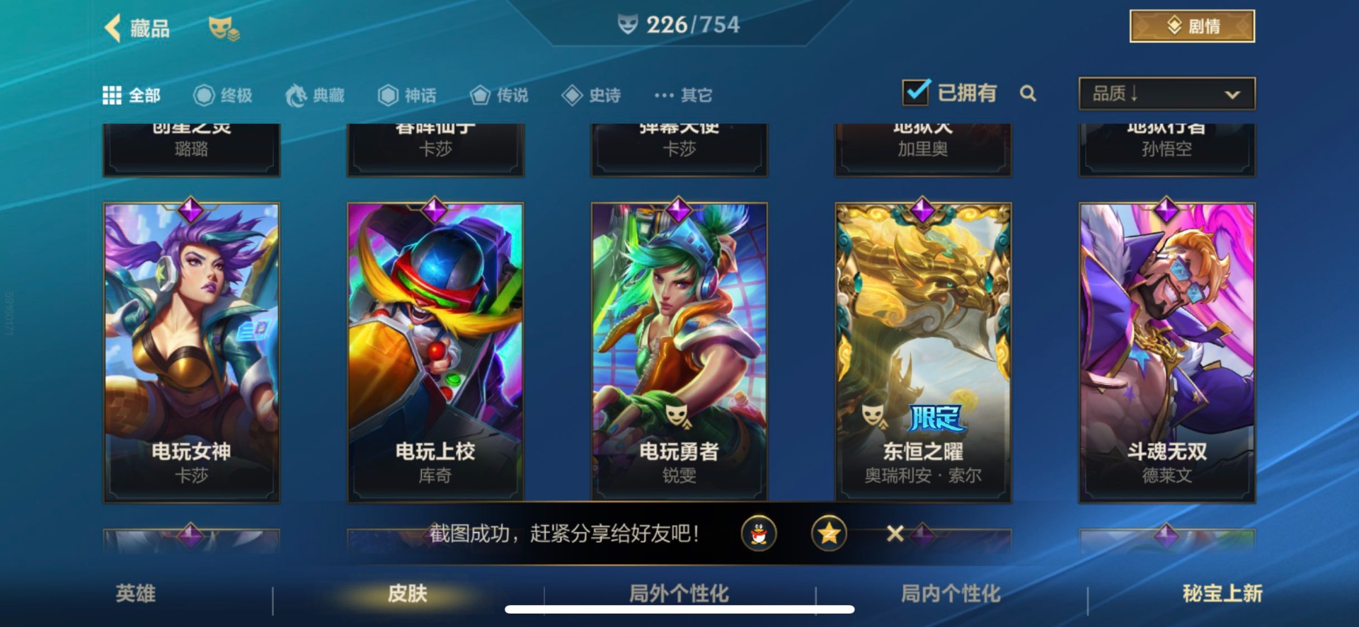 - [11382459]V7 6传说 123英雄 223皮肤 可修改实名 优质装备:一念神魔,地狱火,时之恋人-刘备(电焊工),超时空战士-狄仁杰 珍宝阁皮:妄想食味,玩趣恶龙 限定皮:鸣野蒿,至尊宝,魔法小厨娘,时雨天司(水龙头),飞衡(韩信年限),高山流水,五谷丰年,梁祝,天狼绘梦者,李小龙,大圣娶亲,冰霜恋舞曲 史诗皮:紫霞仙子,电玩小子(小书包),黄金分割率,特工魅影,江河有灵,无限星赏官,偶像歌手,末日机甲-吕布,猫狗日记-孙策,猫狗日记-大乔,乱世虎臣,节奏热浪,修罗,女仆咖啡,水果甜心,绅士熊喵,天才门将,星夜王子,心灵骇客,功夫厨神,德古拉伯爵,暗隐猎兽者,幽灵船长,鬼剑武藏,暗渊魔法,心灵战警,地狱岩魂,纤云弄巧,缤纷独角兽,乘风破浪,逐浪之夏,水晶猎龙者,曙光守护者,箭羽风息,金属风暴,圣诞狂欢,圣诞恋歌,鹰眼统帅,魅力维加斯,未来纪元-赵云