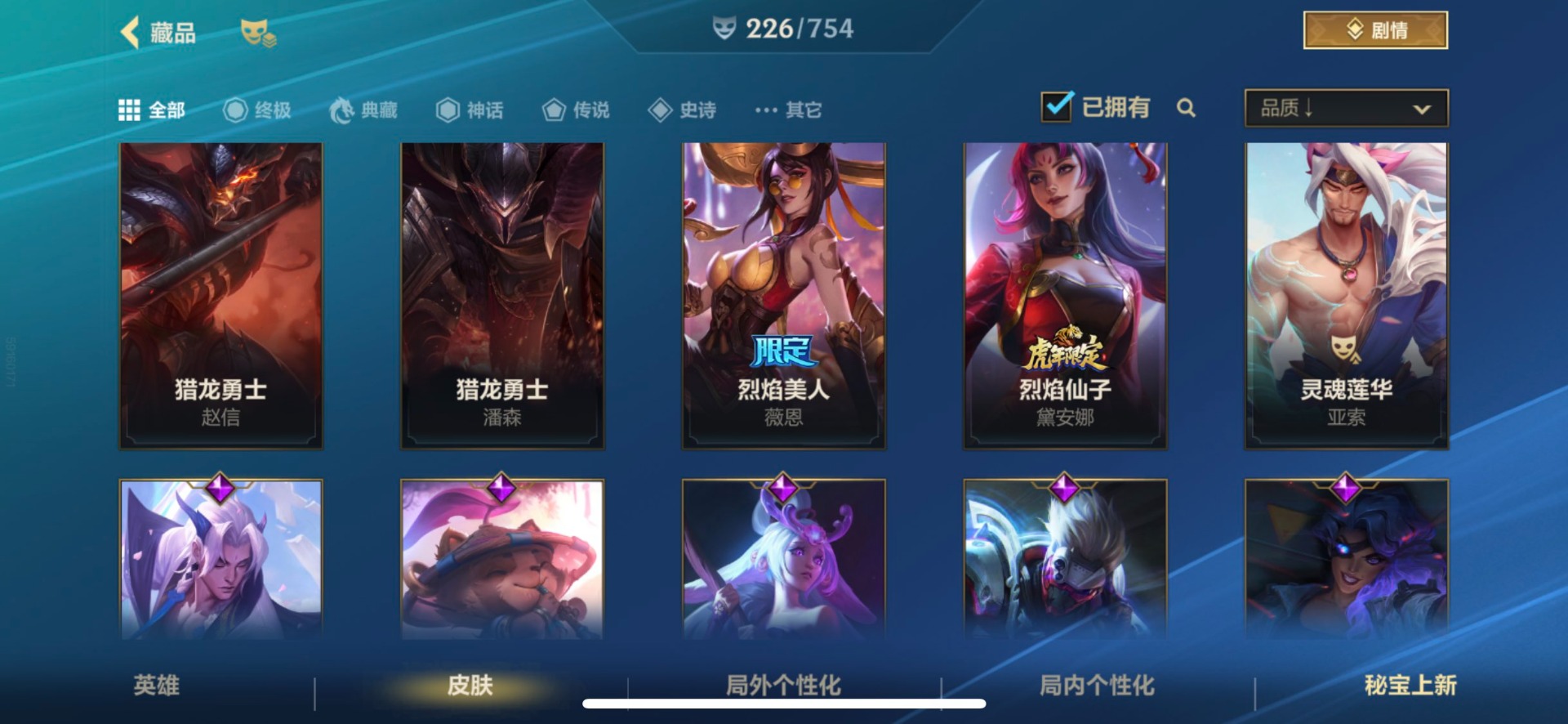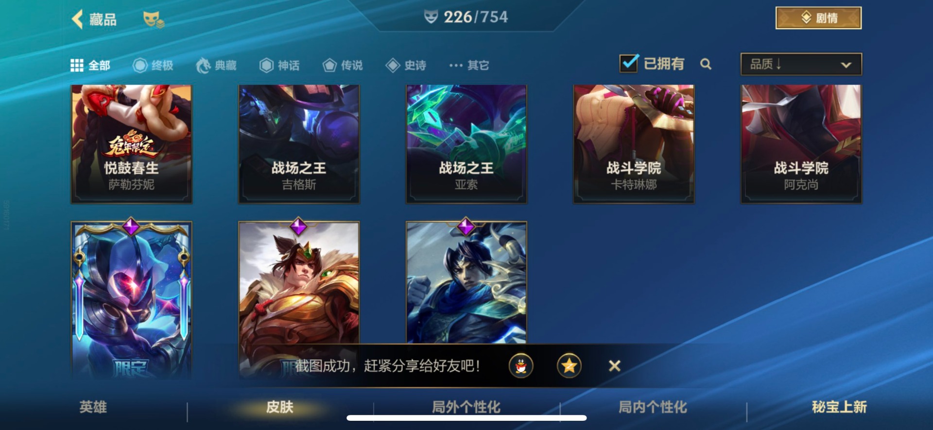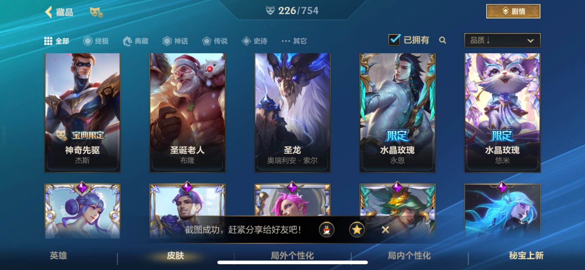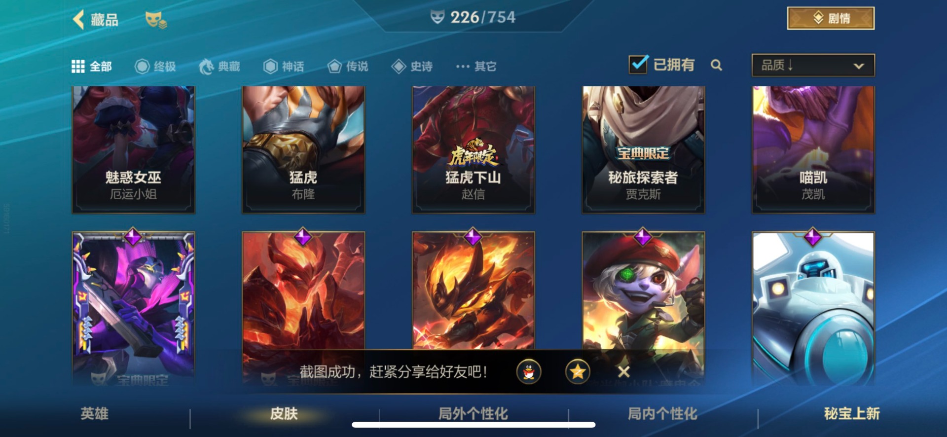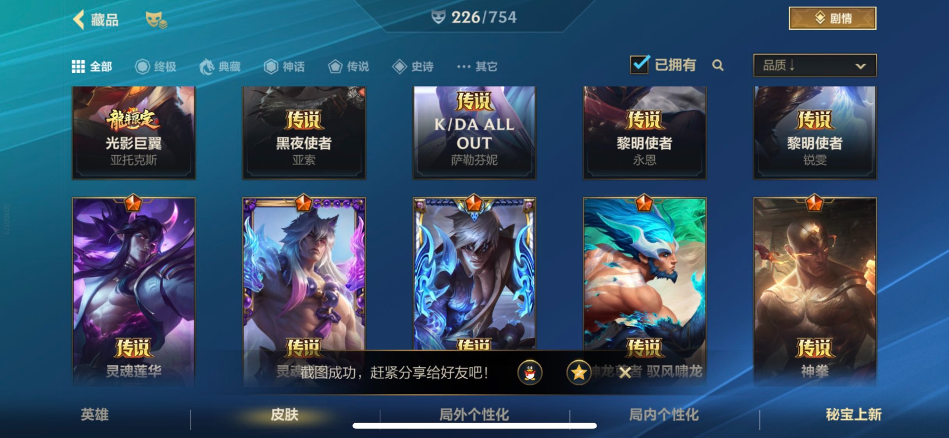 - [11382459]V7 6传说 123英雄 223皮肤 可修改实名 优质装备:一念神魔,地狱火,时之恋人-刘备(电焊工),超时空战士-狄仁杰 珍宝阁皮:妄想食味,玩趣恶龙 限定皮:鸣野蒿,至尊宝,魔法小厨娘,时雨天司(水龙头),飞衡(韩信年限),高山流水,五谷丰年,梁祝,天狼绘梦者,李小龙,大圣娶亲,冰霜恋舞曲 史诗皮:紫霞仙子,电玩小子(小书包),黄金分割率,特工魅影,江河有灵,无限星赏官,偶像歌手,末日机甲-吕布,猫狗日记-孙策,猫狗日记-大乔,乱世虎臣,节奏热浪,修罗,女仆咖啡,水果甜心,绅士熊喵,天才门将,星夜王子,心灵骇客,功夫厨神,德古拉伯爵,暗隐猎兽者,幽灵船长,鬼剑武藏,暗渊魔法,心灵战警,地狱岩魂,纤云弄巧,缤纷独角兽,乘风破浪,逐浪之夏,水晶猎龙者,曙光守护者,箭羽风息,金属风暴,圣诞狂欢,圣诞恋歌,鹰眼统帅,魅力维加斯,未来纪元-赵云