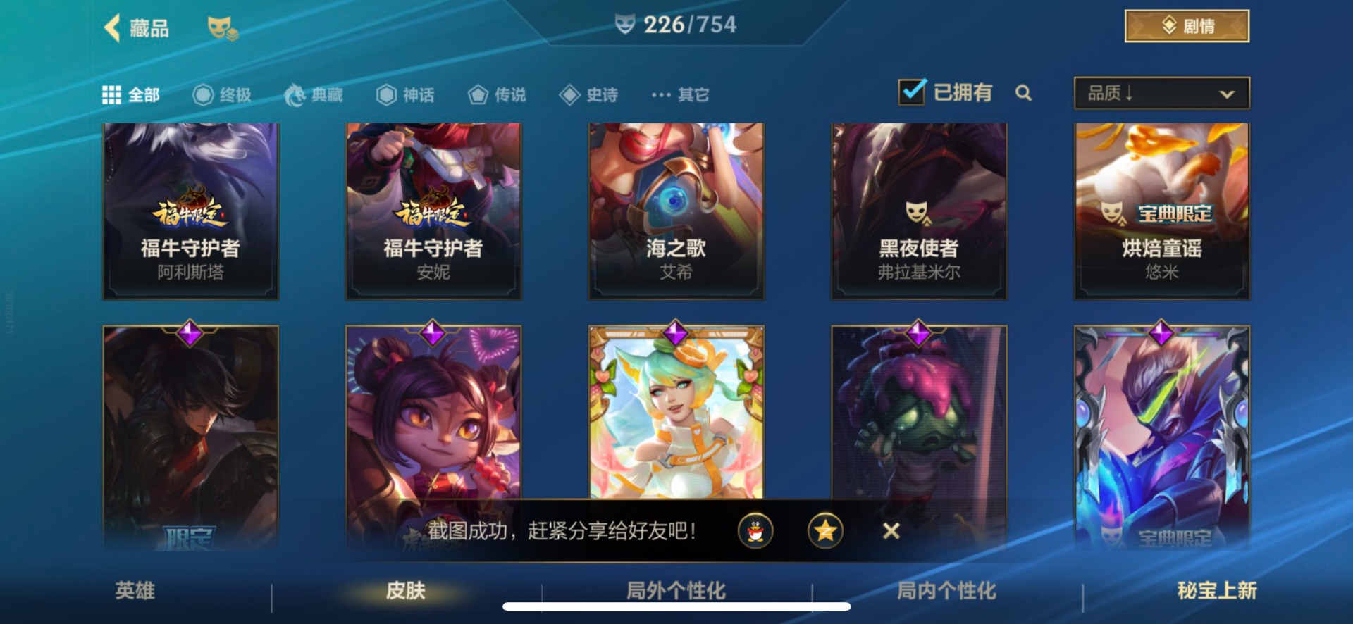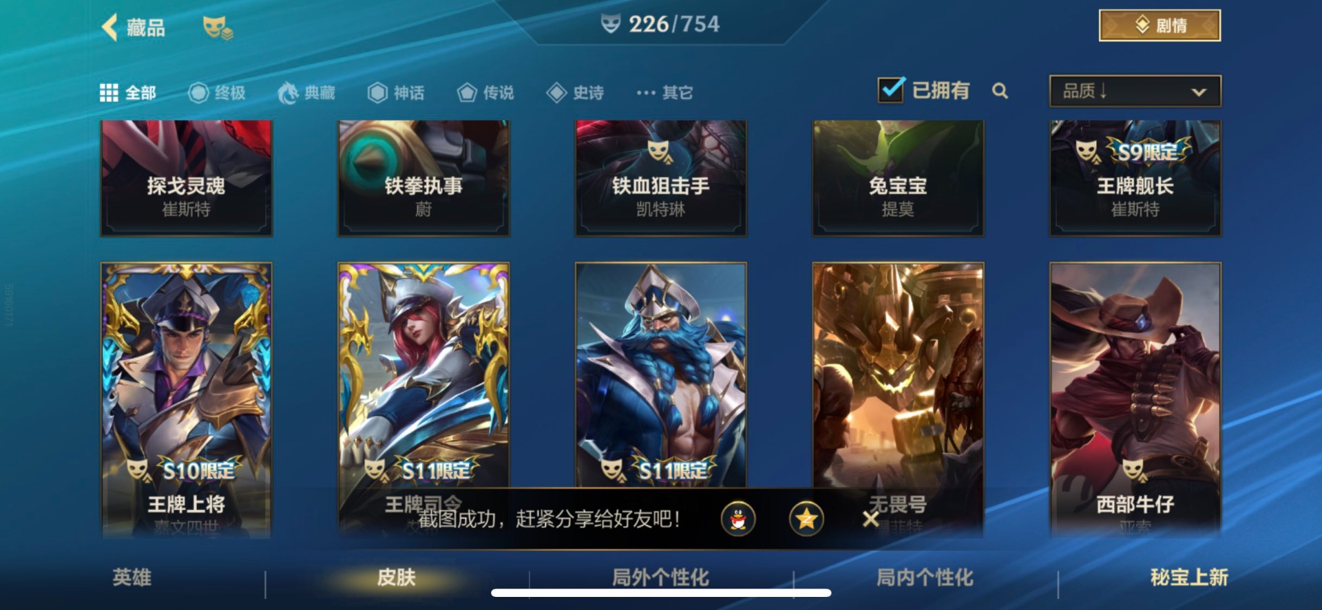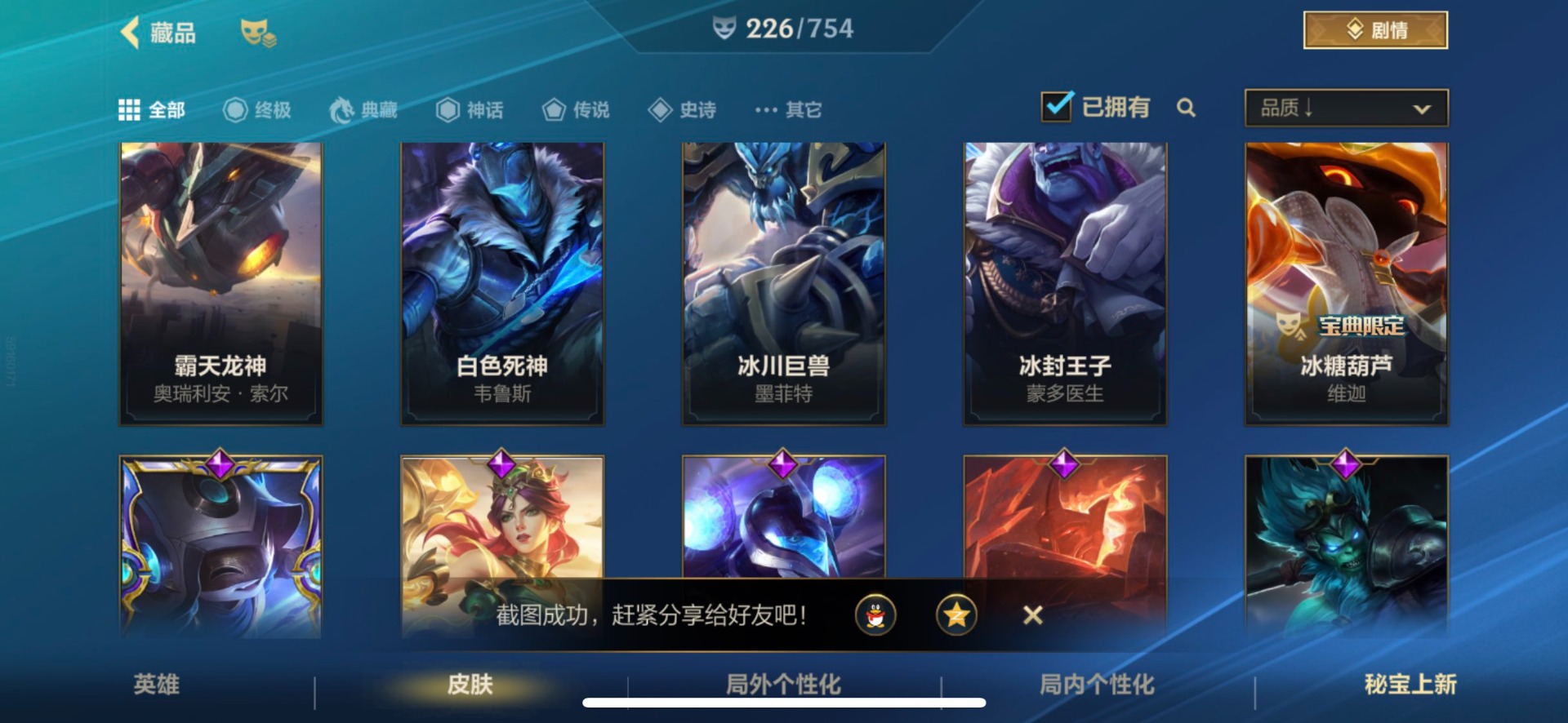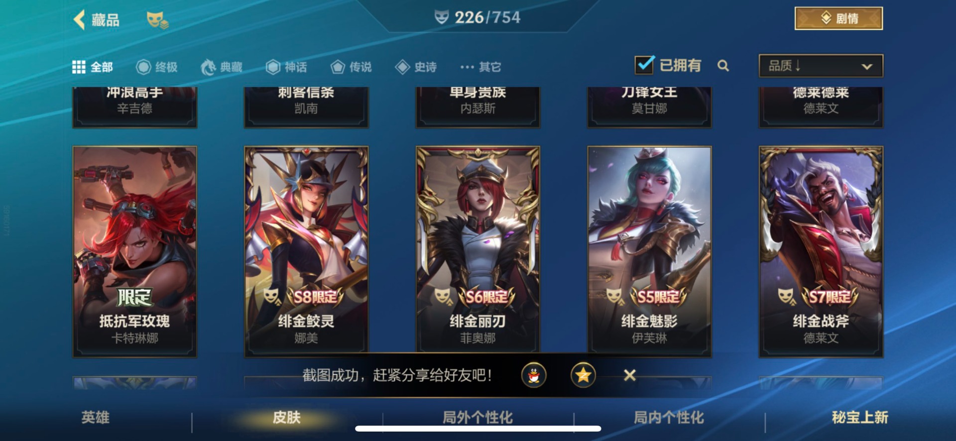- [11382459]V7 6传说 123英雄 223皮肤 可修改实名 优质装备:一念神魔,地狱火,时之恋人-刘备(电焊工),超时空战士-狄仁杰 珍宝阁皮:妄想食味,玩趣恶龙 限定皮:鸣野蒿,至尊宝,魔法小厨娘,时雨天司(水龙头),飞衡(韩信年限),高山流水,五谷丰年,梁祝,天狼绘梦者,李小龙,大圣娶亲,冰霜恋舞曲 史诗皮:紫霞仙子,电玩小子(小书包),黄金分割率,特工魅影,江河有灵,无限星赏官,偶像歌手,末日机甲-吕布,猫狗日记-孙策,猫狗日记-大乔,乱世虎臣,节奏热浪,修罗,女仆咖啡,水果甜心,绅士熊喵,天才门将,星夜王子,心灵骇客,功夫厨神,德古拉伯爵,暗隐猎兽者,幽灵船长,鬼剑武藏,暗渊魔法,心灵战警,地狱岩魂,纤云弄巧,缤纷独角兽,乘风破浪,逐浪之夏,水晶猎龙者,曙光守护者,箭羽风息,金属风暴,圣诞狂欢,圣诞恋歌,鹰眼统帅,魅力维加斯,未来纪元-赵云