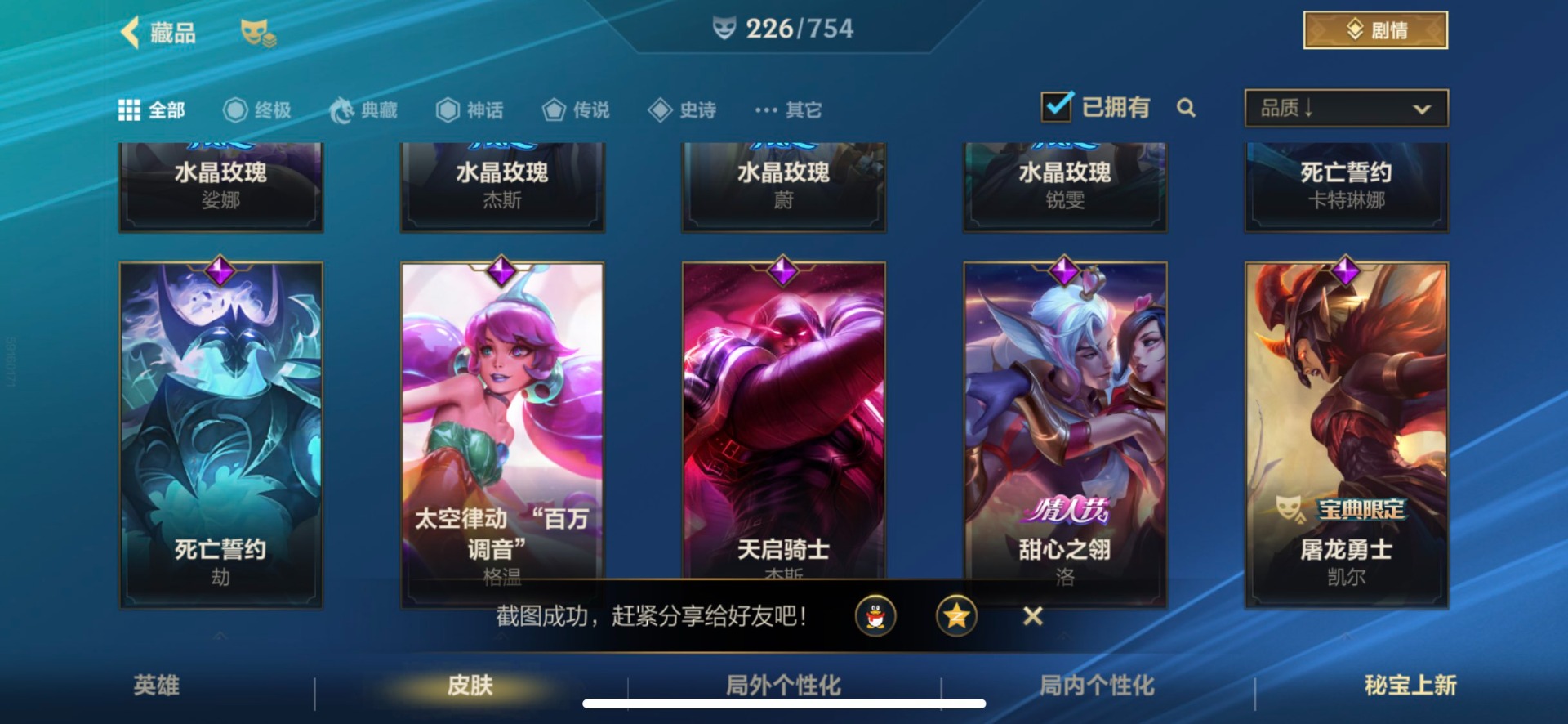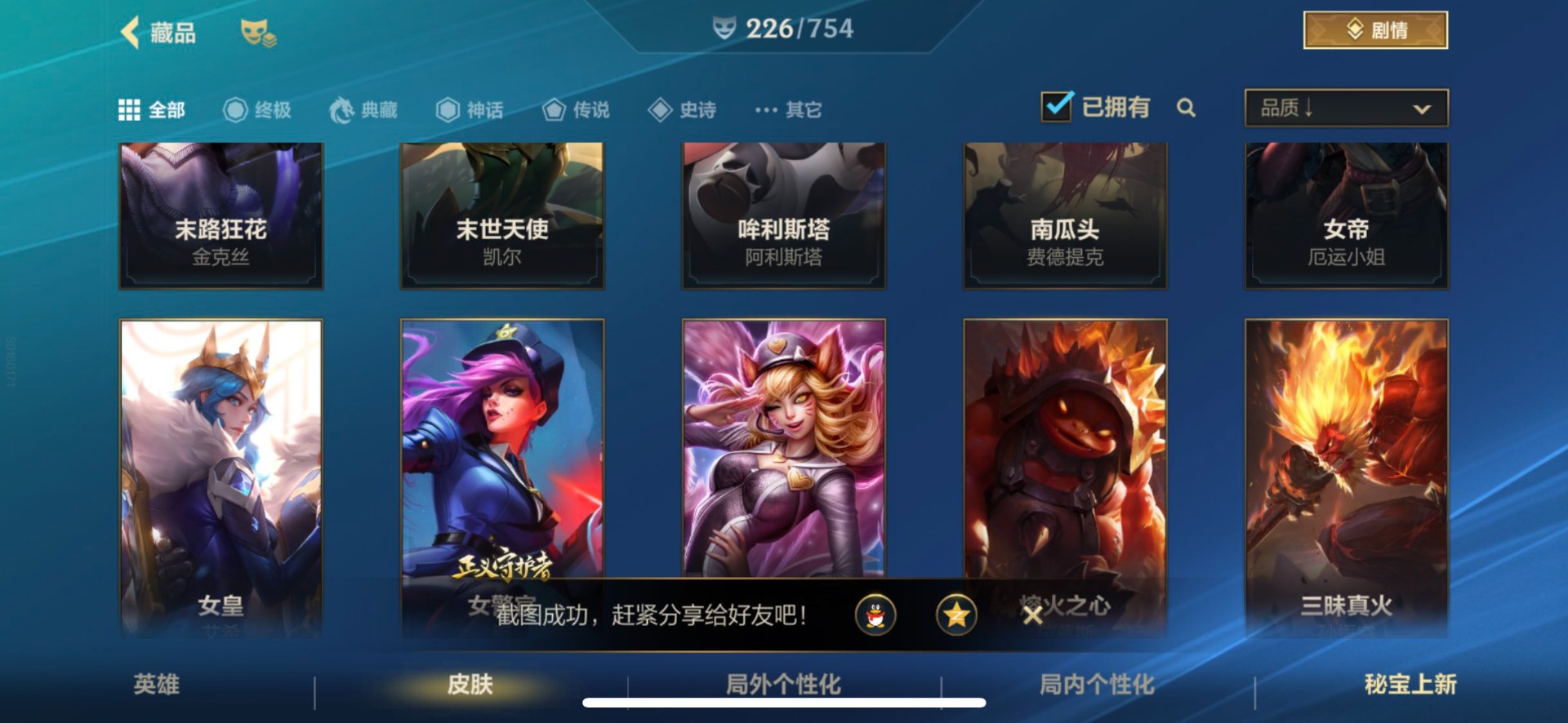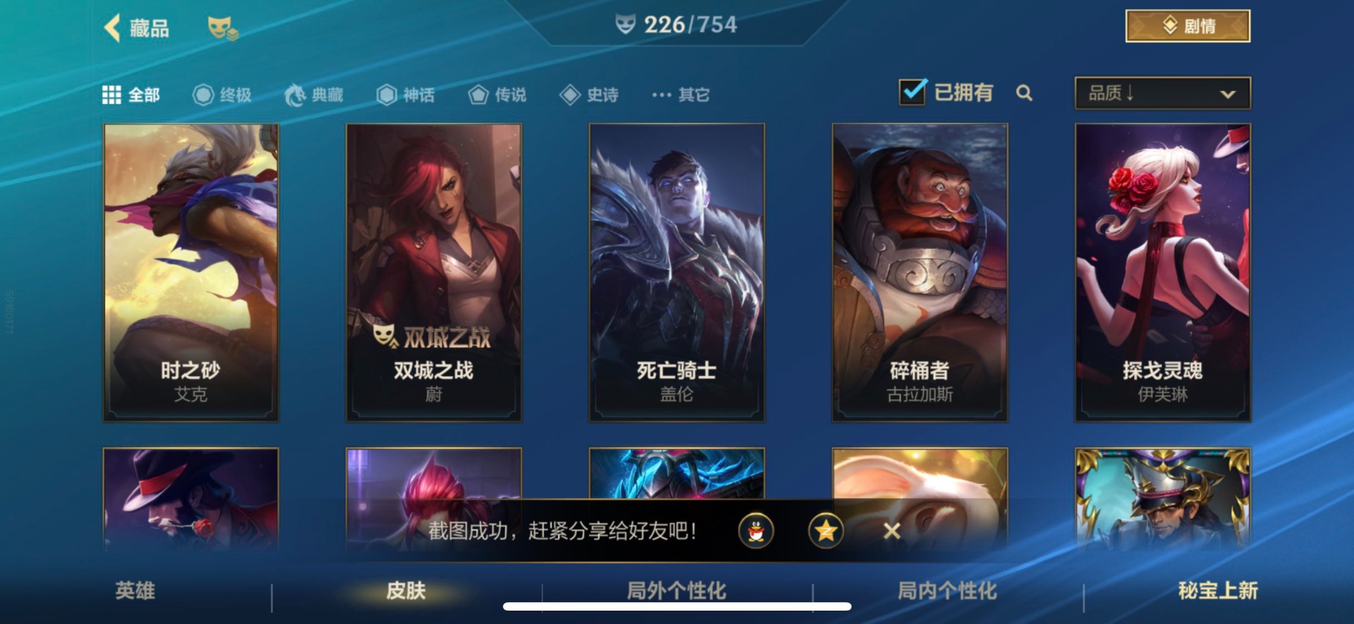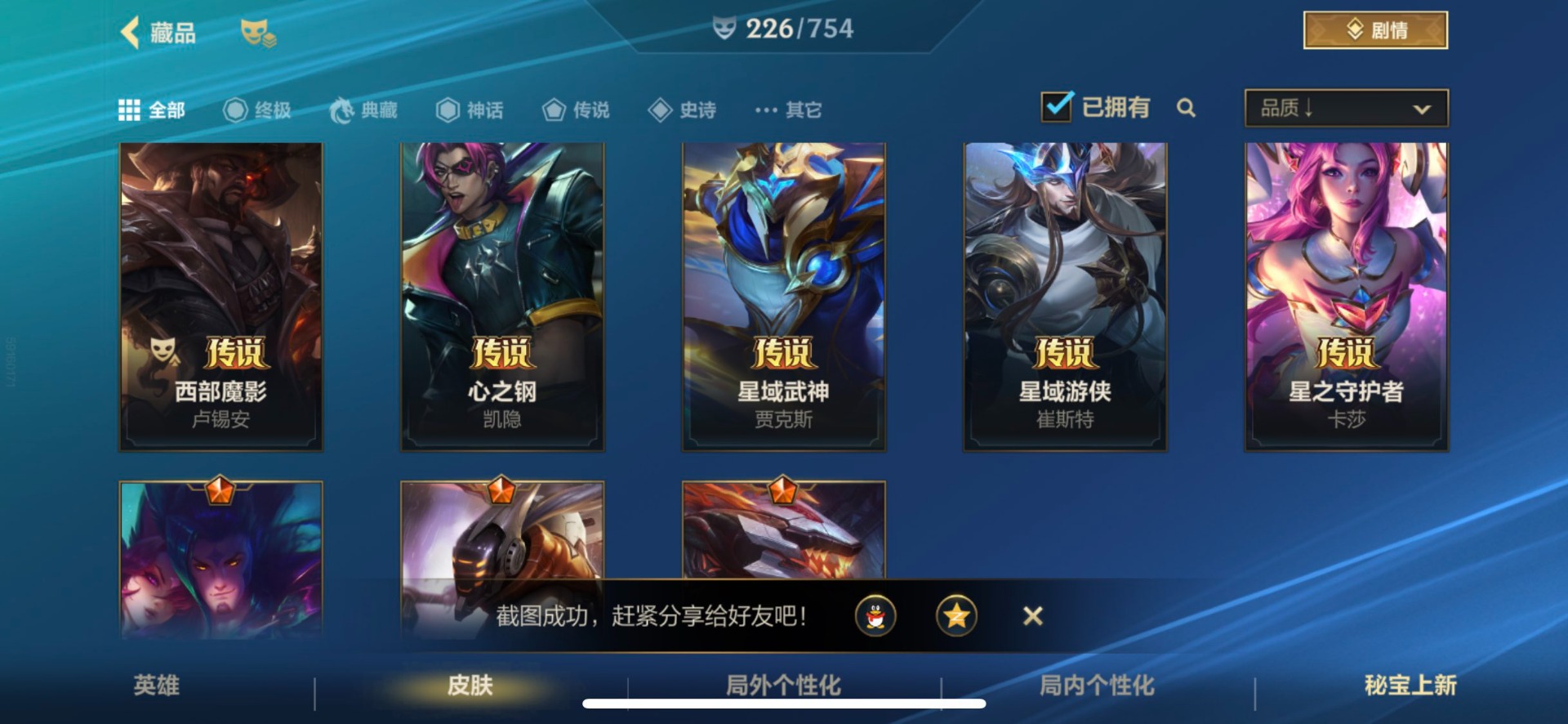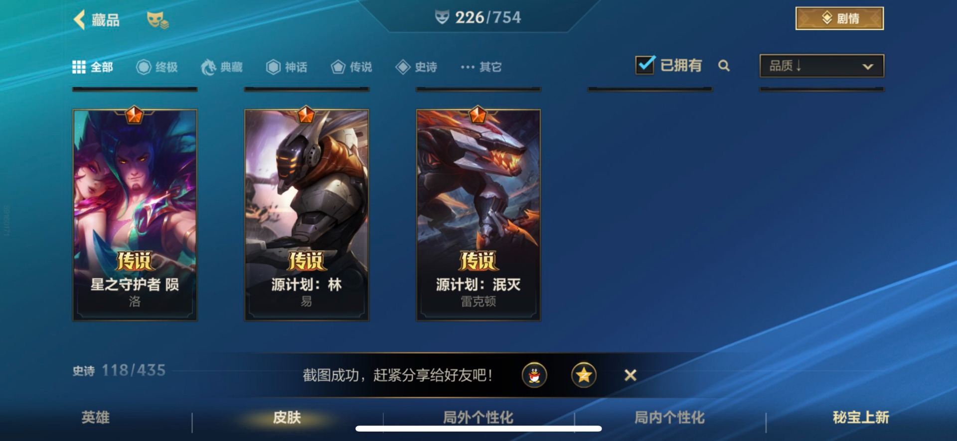 - [11382459]V7 6传说 123英雄 223皮肤 可修改实名 优质装备:一念神魔,地狱火,时之恋人-刘备(电焊工),超时空战士-狄仁杰 珍宝阁皮:妄想食味,玩趣恶龙 限定皮:鸣野蒿,至尊宝,魔法小厨娘,时雨天司(水龙头),飞衡(韩信年限),高山流水,五谷丰年,梁祝,天狼绘梦者,李小龙,大圣娶亲,冰霜恋舞曲 史诗皮:紫霞仙子,电玩小子(小书包),黄金分割率,特工魅影,江河有灵,无限星赏官,偶像歌手,末日机甲-吕布,猫狗日记-孙策,猫狗日记-大乔,乱世虎臣,节奏热浪,修罗,女仆咖啡,水果甜心,绅士熊喵,天才门将,星夜王子,心灵骇客,功夫厨神,德古拉伯爵,暗隐猎兽者,幽灵船长,鬼剑武藏,暗渊魔法,心灵战警,地狱岩魂,纤云弄巧,缤纷独角兽,乘风破浪,逐浪之夏,水晶猎龙者,曙光守护者,箭羽风息,金属风暴,圣诞狂欢,圣诞恋歌,鹰眼统帅,魅力维加斯,未来纪元-赵云