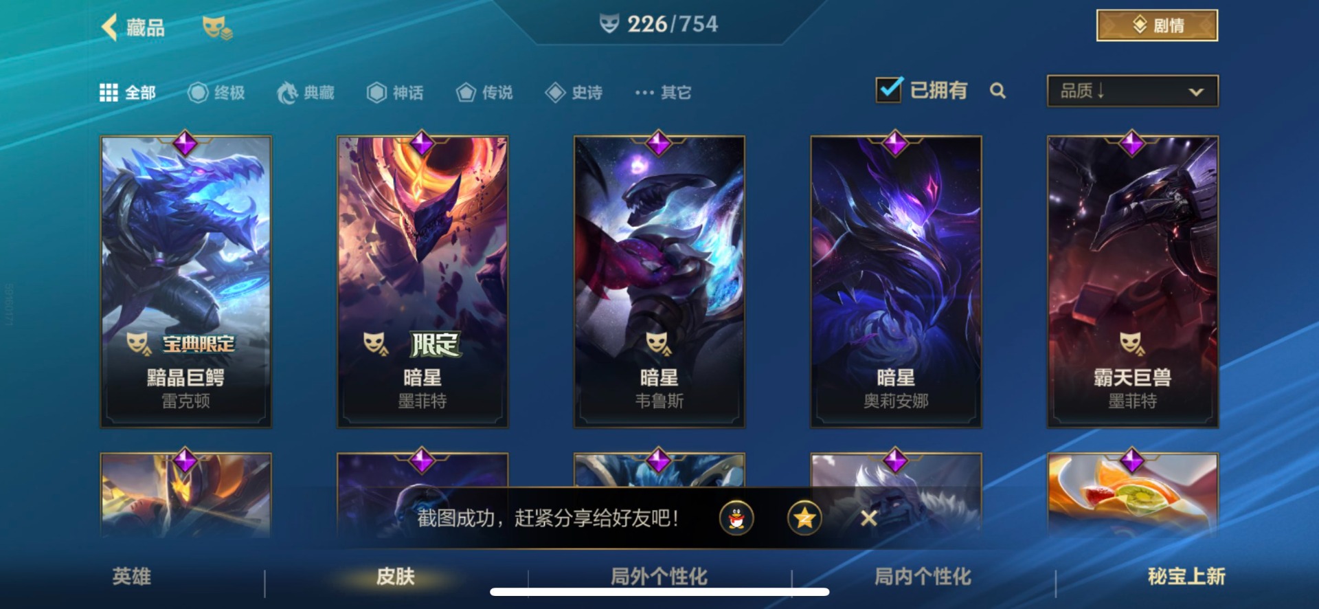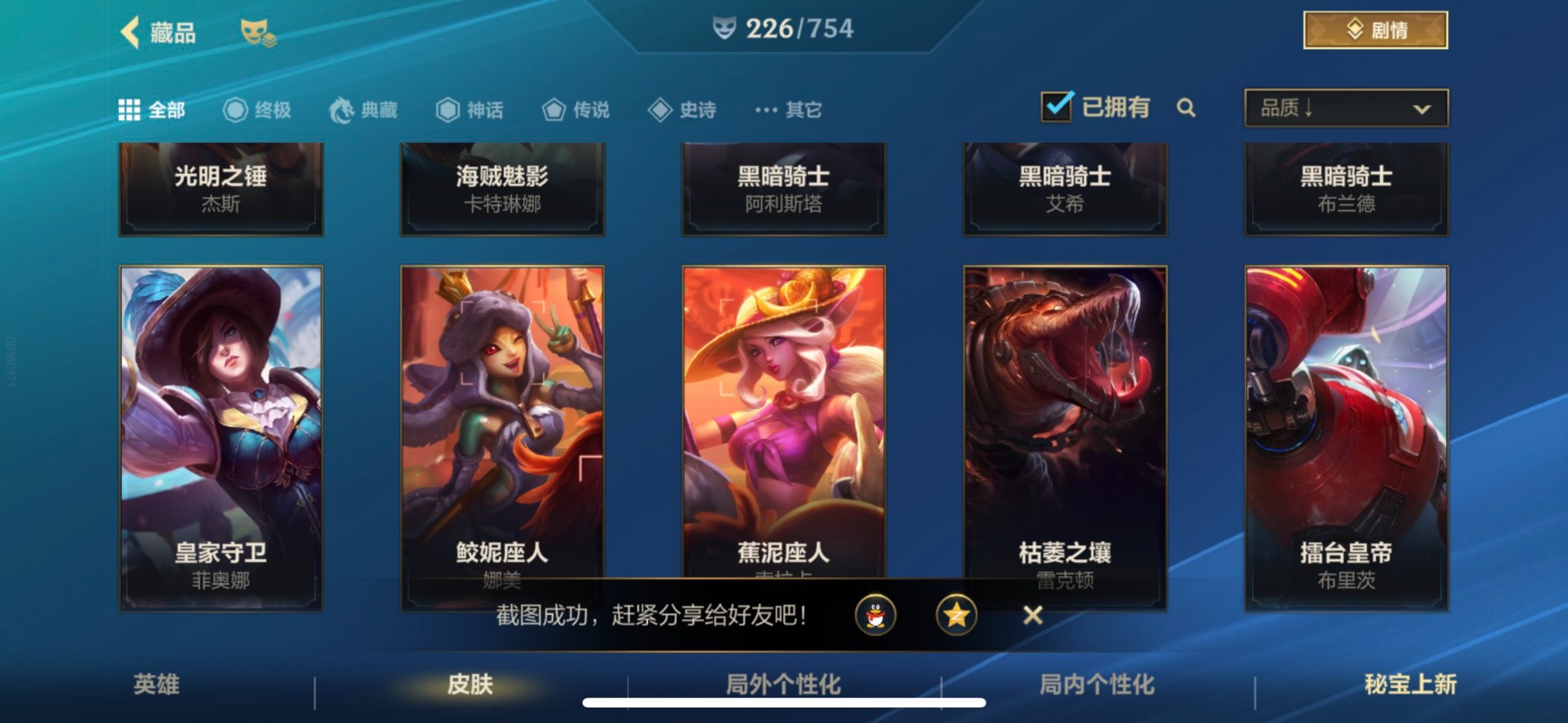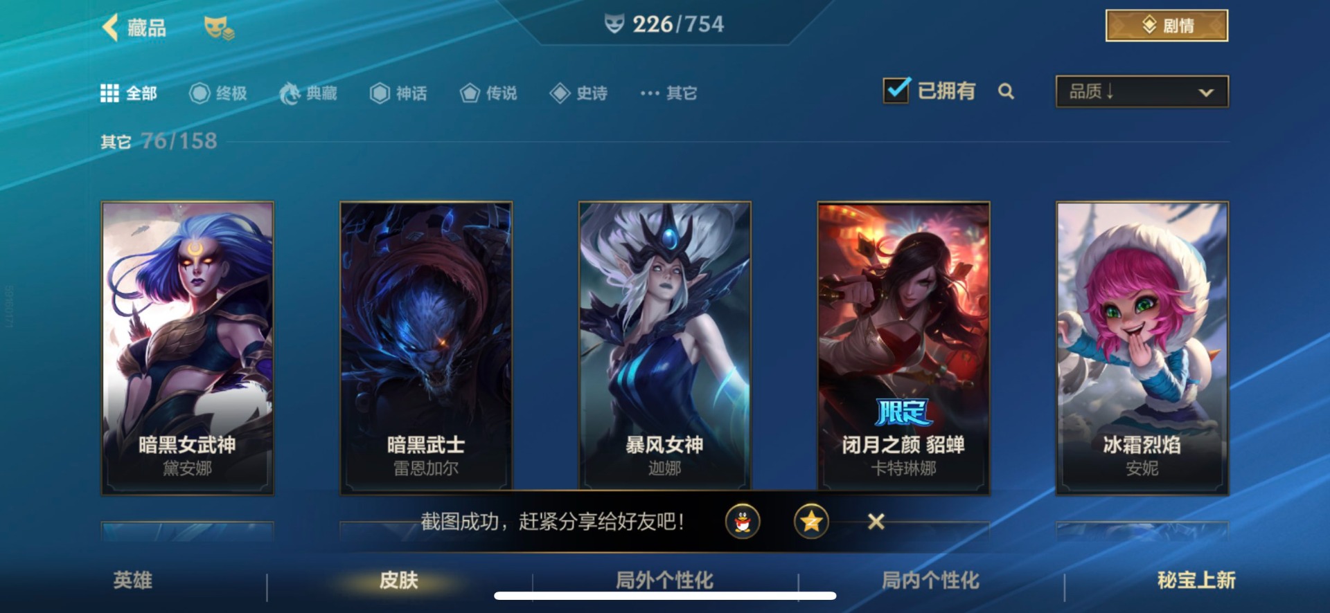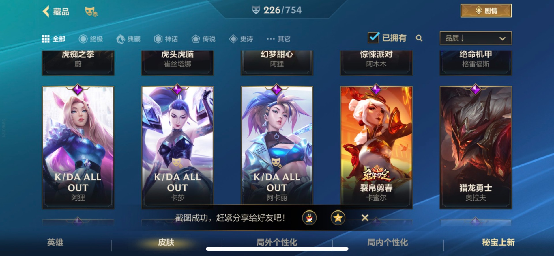 - [11382459]V7 6传说 123英雄 223皮肤 可修改实名 优质装备:一念神魔,地狱火,时之恋人-刘备(电焊工),超时空战士-狄仁杰 珍宝阁皮:妄想食味,玩趣恶龙 限定皮:鸣野蒿,至尊宝,魔法小厨娘,时雨天司(水龙头),飞衡(韩信年限),高山流水,五谷丰年,梁祝,天狼绘梦者,李小龙,大圣娶亲,冰霜恋舞曲 史诗皮:紫霞仙子,电玩小子(小书包),黄金分割率,特工魅影,江河有灵,无限星赏官,偶像歌手,末日机甲-吕布,猫狗日记-孙策,猫狗日记-大乔,乱世虎臣,节奏热浪,修罗,女仆咖啡,水果甜心,绅士熊喵,天才门将,星夜王子,心灵骇客,功夫厨神,德古拉伯爵,暗隐猎兽者,幽灵船长,鬼剑武藏,暗渊魔法,心灵战警,地狱岩魂,纤云弄巧,缤纷独角兽,乘风破浪,逐浪之夏,水晶猎龙者,曙光守护者,箭羽风息,金属风暴,圣诞狂欢,圣诞恋歌,鹰眼统帅,魅力维加斯,未来纪元-赵云