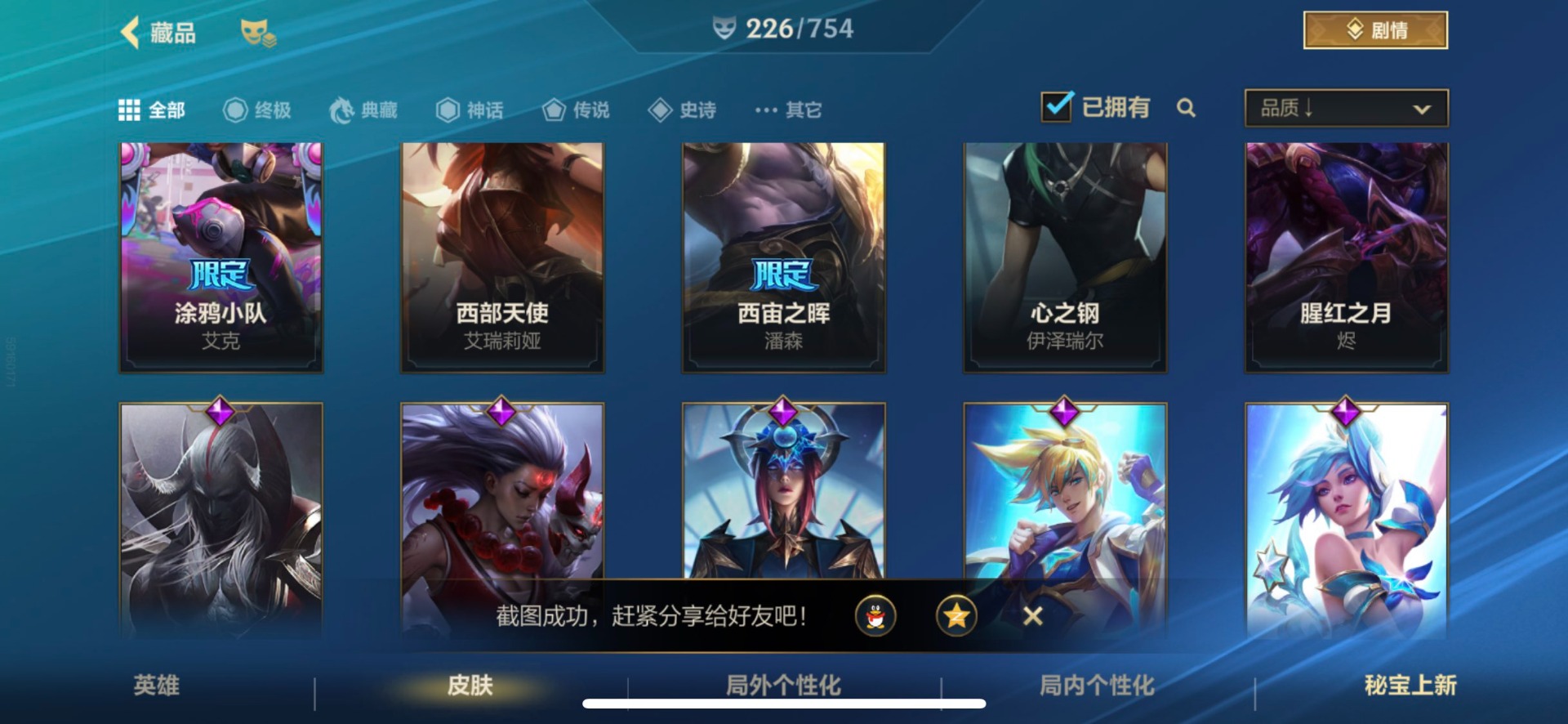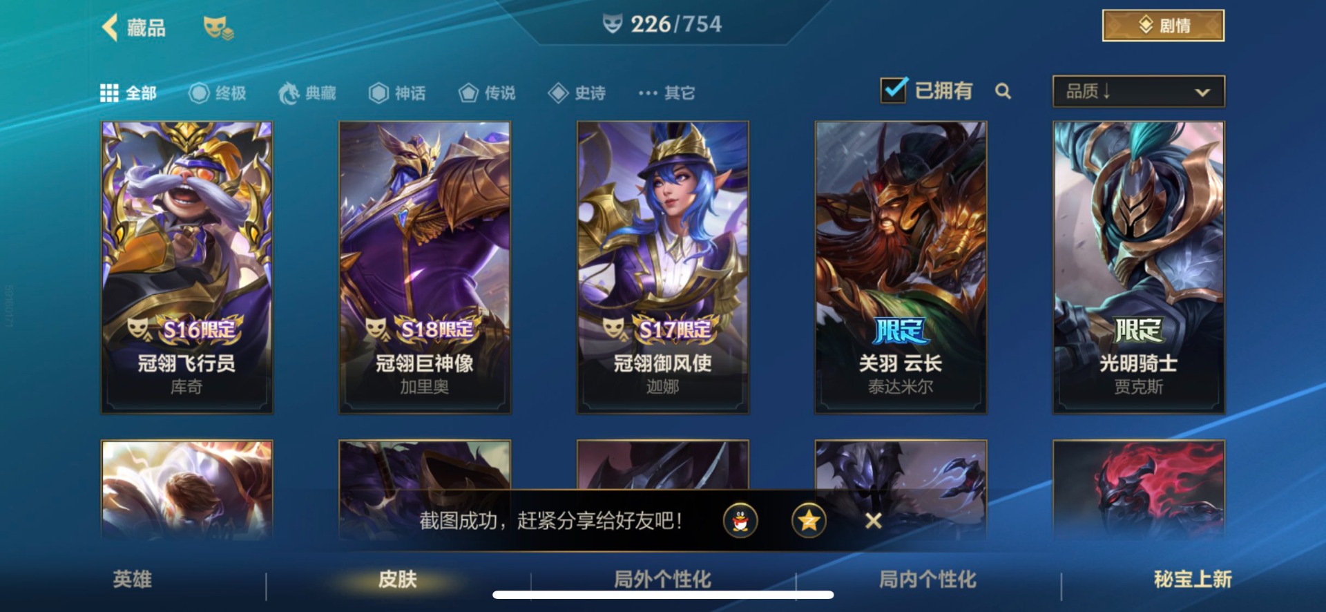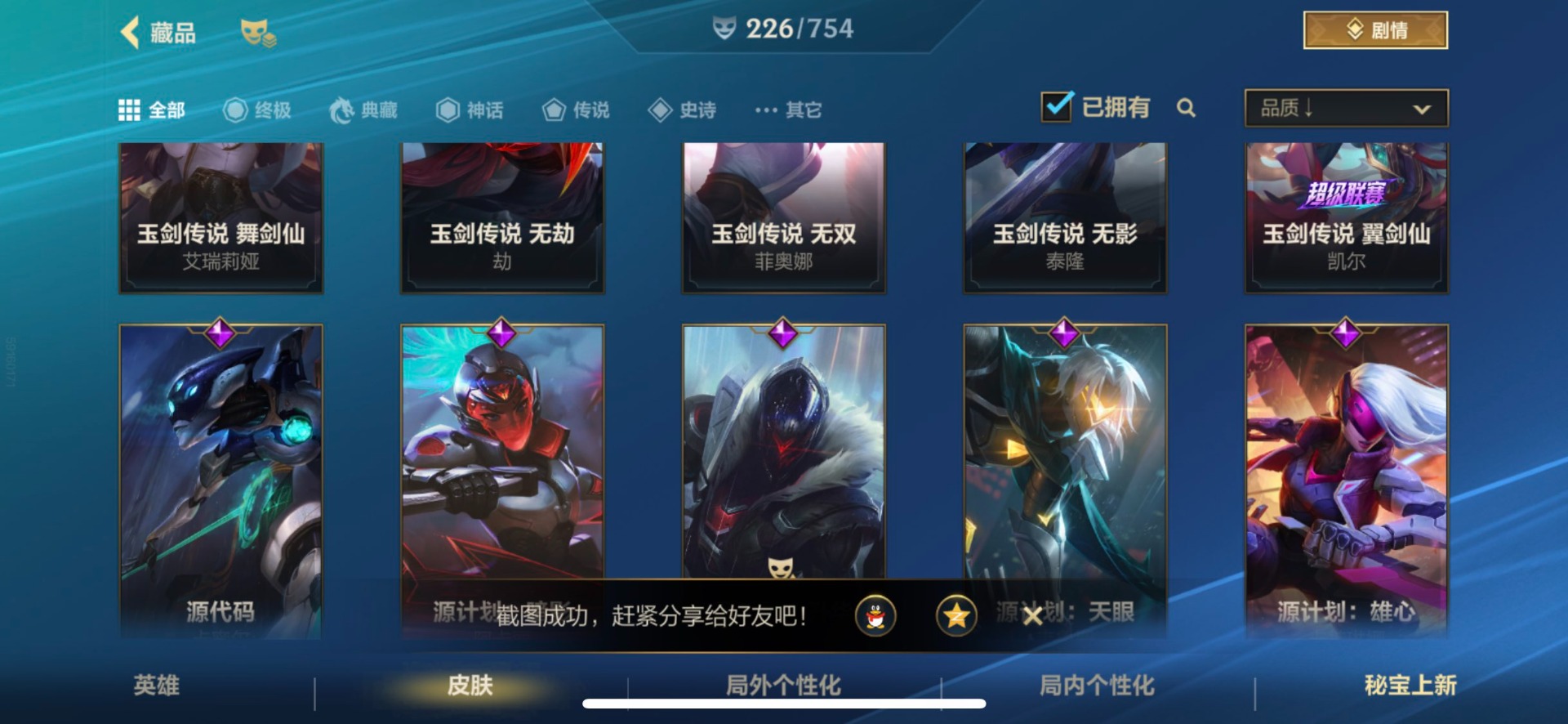 - [12148018]V7 5传说 94英雄 86皮肤 可修改实名 优质装备:久胜战神,一念神魔,山海·苍雷引(电光曜子),涂山容容 限定皮:至尊宝,诗剑行,齐天大圣,降魔,山海·玄木吟(马可年限) 史诗皮:龙之律动,百相守梦-周瑜,百相守梦-黄忠,白龙吟,千年之狐,冰冠公主,末日机甲-吕布,时之恋人-孙尚香,修罗,水果甜心,鬼剑武藏,箭羽风息,唤灵魅影,金属风暴,圣诞恋歌,鹰眼统帅,魅力维加斯,赏金猎手,无心,未来纪元-赵云