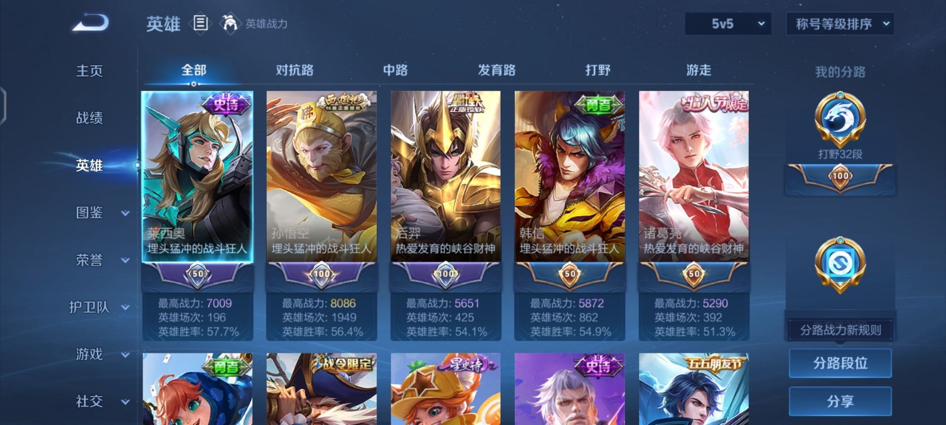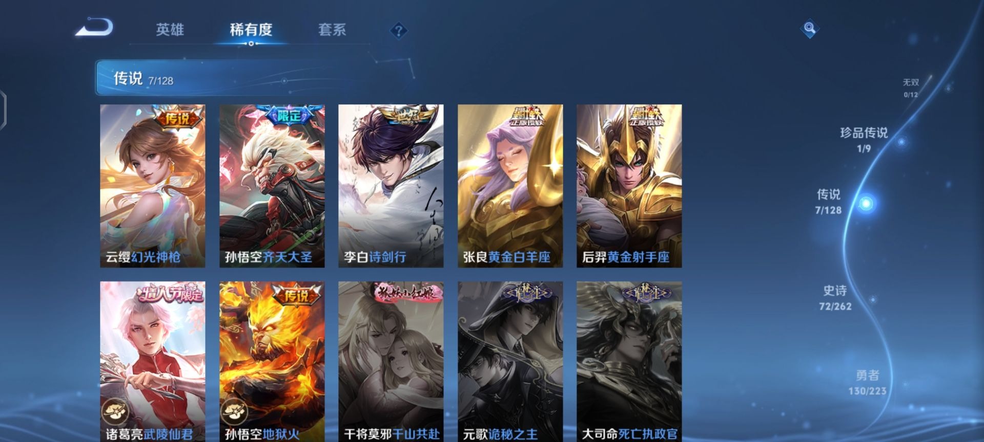 - 苹果微信 可二次 贵族10 段位无双王者 皮肤价值835706 英雄数量126 皮肤数量643 荣耀水晶16 传说皮肤111 珍品0 限定皮肤91 无双皮肤8 内测4 赛季皮肤28 史诗皮肤98 普通皮肤57 其他355