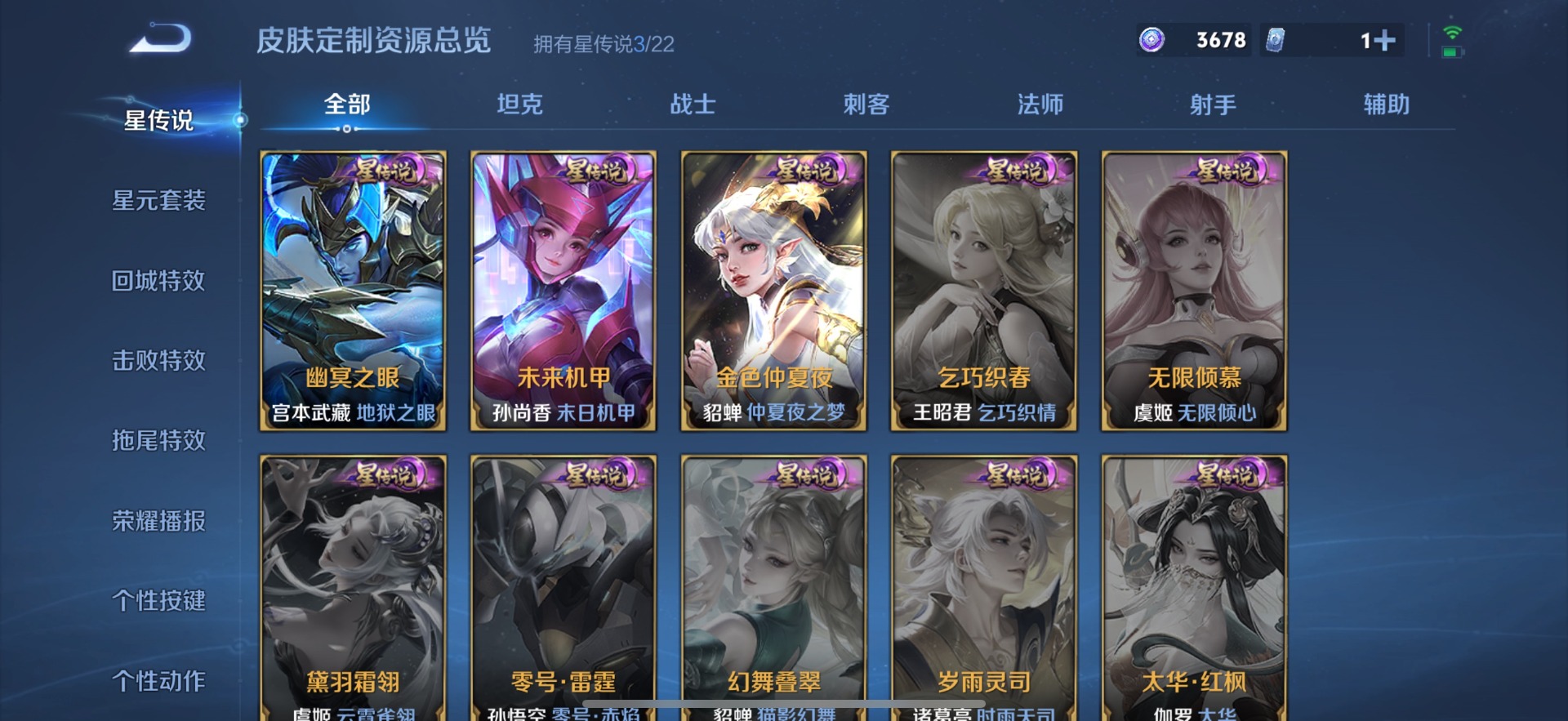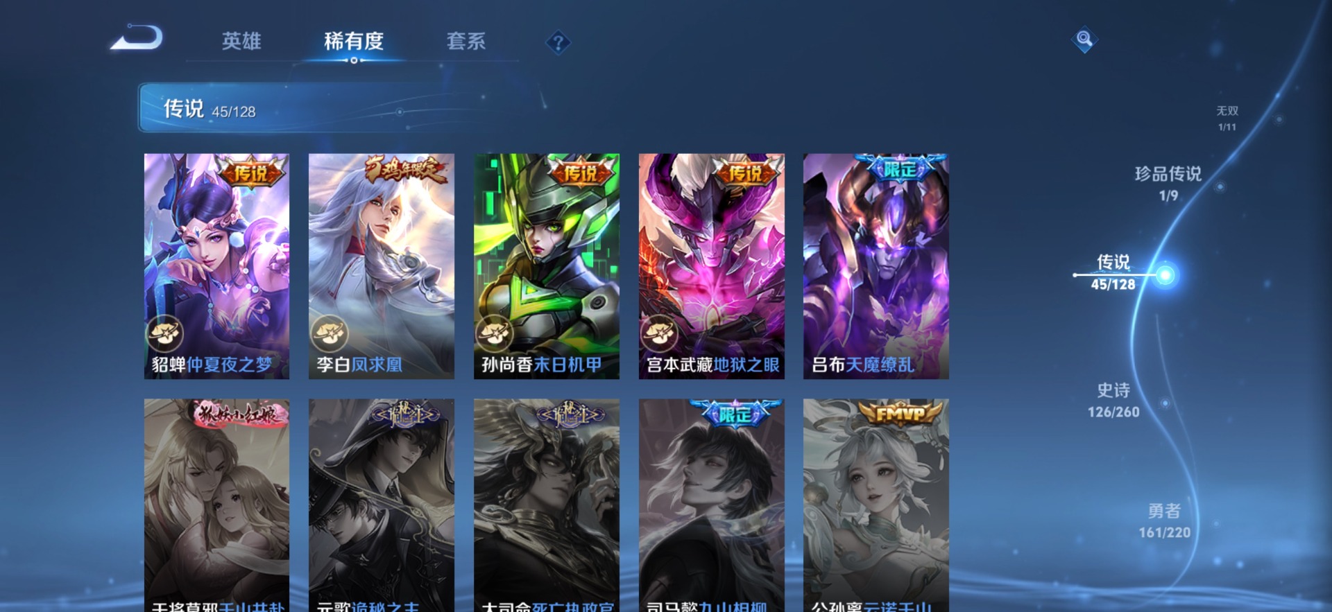 金蝉唐三藏,黄忠烈魂,哪吒逐梦之翼,伽罗天狼溯光者,伽罗太华,张飞虎魄,赵云龙胆,干将莫邪冰霜恋舞曲,小乔纯白花嫁,孙尚香异界灵契,不知火舞绯月行,鲁班七号乒乒小将,鲁班七号寅虎·瑞焰,后羿无尽星芒,吕布御风骁将,后羿辉光之辰,诸葛亮时雨天司,公孙离祈雪灵祝,司空震愿照·山河定,兰陵王影龙天霄,裴擒虎李小龙,裴擒虎天狼狩猎者,上官婉儿梁祝,李白诗剑行,花木兰瑞麟志,马可波罗山海·玄木吟,马可波罗深海之息,猪八戒猪悟能,女娲补天,孙悟空孙行者,孙悟空大圣娶亲,孙悟空至尊宝,马超神威,妲己时之奇旅,韩信傲雪梅枪,韩信飞衡,百里守约朱雀志,蔡文姬奇迹圣诞,瑶山海·碧波行,澜愿照·九州拓,虞姬霸王别姬,娜可露露前尘镜,王昭君星穹之声,关羽武圣,橘右京枫霜尽
