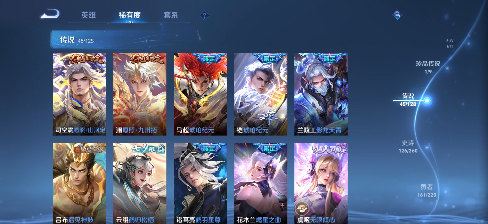 - PX_2055547-安卓V 【可二次】 英雄数量:122 皮肤数量:145 贵族等级:贵族V8 传说数量:0 无双限定1 珍品传说1 传说品质20 史诗品质30碎月剑心 怪盗基德 愿照·千秋盛 愿照·福禄聚 愿照·岁时盈 游龙清影 音你心动女 云霓雀翎 淬星耀世 玄雷天君 幻光神枪 愿照·山河定 愿照·众生和 愿照·九州拓 百相守梦张飞 启明星使 地狱之眼 黄金狮子座 鸣野蒿 逐花归海 乘龙淬吴