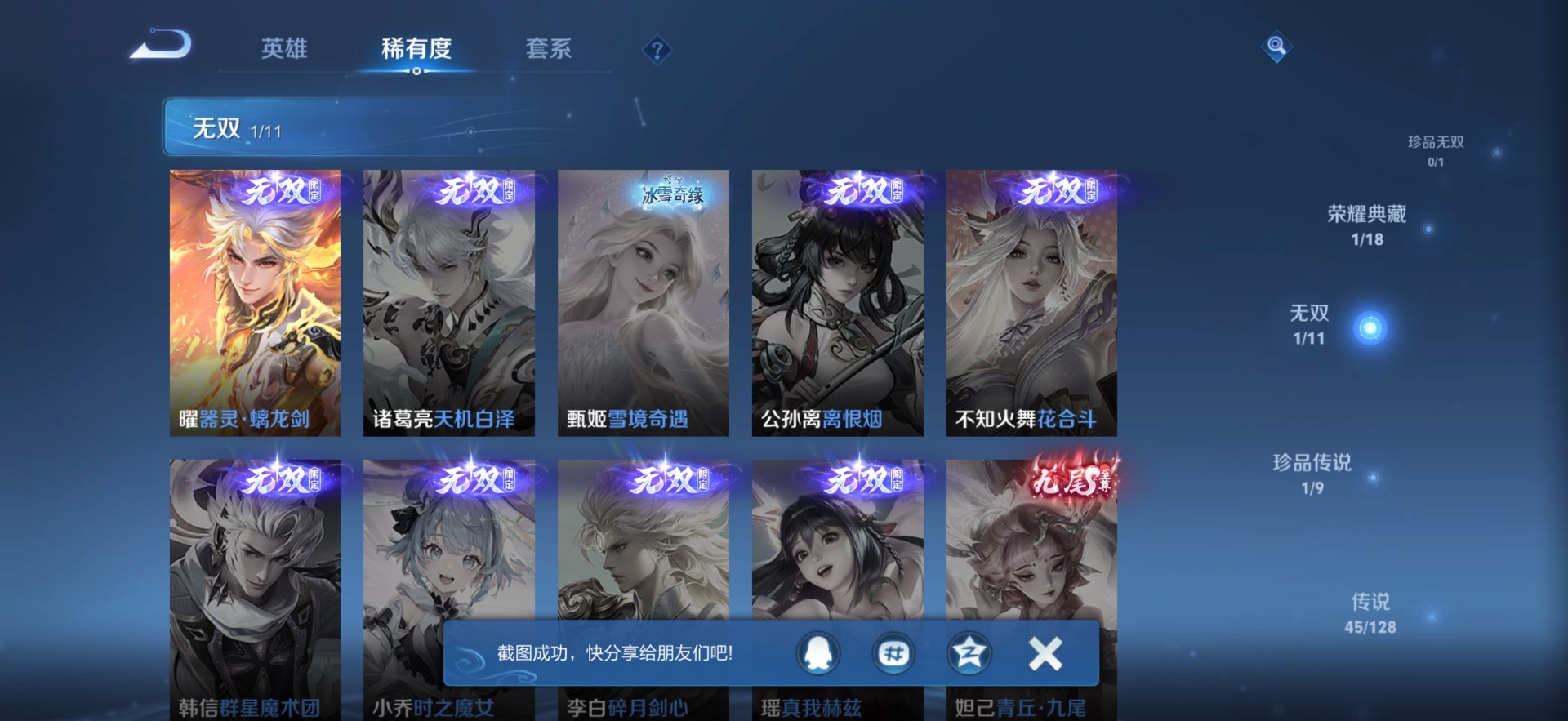 - PX_2103250-[金标雅典娜 金标诸葛亮 妹子号 紫瑶!!!]贵族等级: V6 英雄数: 124 皮肤数: 289 荣耀水晶: 星域神启 无双皮: 青丘·九尾,碎月剑心,小乔时之魔女,韩信群星魔术团 星传说: 时之愿境,金色仲夏夜,玉鸾吟 传说皮: 绛天战甲,猫影幻舞,炽阳神光,一念神魔,云霓雀翎,末日机甲-孙尚香,仲夏夜之梦,乞巧织情,游龙清影,挚爱之约,挚爱花嫁,无双飞将,记忆之芯,青丘