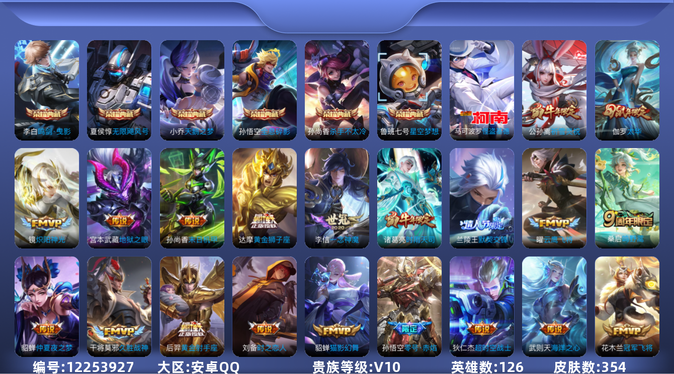 [12253927]V10 6典藏 1珍品传说 27传说 126英雄 354皮肤 典藏英雄武则天 可修改实名 优质装备:天鹅之梦(小乔典藏),星空梦想(太空人),无限飓风号(高达),杀手不太冷,鸣剑·曳影,全息碎影(猴子典藏),怪盗基德,黄金狮子座,黄金射手座,冠军飞将,云鹰飞将(小将军),绛天战甲(鸡嘴战神),黄金白羊座,猫影幻舞,久胜战神,炽阳神光,一念神魔,云霓雀翎,末日机甲-孙尚香(绿蚂蚱),地狱火,仲夏夜之梦(大飞蛾),零号·赤焰,海洋之心,地狱之眼,胖达荣荣,时之恋人-刘备(电焊工),超时空战士-狄仁杰,艾琳觅芳踪 珍宝阁皮:优雅恋人,女武神 限定皮:鸣野蒿,至尊宝,太华(伽罗年限),傲雪梅枪,白鹤梁神女,白晶晶,时雨天司(水龙头),神威(电光马子),遇见飞天,高山流水,五谷丰年,冰锋战神,游园惊梦,梁祝,御风骁将(吕布年限),逐梦之星,天狼溯光者,奔雷神使(牛魔年限),祈雪灵祝(雪兔子),李小龙,逐梦之影,默契交锋-兰陵王,默契交锋-花木兰,猪悟能,大圣娶亲,乒乒小将 史诗皮:灵蛊蚀心,龙之律动,百相守梦-百里守约,遇见神鹿,紫霞仙子,电玩小子(小书包),白龙吟,黄金分割率,特工魅影,千年之狐,江河有灵,魅语,无限星赏官,冰冠公主,青蛇,偶像歌手,白蛇,晚萤,电玩·爆裂旋风,暗夜猫娘,龙骑士(小龙虾),末日机甲-吕布,猫狗日记-孙策,猫狗日记-大乔,乱世虎臣,节奏热浪,修罗,女仆咖啡,摇滚巨星,水果甜心,绅士熊喵,天才门将,星夜王子,心灵骇客,时之奇旅-安琪拉,功夫厨神,德古拉伯爵,暗隐猎兽者,幽灵船长,鬼剑武藏,暗渊魔法,心灵战警,天秀·启明,舞动绿茵,地狱岩魂,诗语江南,繁星吟游(呼啦呼啦),拒霜思,缤纷独角兽,乘风破浪,逐浪之夏,月团寄思,水晶猎龙者,曙光守护者,箭羽风息,金属风暴,原初追逐者,圣诞狂欢,圣诞恋歌,鹰眼统帅,暗夜贵公子,魅力维加斯,黎明之约,未来纪元-赵云