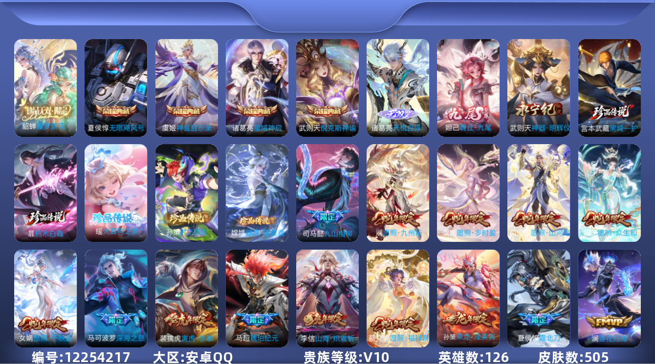 [12254217]V10 4典藏 1珍品无双 3无双 5珍品传说 51传说 126英雄 505皮肤 典藏英雄武则天 可修改实名 优质装备:馥梦繁花,倪克斯神谕(宇宙婆娘),无限飓风号(高达),星域神启(倪克斯贼亮),神器·明辉仪,青丘·九尾(妲己无双),神鉴启示录,天机白泽,器灵·落星盏,大耳狗之梦,朽木白哉,黑崎一护,黄金射手座,云鹰飞将(小将军),绛天战甲(鸡嘴战神),黄金白羊座,猫影幻舞,炽阳神光,一念神魔,地狱火,仲夏夜之梦(大飞蛾),零号·赤焰,海洋之心,地狱之眼,音你心动-周瑜,游龙清影(小青龙),淬星耀世,超时空战士-狄仁杰,音你闪耀(rap皮),碎云,神器·明辉仪,山海·炽霜斩(李信年限),炽翼辉光(娃娃菜牛角包),青丘·九尾,鹤羽星尊,妄想实况,澜逐花归海,艾琳觅芳踪,琥珀纪元马超,金乌负日,黄金天蝎座,涂山容容 珍品传说:时之奇旅-孙策 传说皮:乘龙·问璇玑(孙尚香年限),乘龙·铭钟鼎(赵云年限),乘龙·淬吴钩(孙策年限),貂蝉曦玄引,典韦战鼓燎原,九山相柳,幻光神枪 珍宝阁皮:万物之道,优雅恋人,蔷薇恋人,玩趣恶龙 限定皮:愿照·九州拓(澜年限),愿照·福禄聚(蔡文姬年限),愿照·岁时盈(虞姬年限),愿照·山河定(司空震年限),愿照·众生和(妲己年限),愿照·千秋盛(女娲年限),逐霄战戟,陌上桑,鸣野蒿,夏侯惇霜北刀,武陵仙君(小桃花),寅虎·展翼(孙膑年限),绯月行,白晶晶,时雨天司(水龙头),遇见飞天,高山流水,齐天大圣,匿光决锋者,降魔,五谷丰年,冰锋战神,游园惊梦,梁祝,天狼狩猎者,逐梦之星,岱宗(典韦年限),天狼溯光者,李小龙,如梦令-后羿,默契交锋-花木兰,孙行者,猪悟能,大圣娶亲,引擎之心,美猴王,寅虎·赤拳(老虎年限),启示之音,无尽星芒,深海之息(深海大菠萝),梦圆繁星,山海·玄木吟(马可年限) 史诗皮:鸭鸭历险记-刘禅,苍鳞隐世,化蝶舞,灵蛊蚀心,龙之律动,石田雨龙,百相守梦-周瑜,茶境仙,幻珠鲛人,怒海争锋,撼地雄心,破空之剑,战舞者,埋骨钱,芈月浮光幕影,海诺心动手记,琥珀纪元伽罗,决胜骁骑,蔬乡物语(鲁班七号),乘龙·聚宝船(安琪拉年限),乘龙·忆丹青(大乔年限),百相守梦-百里守约,百相守梦-黄忠,织梦人,遇见神鹿,紫霞仙子,苍穹之光,电玩小子(小书包),白龙吟,黄金分割率,特工魅影,千年之狐,江河有灵,雪夜绮愿(周瑜),魅语,百