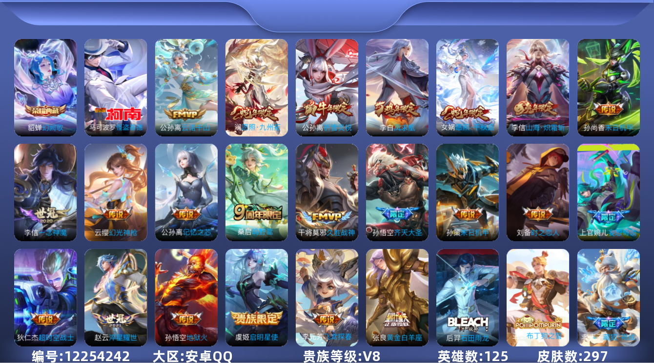 [12254242]【商品标题】:安卓Q-V8-最强王者段位-125英雄-296皮肤-1典藏-0珍品无双-0无双-1珍品传说-22传说-93史诗