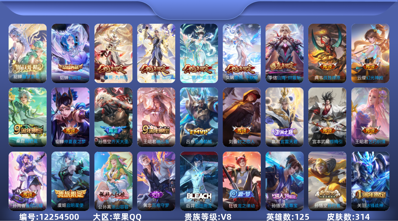 [12254500]V8 1典藏 1珍品无双 18传说 125英雄 314皮肤 可修改实名 优质装备:馥梦繁花,幻阙歌(貂蝉典藏),仲夏夜之梦(大飞蛾),乞巧织情,时之恋人-刘备(电焊工),音你闪耀(rap皮),山海·炽霜斩(李信年限),惊梅引,玄雷天君,涂山容容 传说皮:典韦战鼓燎原,幻光神枪 珍宝阁皮:优雅恋人,蔷薇恋人,女武神 限定皮:愿照·九州拓(澜年限),愿照·山河定(司空震年限),愿照·众生和(妲己年限),愿照·千秋盛(女娲年限),逐霄战戟,映山客,陌上桑,鸣野蒿,至尊宝,时之彼端,飞衡(韩信年限),高山流水,齐天大圣,怒海麟威,五谷丰年,冰锋战神,梁祝,李小龙,默契交锋-花木兰,孙行者,猪悟能 史诗皮:飞车小橘子,器灵·浮梦炉,化蝶舞,星界战将,谪仙醉月,龙之律动,石田雨龙,茶境仙,怒海争锋,炽弈燎原,撼地雄心,破空之剑,芈月浮光幕影,蔬乡物语(鲁班七号),百相守梦-百里守约,星界特工,百相守梦-黄忠,紫霞仙子,苍穹之光,电玩小子(小书包),黄金分割率,特工魅影,千年之狐,永昼,江河有灵,百解令(蒙犽),蒙恬荣光圣徽,匿光破解者,冰冠公主,偶像歌手,晚萤,电玩·爆裂旋风,暗夜猫娘,末日机甲-吕布,猫狗日记-孙策,猫狗日记-大乔,乱世虎臣,节奏热浪,修罗,女仆咖啡,摇滚巨星,水果甜心,绅士熊喵,天才门将,星夜王子,心灵骇客,功夫厨神,德古拉伯爵,暗隐猎兽者,幽灵船长,鬼剑武藏,心灵战警,天秀·启明,舞动绿茵,地狱岩魂,纤云弄巧,拒霜思,缤纷独角兽,乘风破浪,逐浪之夏,水晶猎龙者,曙光守护者,箭羽风息,唤灵魅影,金属风暴,圣诞狂欢,圣诞恋歌,鹰眼统帅,暗夜贵公子,魅力维加斯,赏金猎手,天秀·音浪,无心,未来纪元-赵云