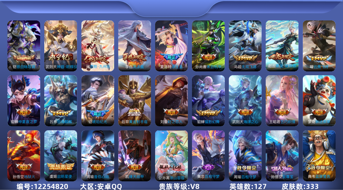 [12254820]V8 1典藏 1无双 20传说 127英雄 333皮肤 典藏英雄武则天 可修改实名 优质装备:银白咏叹调(倪克斯侍卫),神器·明辉仪,黄金射手座,云鹰飞将(小将军),绛天战甲(鸡嘴战神),猫影幻舞,末日机甲-孙尚香(绿蚂蚱),地狱火,仲夏夜之梦(大飞蛾),海洋之心,音你心动-周瑜,胖达荣荣,乞巧织情,时之恋人-刘备(电焊工),无双飞将,神器·明辉仪,浮生妄,琥珀纪元铠,涂山容容 传说皮:乘龙·铭钟鼎(赵云年限) 珍宝阁皮:蔷薇恋人 限定皮:愿照·九州拓(澜年限),至尊宝,凤求凰(白切鸡),白晶晶,神威(电光马子),飞衡(韩信年限),遇见飞天,怒海麟威,冰锋战神,游园惊梦,天狼狩猎者,逐梦之翼,李小龙,逐梦之影,朱雀志(守约年限),青春决赛季,冰霜恋舞曲,山海·玄木吟(马可年限) 史诗皮:器灵·浮梦炉,琥珀纪元伽罗,星界战将,百相守梦-周瑜,百相守梦-黄忠,蔬乡物语(鲁班七号),紫霞仙子,苍穹之光,电玩小子(小书包),黄金分割率,特工魅影,千年之狐,百解令(蒙犽),无限星赏官,晚萤,偶像歌手,龙骑士(小龙虾),暗夜猫娘,末日机甲-吕布,猫狗日记-孙策,猫狗日记-大乔,时之恋人-孙尚香,乱世虎臣,节奏热浪,修罗,女仆咖啡,摇滚巨星,水果甜心,天才门将,星夜王子,心灵骇客,功夫厨神,德古拉伯爵,暗隐猎兽者,幽灵船长,鬼剑武藏,心灵战警,舞动绿茵,地狱岩魂,诗语江南,拒霜思,缤纷独角兽,乘风破浪,逐浪之夏,水晶猎龙者,曙光守护者,箭羽风息,金属风暴,原初追逐者,圣诞狂欢,圣诞恋歌,鹰眼统帅,魅力维加斯,黎明之约,赏金猎手,未来纪元-赵云