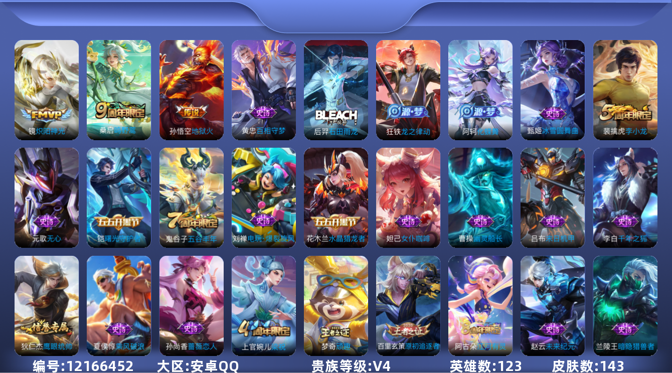 [12166452]V4 3传说 123英雄 143皮肤 可修改实名 优质装备:炽阳神光,地狱火 珍宝阁皮:蔷薇恋人,女武神 限定皮:逐霄战戟,鸣野蒿,高山流水,五谷丰年,梁祝,李小龙 史诗皮:化蝶舞,龙之律动,石田雨龙,百相守梦-黄忠,星界战将,千年之狐,江河有灵,蒙恬荣光圣徽,电玩·爆裂旋风,末日机甲-吕布,猫狗日记-孙策,乱世虎臣,女仆咖啡,水果甜心,天才门将,功夫厨神,暗隐猎兽者,幽灵船长,鬼剑武藏,舞动绿茵,乘风破浪,逐浪之夏,水晶猎龙者,曙光守护者,金属风暴,原初追逐者,圣诞狂欢,鹰眼统帅,魅力维加斯,黎明之约,无心,未来纪元-赵云1