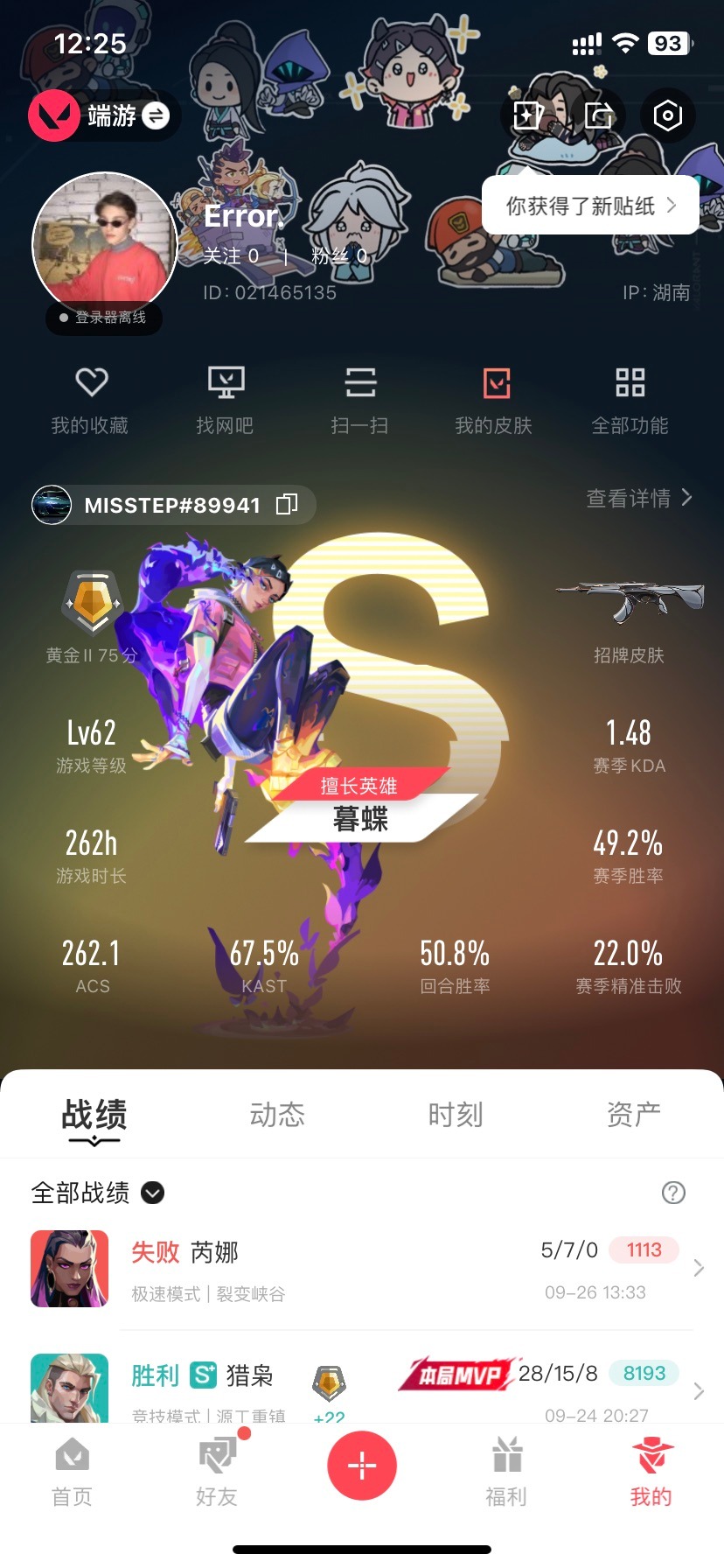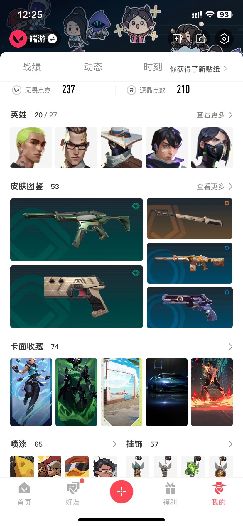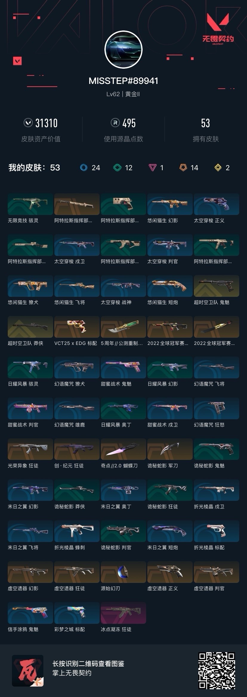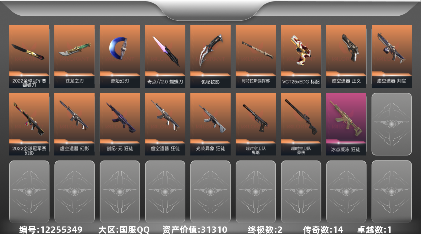 [12255349]14橙皮 2金皮 1紫皮 53皮肤 20英雄 74卡面 495已用源晶 黄金 优质装备:狂徒-冰点凝冻,蝴蝶刀-奇点//2.0,源始幻刃,诡秘蛇影,苍龙之刃,阿特拉斯指挥部 亮点皮肤:幻影-2022全球冠军赛,2022全球冠军赛 蝴蝶刀 套装:2022全球冠军赛,虚空遗器 佩枪皮肤:标配-VCT25xEDG,鬼魅-超时空卫队,正义-虚空遗器 霰弹枪皮肤:判官-虚空遗器 步枪皮肤:幻影-虚空遗器,狂徒-创·纪元,狂徒-虚空遗器,狂徒-光荣异象 狙击枪皮肤:莽侠-超时空卫队