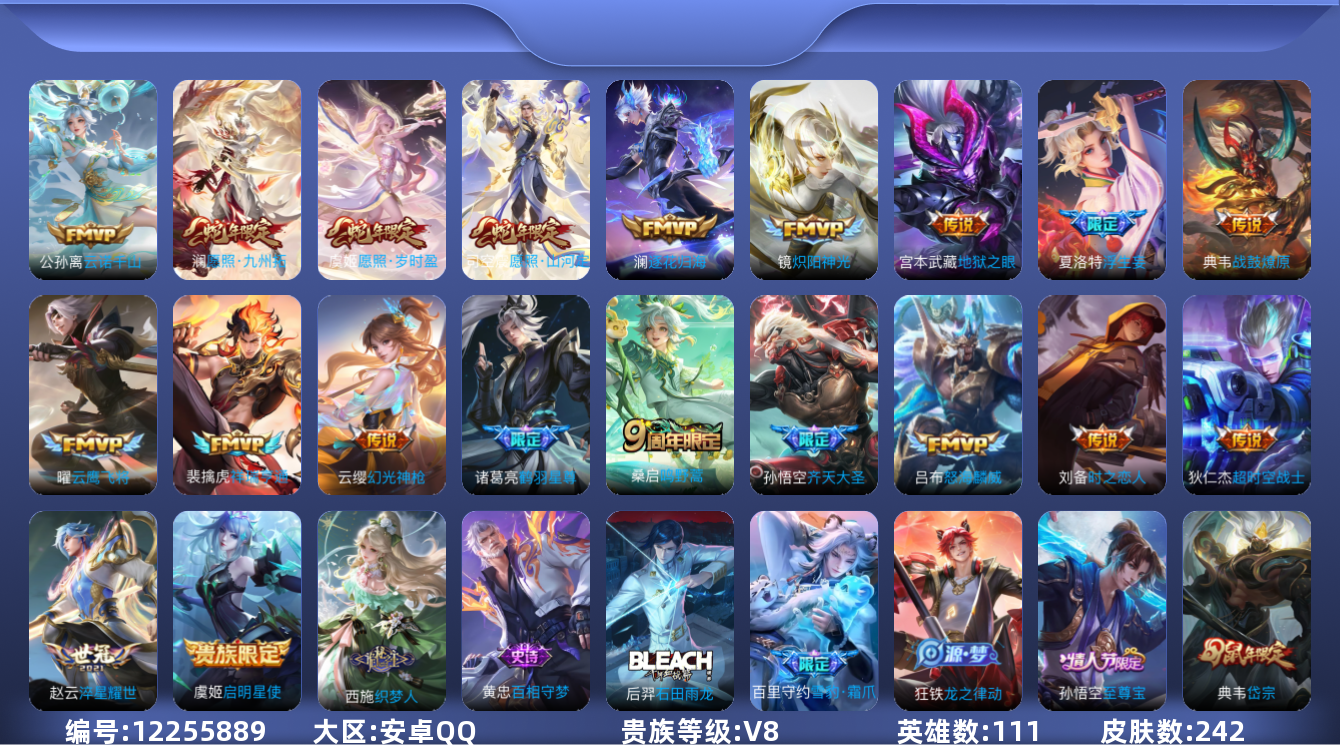 [12255889]V8 20传说 111英雄 242皮肤 可修改实名 优质装备:云鹰飞将(小将军),炽阳神光,地狱之眼,时之恋人-刘备(电焊工),淬星耀世,超时空战士-狄仁杰,浮生妄,鹤羽星尊,澜逐花归海 传说皮:典韦战鼓燎原,云诺千山,祥瑞亨通,幻光神枪 珍宝阁皮:妄想食味 限定皮:愿照·九州拓(澜年限),愿照·岁时盈(虞姬年限),愿照·山河定(司空震年限),逐霄战戟,鸣野蒿,至尊宝,傲雪梅枪,白晶晶,神威(电光马子),飞衡(韩信年限),齐天大圣,怒海麟威,岱宗(典韦年限),李小龙,默契交锋-花木兰,百木心枪,山海·玄木吟(马可年限) 史诗皮:器灵·浮梦炉,绮世丹青,瑰影绮梦,化蝶舞,龙之律动,雪豹·霜爪,石田雨龙,茶境仙,破空之剑,琥珀纪元伽罗,蔬乡物语(鲁班七号),超元猎域,百相守梦-百里守约,星界特工,百相守梦-黄忠,织梦人,紫霞仙子,电玩小子(小书包),黄金分割率,特工魅影,千年之狐,永昼,江河有灵,匿光侦查者,魅语,百解令(蒙犽),高渐离燃音魔法,冰冠公主,偶像歌手,暗夜猫娘,猫狗日记-孙策,乱世虎臣,节奏热浪,修罗,女仆咖啡,摇滚巨星,水果甜心,绅士熊喵,星夜王子,德古拉伯爵,暗隐猎兽者,幽灵船长,鬼剑武藏,暗渊魔法,心灵战警,天秀·启明,地狱岩魂,纤云弄巧,逐浪之夏,月团寄思,水晶猎龙者,曙光守护者,金属风暴,圣诞狂欢,鹰眼统帅,魅力维加斯,赏金猎手,天秀·音浪,无心,未来纪元-赵云