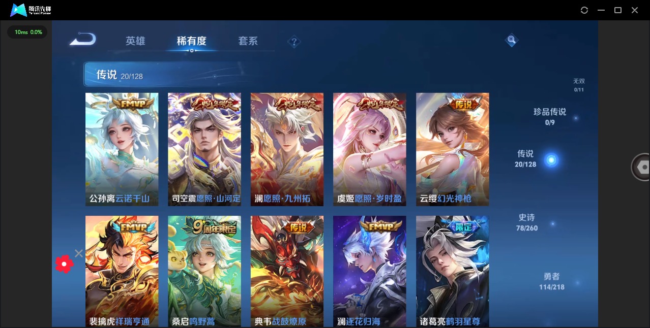 - [11314692]V5 4传说 75英雄 61皮肤 可修改实名 优质装备:猫影幻舞,澜逐花归海 传说皮:云诺千山 限定皮:逐霄战戟,鸣野蒿 史诗皮:龙之律动,百相守梦-黄忠,无限星赏官,女仆咖啡,水果甜心,未来纪元-赵云