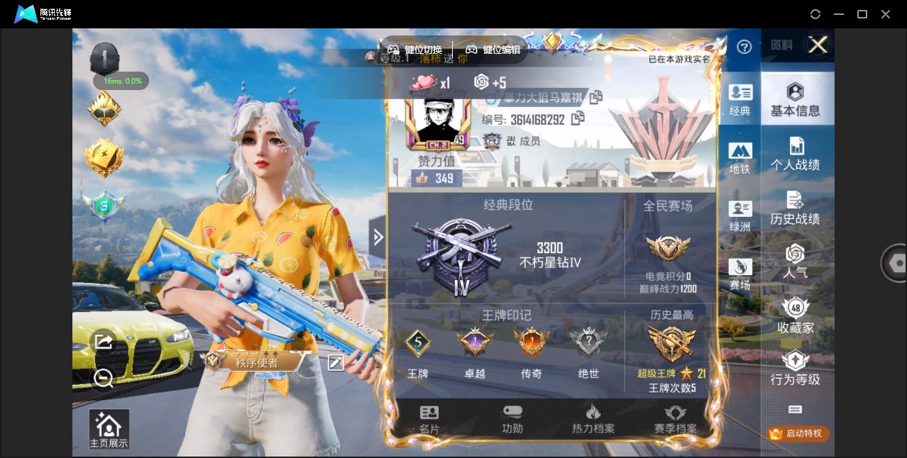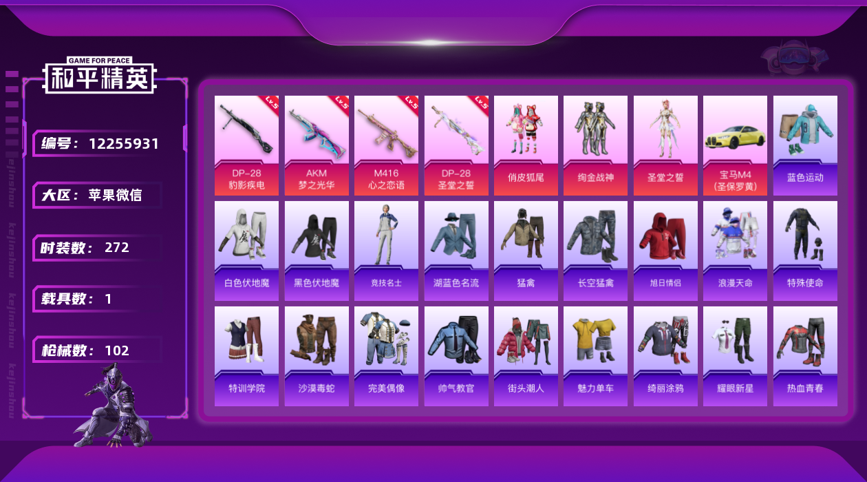 [12255931]3粉装 4特效枪 1载具 5印记 可二次 可修改实名 优质装备:宝马M4(圣保罗黄),M416心之恋语,绚金战神,俏皮狐尾,AKM梦之光华,DP-28圣堂之誓 热门装扮:圣堂之誓 稀有枪皮:DP-28-豹影疾电 五级特效枪:五级M416-心之恋语,五级DP-28-豹影疾电,五级DP-28-圣堂之誓,五级AKM-梦之光华 紫色装扮:SS30特训套装,SS33特训套装,旭日情侣,SS21特训,吉莉礼服,完美偶像,帅气教官,幻世战舞者,冰川特警,SS20特训,竞技角斗士,魅力单车,鹤鸣,黑色伏地魔,龙的传人,龟仙人,龙魂突击队,香桃花海,霓虹街区,长空猛禽,街头潮人,湖蓝色名流,热血青春,探宝勇士,沙漠毒蛇,绮丽涂鸦,缤纷果语,耀眼新星,蓝色运动,特殊使命,特训学院,猛禽,王牌教练,空岛之星,白色伏地魔,福星高照,SS29特训,SS28特训,创世·追猎,青团波波,糖糖葫芦,竞技名士,惊鸿侠骨,SS24特训(SS24特训套装),SS25特训,锦衣飞扬,SS27特训,明鸳圣池,无暇誓言,浪漫天命,日照花林,晨曦薄雾,SS26特训,春光漫游,快闪甜心,贝斯之夜,骁骑迪迦,暗黑裁决,大橘大利,星渊小夜曲,星影赞美诗,SS32特训服(SS32特训套装),蓝冰羽,紫幽梦,粉恋花,弄潮海豚,金耀舞者 优质战备:圣堂之誓降落伞,拳皇·狂花道降落伞,星途旅人降落伞,彩虹甜喵降落伞,阿狸红降落伞