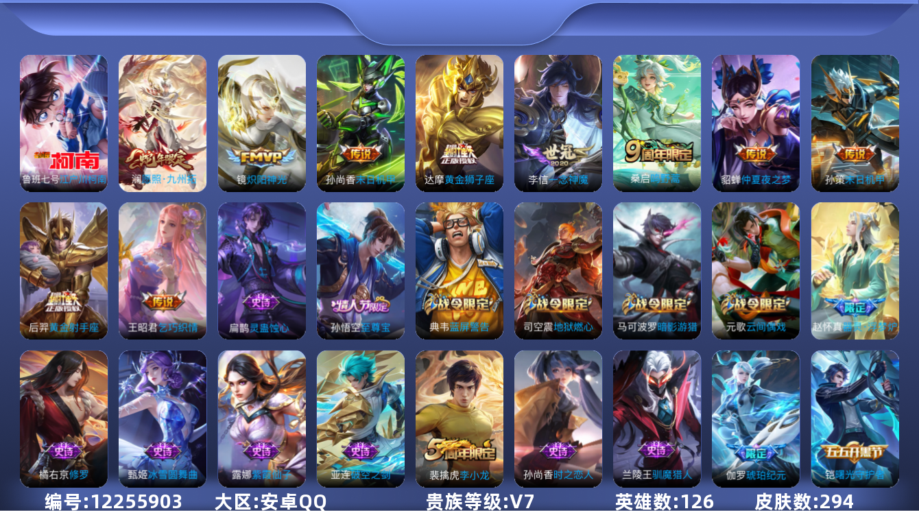 [12255903]V7 1珍品传说 10传说 126英雄 294皮肤 典藏英雄武则天 可修改实名 优质装备:江户川柯南,黄金狮子座,黄金射手座,炽阳神光,一念神魔,末日机甲-孙尚香(绿蚂蚱),仲夏夜之梦(大飞蛾),乞巧织情,末日机甲-孙策 珍宝阁皮:胡桃夹子 限定皮:愿照·九州拓(澜年限),鸣野蒿,至尊宝,五谷丰年,游园惊梦,梁祝,李小龙,百木心枪 史诗皮:器灵·浮梦炉,灵蛊蚀心,星界战将,茶境仙,破空之剑,战舞者,蒙犽顽岩魄,琥珀纪元伽罗,紫霞仙子,白龙吟,黄金分割率,特工魅影,千年之狐,江河有灵,百解令(蒙犽),高渐离燃音魔法,无限星赏官,冰冠公主,偶像歌手,白蛇,末日机甲-吕布,猫狗日记-孙策,时之恋人-孙尚香,乱世虎臣,节奏热浪,修罗,女仆咖啡,摇滚巨星,水果甜心,绅士熊喵,天才门将,星夜王子,功夫厨神,暗隐猎兽者,幽灵船长,鬼剑武藏,心灵战警,乐园奇幻夜,天秀·启明,舞动绿茵,地狱岩魂,纤云弄巧,繁星吟游(呼啦呼啦),缤纷独角兽,乘风破浪,逐浪之夏,水晶猎龙者,曙光守护者,箭羽风息,金属风暴,原初追逐者,圣诞狂欢,圣诞恋歌,鹰眼统帅,魅力维加斯,黎明之约,未来纪元-赵云