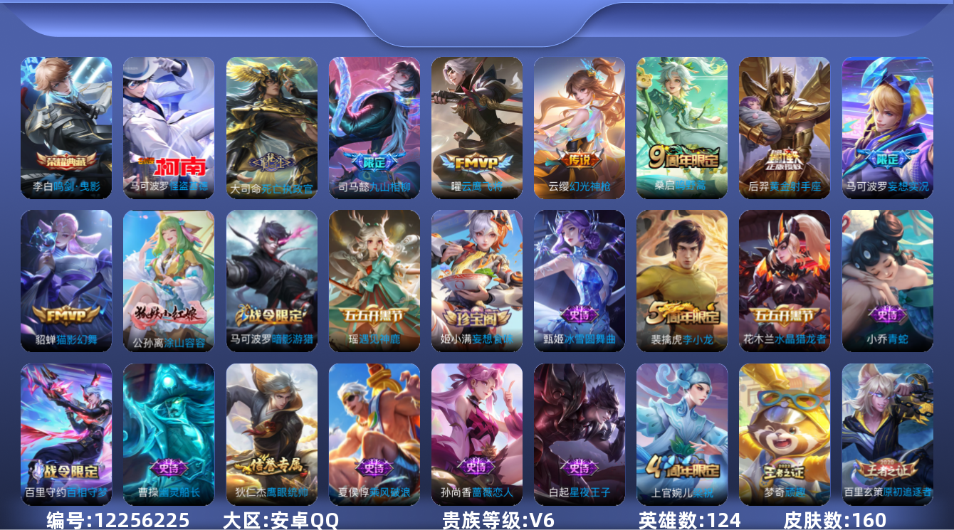 [12256225]V6 1典藏 1珍品传说 8传说 124英雄 160皮肤 可修改实名 优质装备:鸣剑·曳影,怪盗基德,黄金射手座,云鹰飞将(小将军),猫影幻舞,妄想实况,涂山容容 传说皮:死亡执政官,九山相柳,幻光神枪 珍宝阁皮:妄想食味,蔷薇恋人 限定皮:鸣野蒿,梁祝,李小龙 史诗皮:星界战将,蒙犽顽岩魄,百相守梦-百里守约,遇见神鹿,苍穹之光,江河有灵,蒙恬荣光圣徽,青蛇,偶像歌手,猫狗日记-孙策,乱世虎臣,摇滚巨星,水果甜心,星夜王子,德古拉伯爵,暗隐猎兽者,幽灵船长,鬼剑武藏,心灵战警,缤纷独角兽,乘风破浪,逐浪之夏,水晶猎龙者,箭羽风息,金属风暴,原初追逐者,圣诞狂欢,鹰眼统帅,王者之锤,魅力维加斯,黎明之约